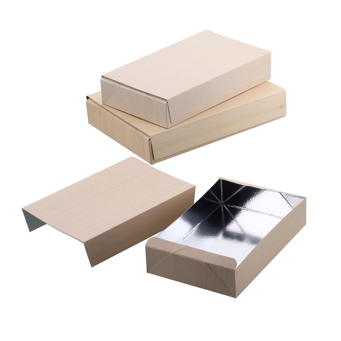 単価155.0円~側面は厚さ2mmのしっかりした素材の紙の折箱です。安心・安全なバージンパルプを使用しております。本物の木の折のような美しい木目柄も高級感があります。 -
