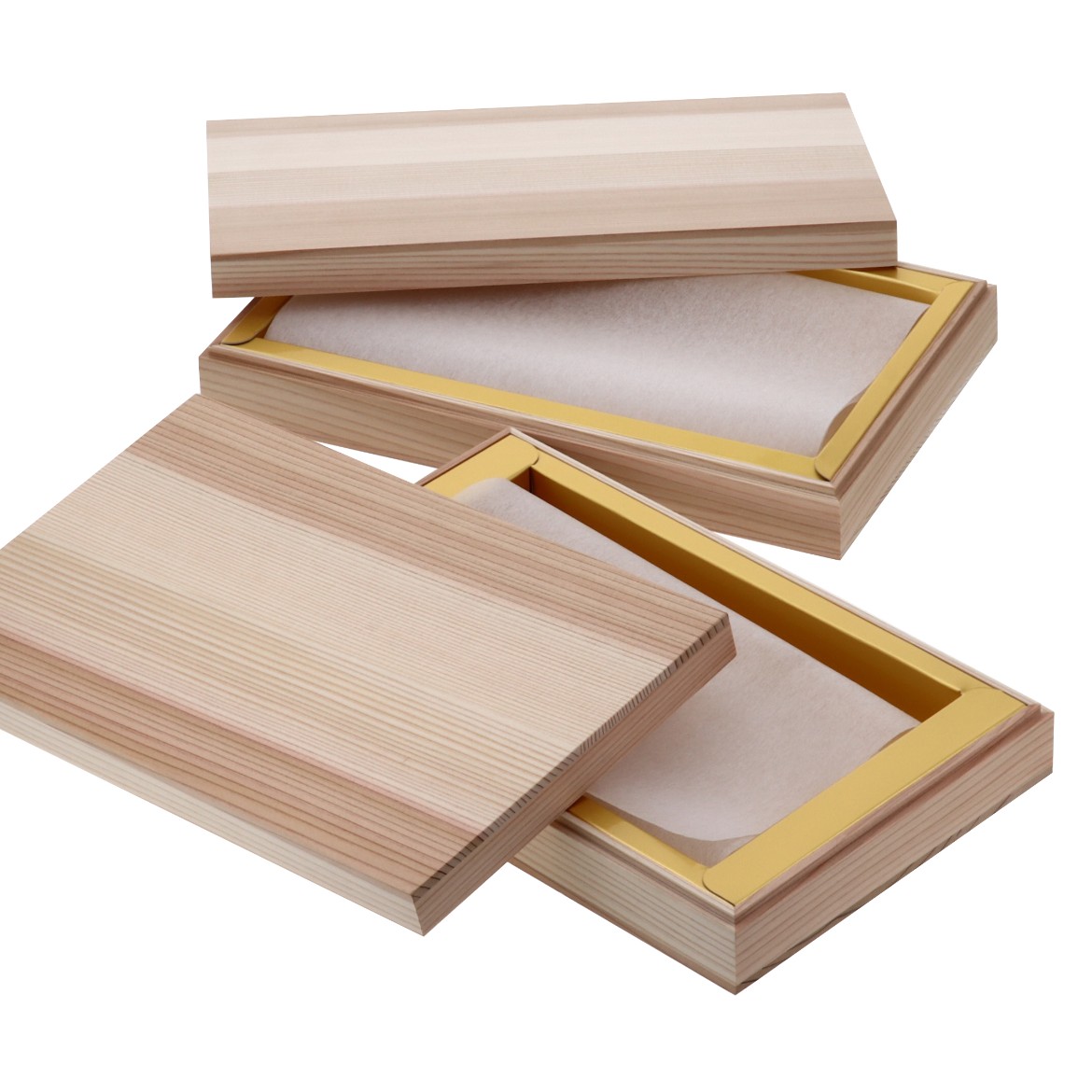 単価1,000.0円~※金台紙のみ2サイズ展開。折のサイズは同じです。 国産の秋田杉を使用した最高級の折箱をからすみサイズでご用意。 職人の手により作られ、全ての辺も丁寧に面取りし加工しています。 ぜひ手に取って感じ... -