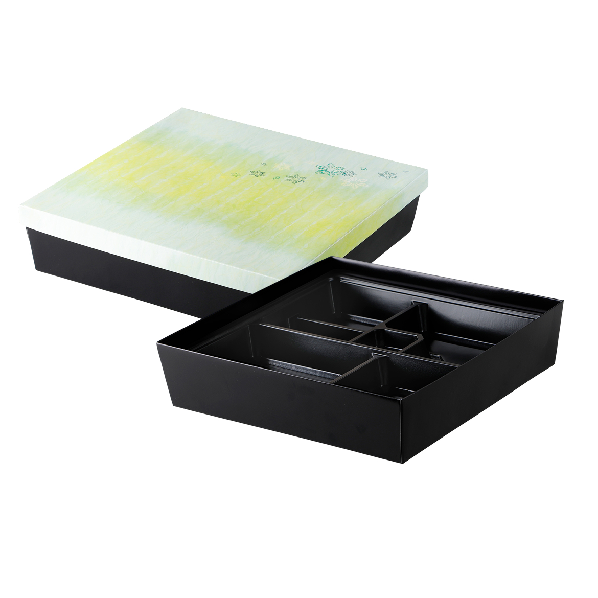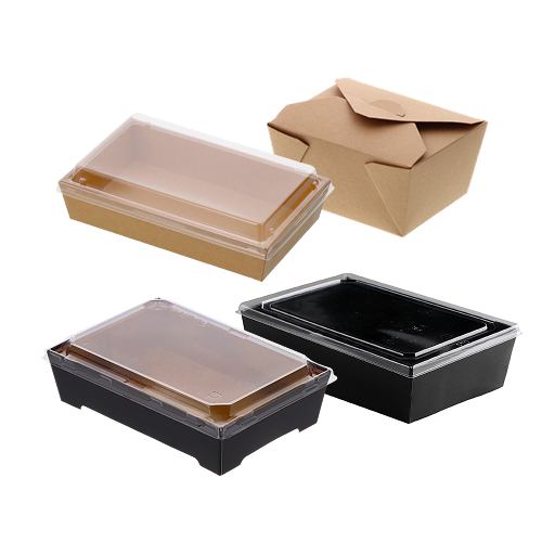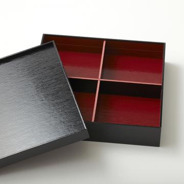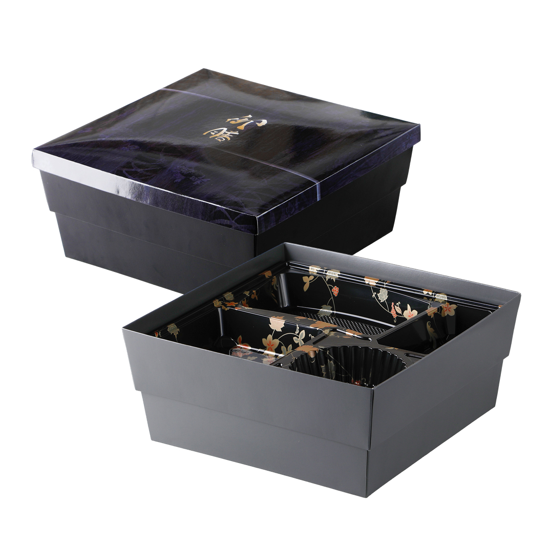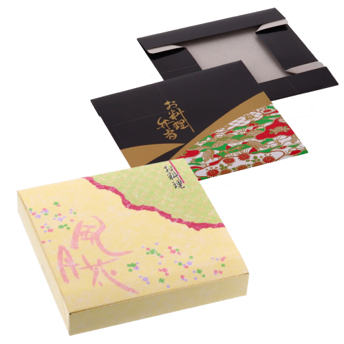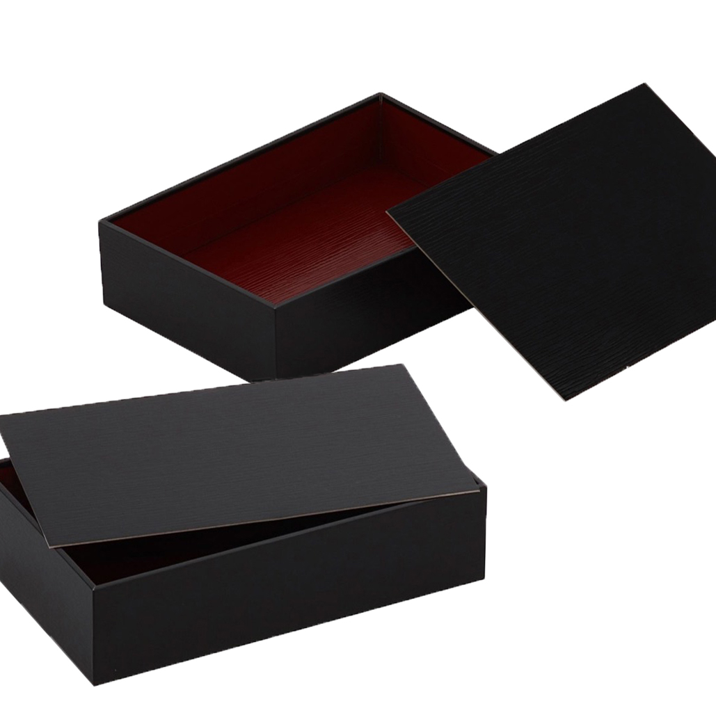 紙の折にも色々あります。折りたためて省スペースで在庫できるもの、しっかりした造りで、一見すると本物の漆器のように見えるような印刷を施したものもあります。紙独特の落ち着いた雰囲気が高級弁当、高級寿司によく合う折箱です。