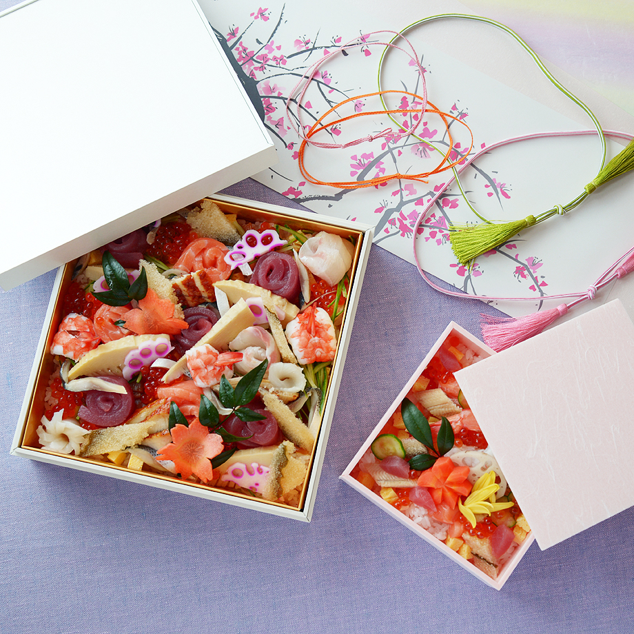 ひなまつり用の折箱に実際にちらし寿司を入れてみました。