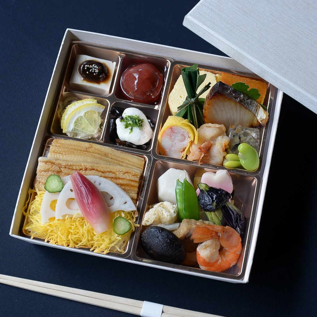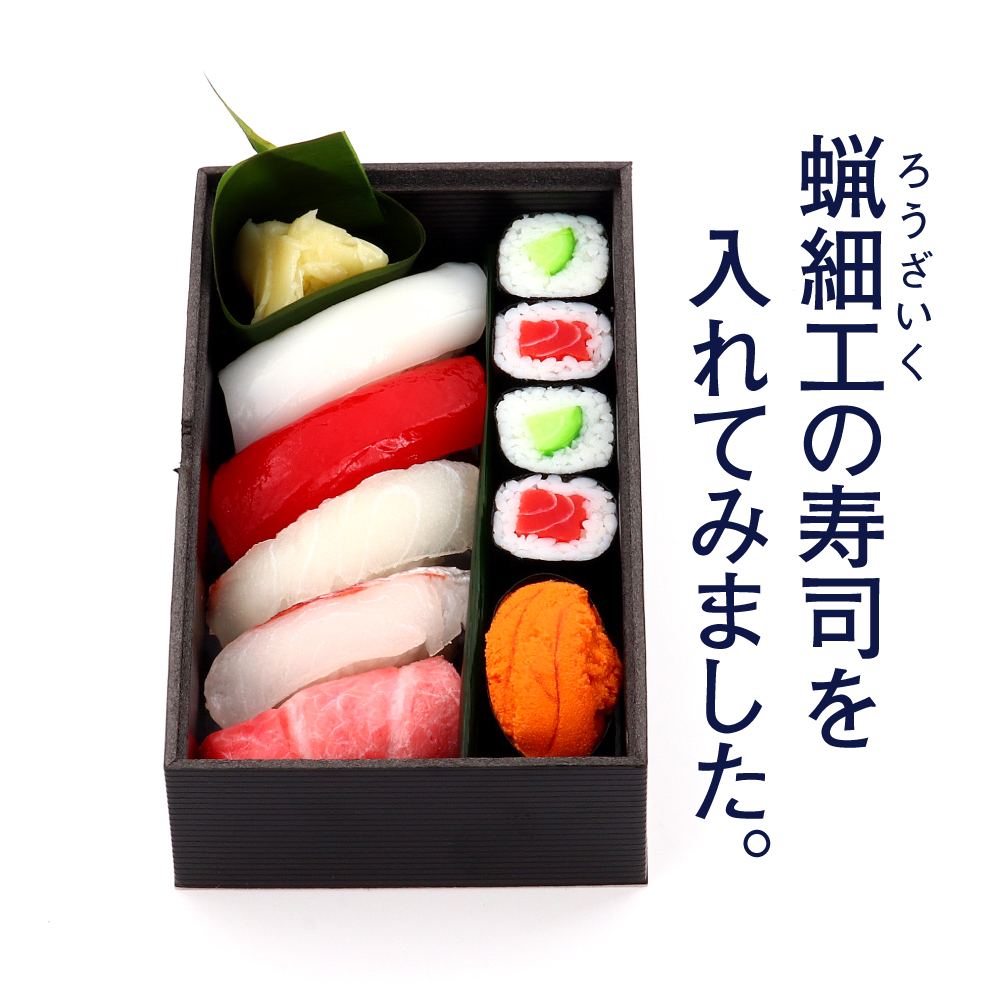 寿司の蝋細工で折のサイズ感がわかるようにしてみました。