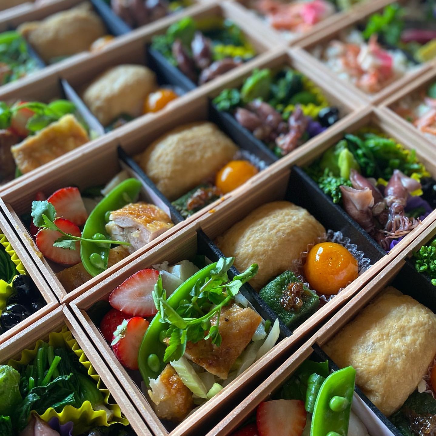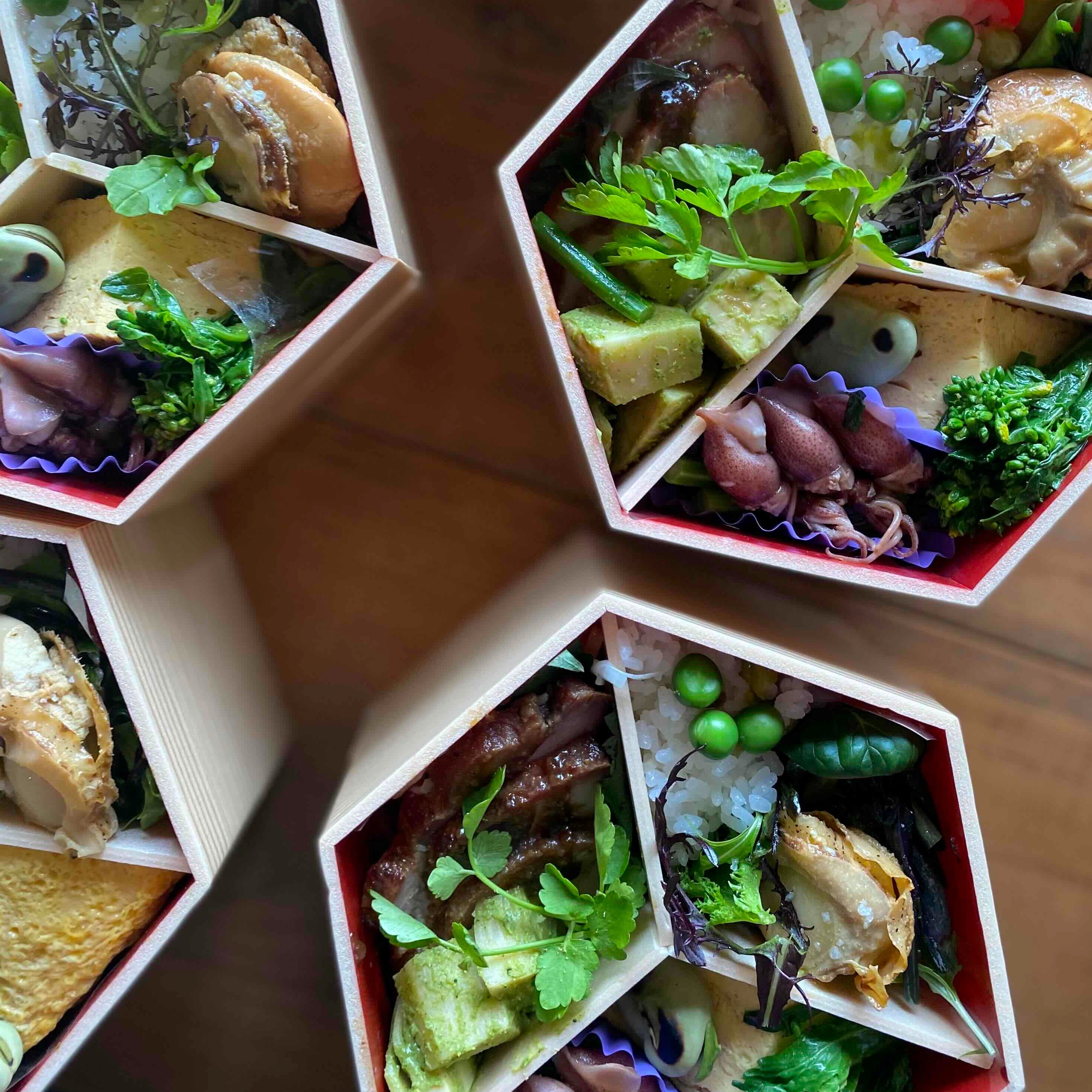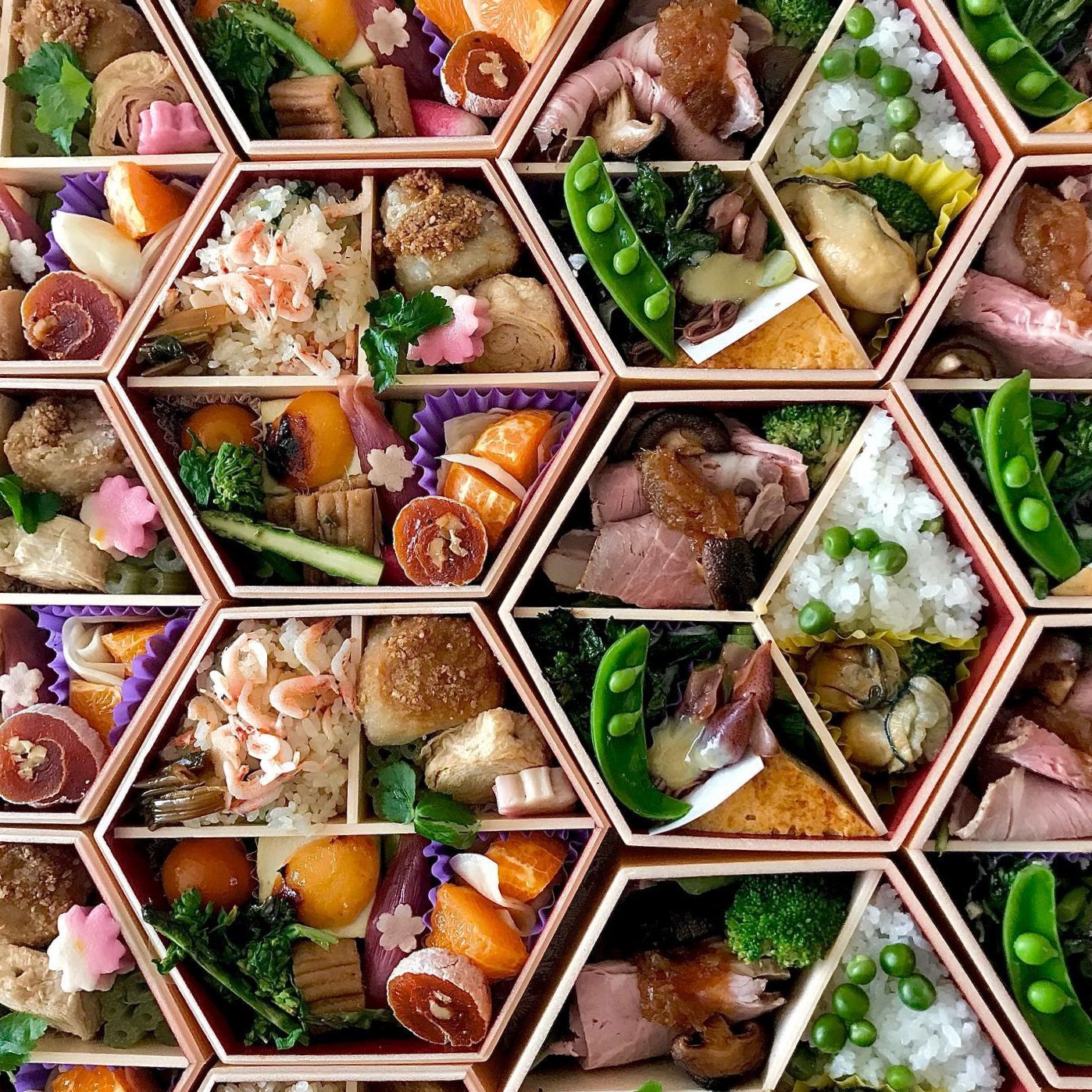 上段は均等に三分された仕切りがはめられており、下段はT字に仕切られています。小ぶりながらも、六角形で二段の折は非常にインパクトがあります。汁気のある料理を入れる際はカップやケースをご利用ください。 ...