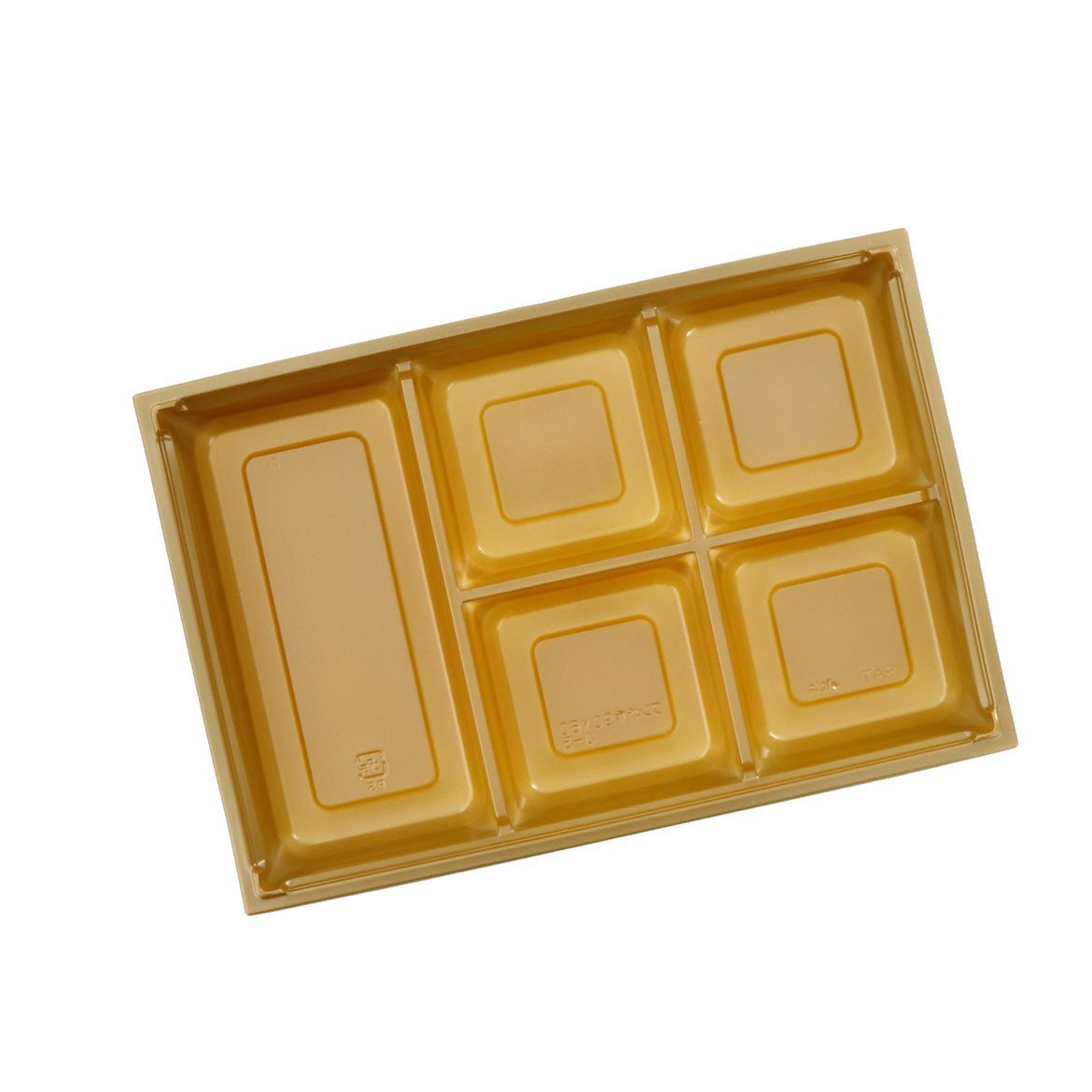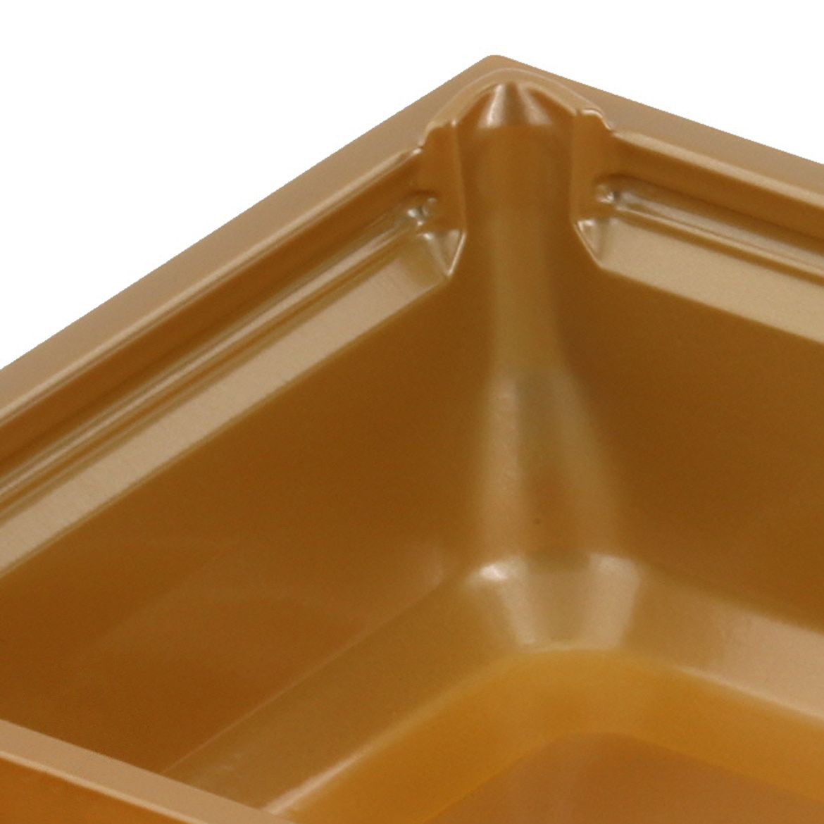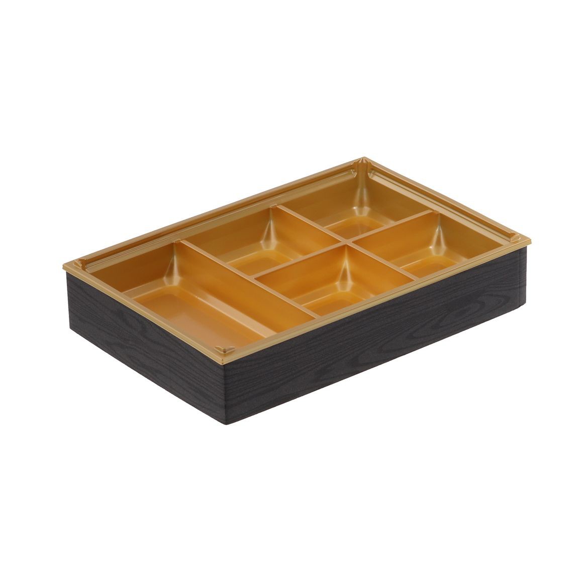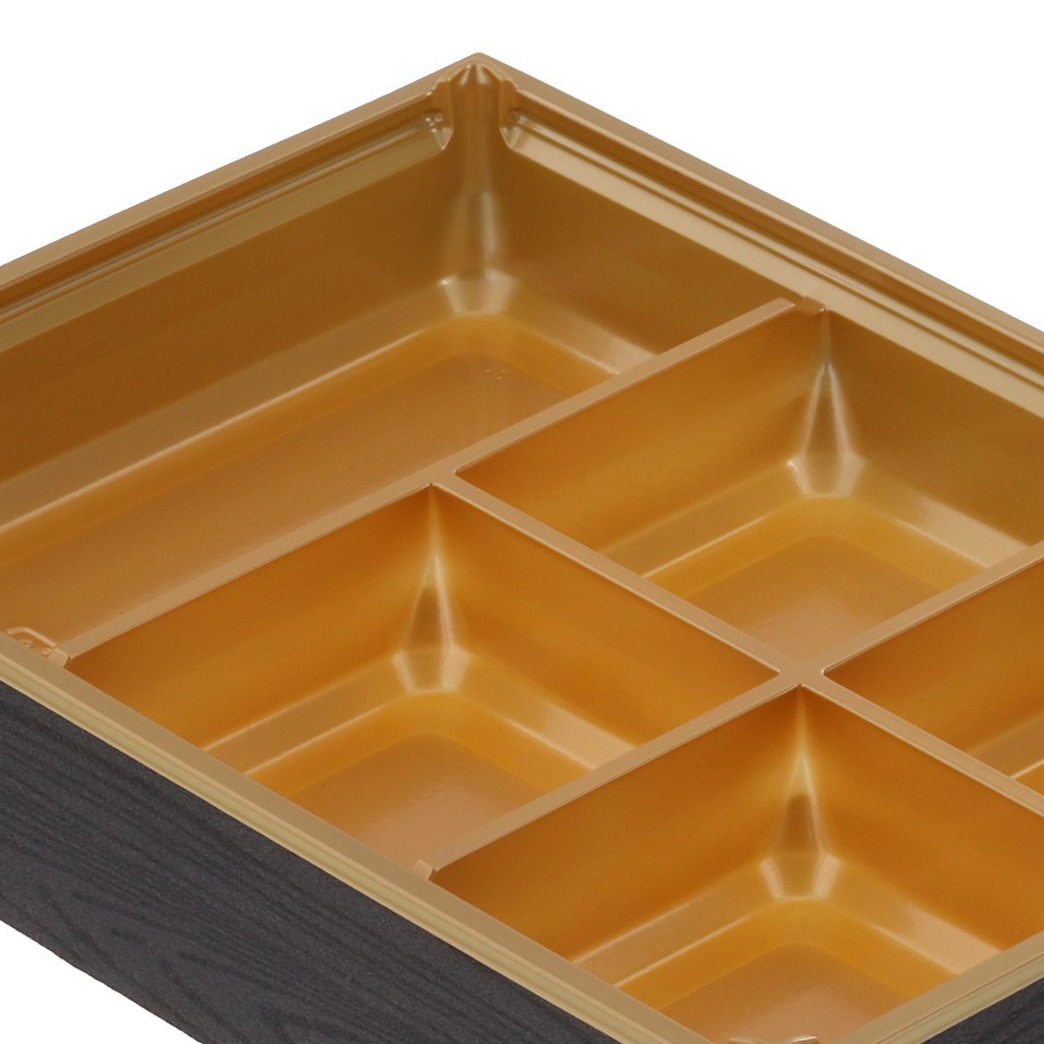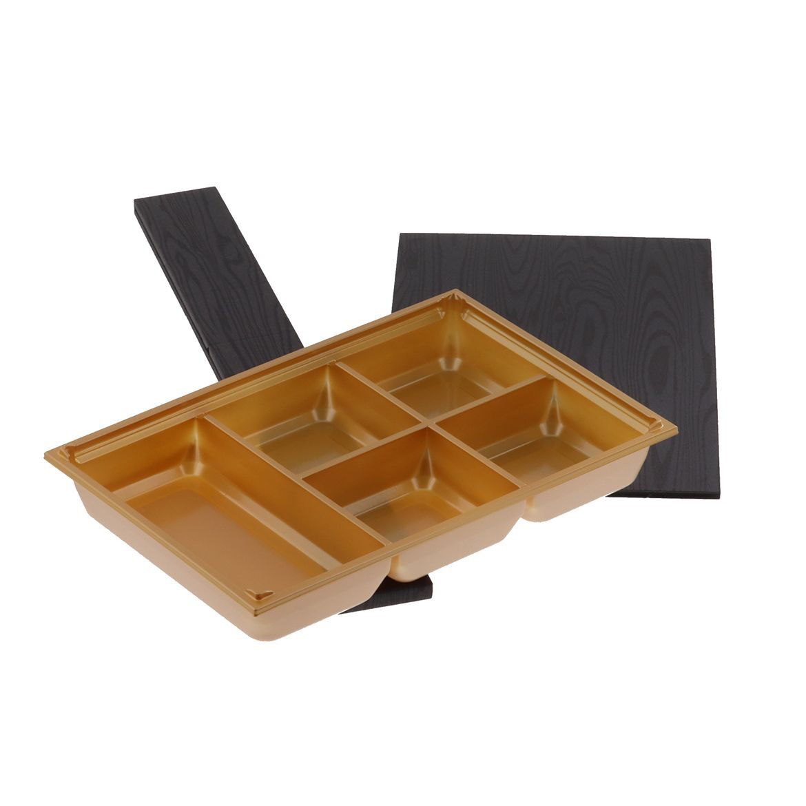 五分する仕切りが付いたトレーは内蔵されており、タレや汁が漏れにくい形状です。高級感のあるシックな外装で、オードブルやてまり寿司など一度に多くの種類を入れる際におすすめです。組み立て式のため在庫場所も抑えられます。