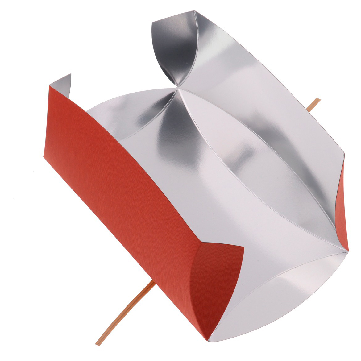 日本の伝統的な古代色である朱色が鮮やかに彩る寿司用の折箱です。箱の内側はアルミ箔になっているため、生ものや油ものにもお使いいただけます。蓋と底が一体化成型なので、収納場所をとりません。折り目に沿って折り込むことで組み立てができ、紐も付属していますのですぐにご利用いただけます。