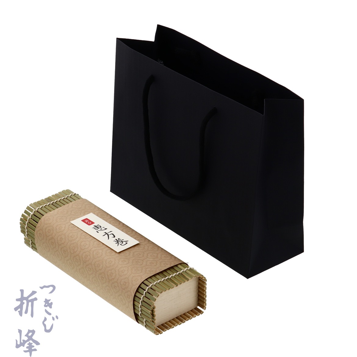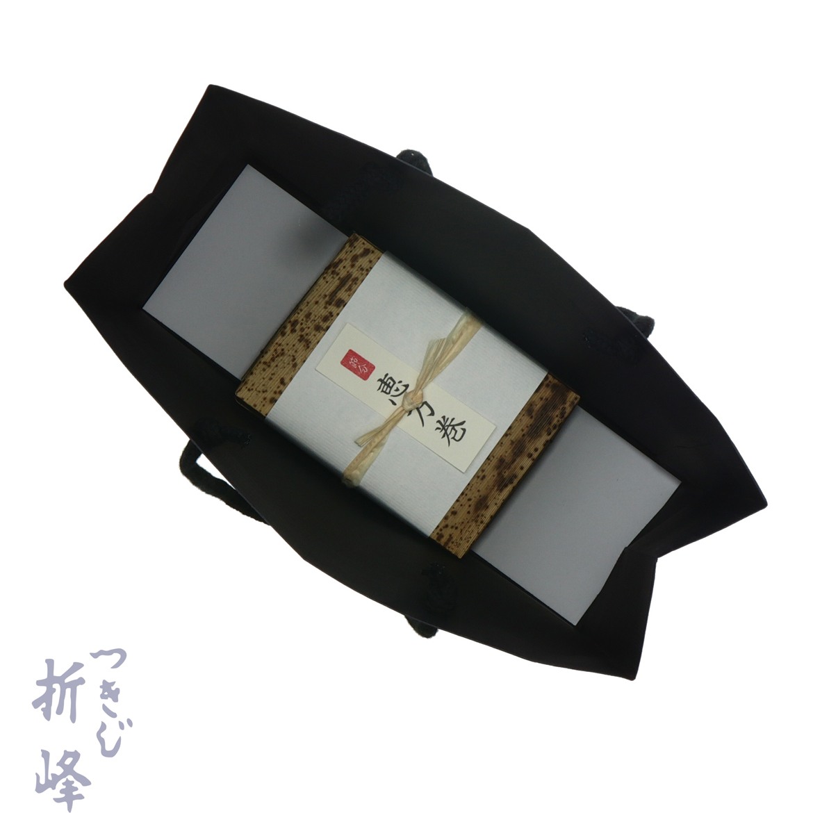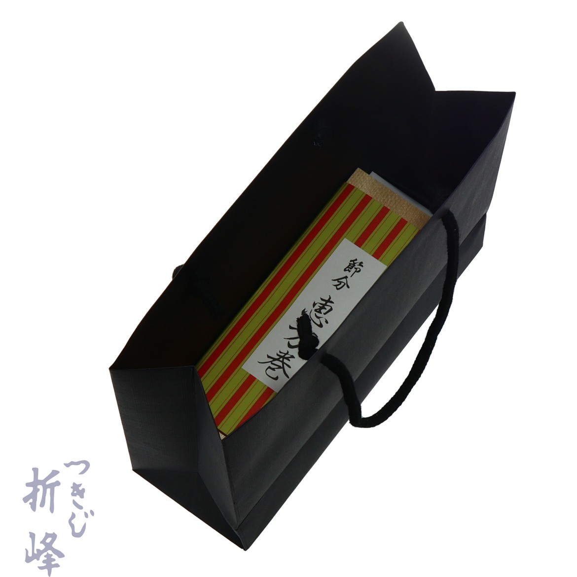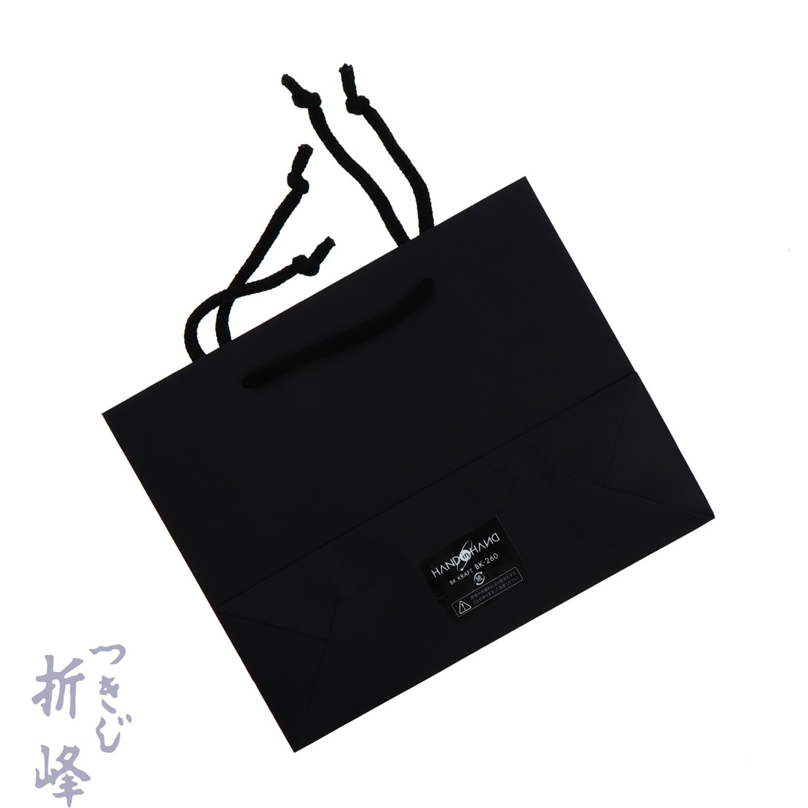 マットブラックの紙に格子柄の「エンボス加工」が施してありますので、落ち着いた感じの雰囲気があります。マチが狭く、横が長いので、太巻用の折箱など、細長いパッケージに便利な袋です。