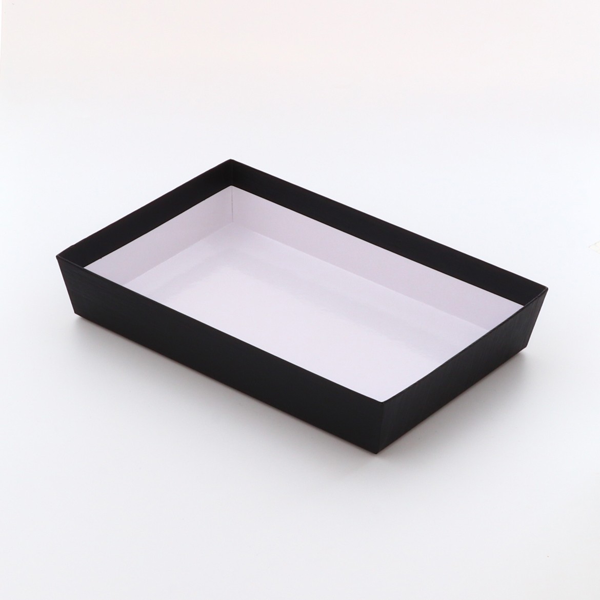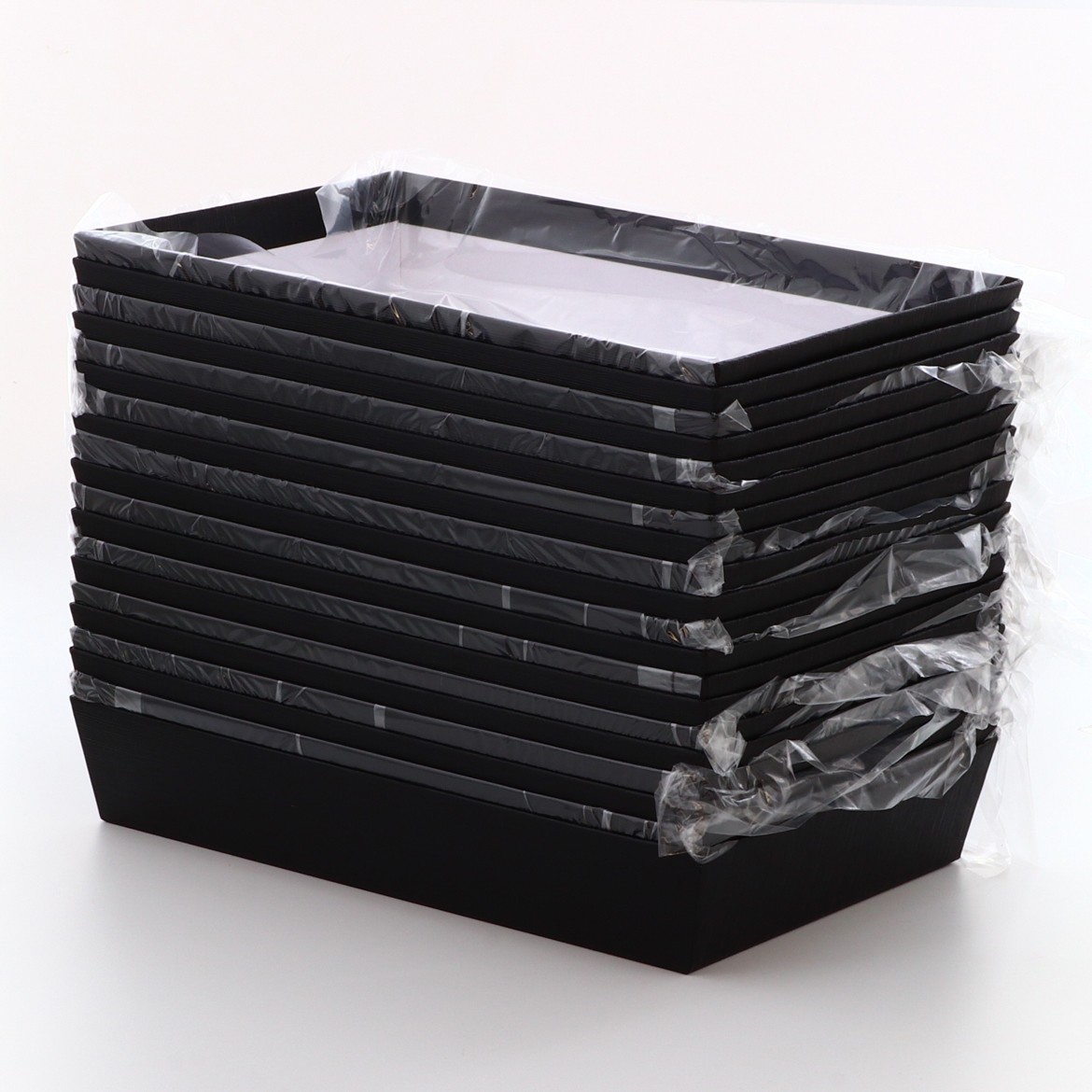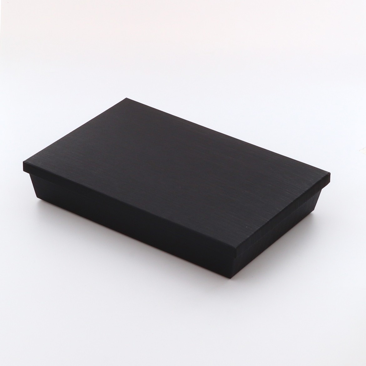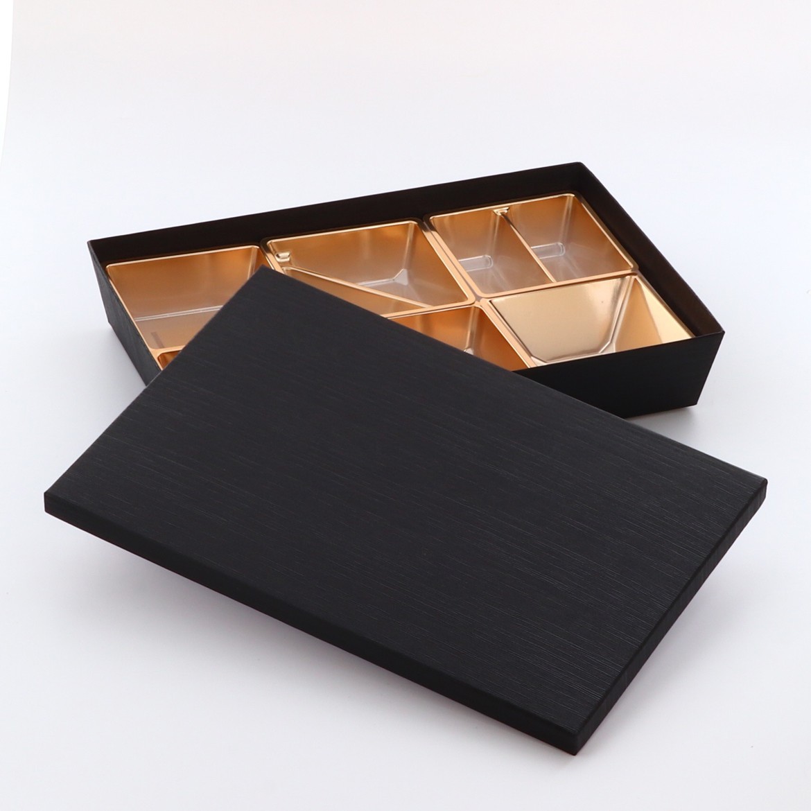 表面に質感のあるエンボス加工を施した紙を採用した、高級感がありながら価格は抑えた紙製の折箱です。本体がテーパー型で、重ねられますので在庫スペースに優しい商品です。本体には当社で販売している小鉢65が6個ピッタリ収まるサイズになっており、色々な形状の小鉢をお使い頂けますので、あらゆるメニューにご利用いただけます!
