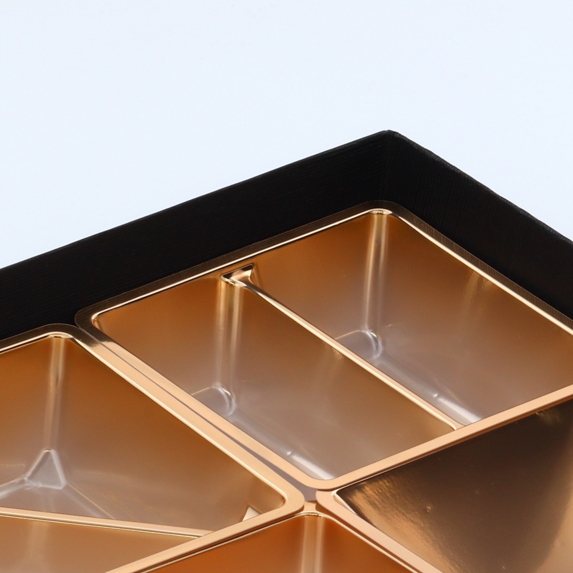 ・6枚目の画像のように、長方形の小鉢と正方形の小鉢を並べて2個使用した時に隙間なくピッタリ入る設計です。4マスを使用する場合は、7枚目の画像のように、奥から手前はピッタリですが、左右は少しだけ本体と小鉢の間に隙間が空きます。