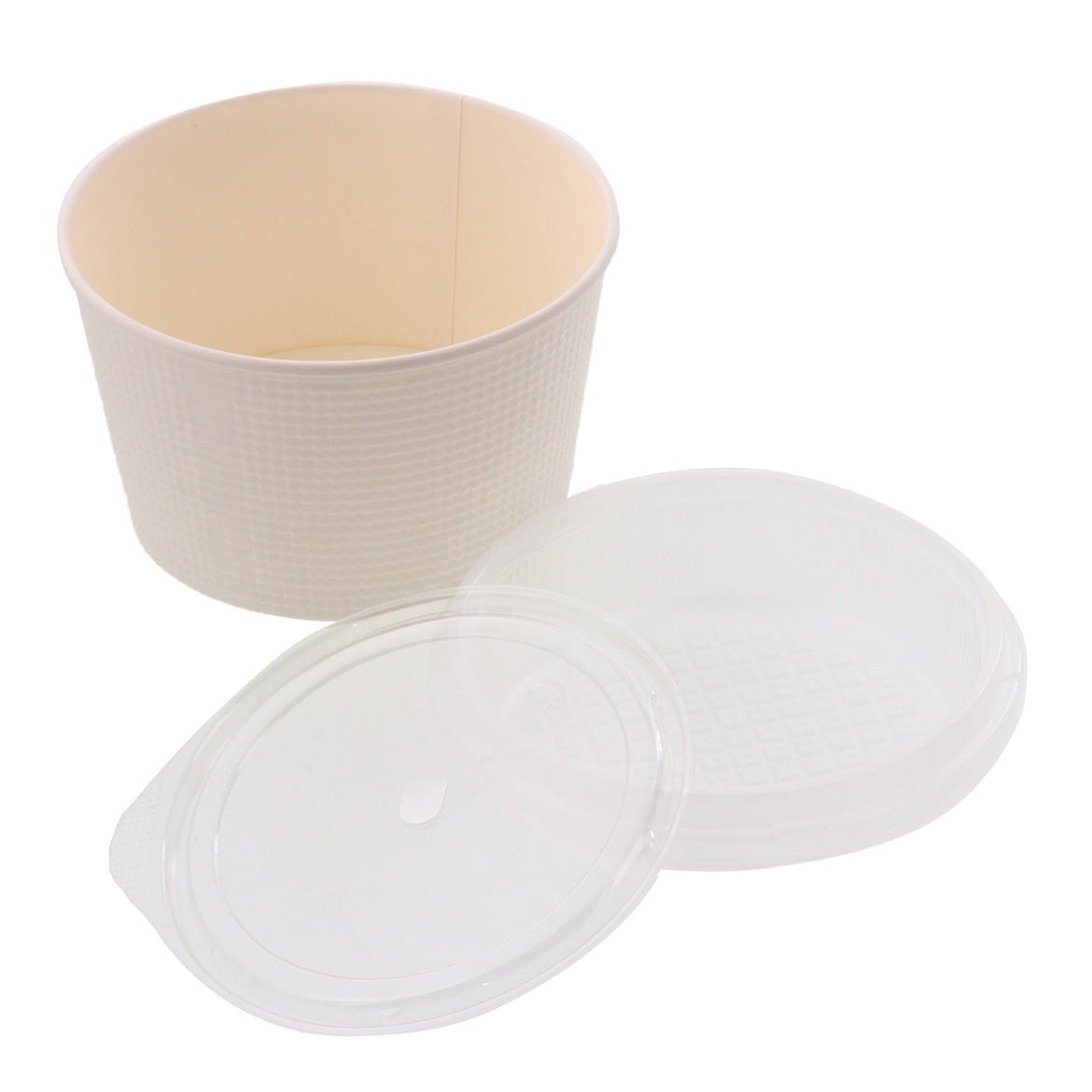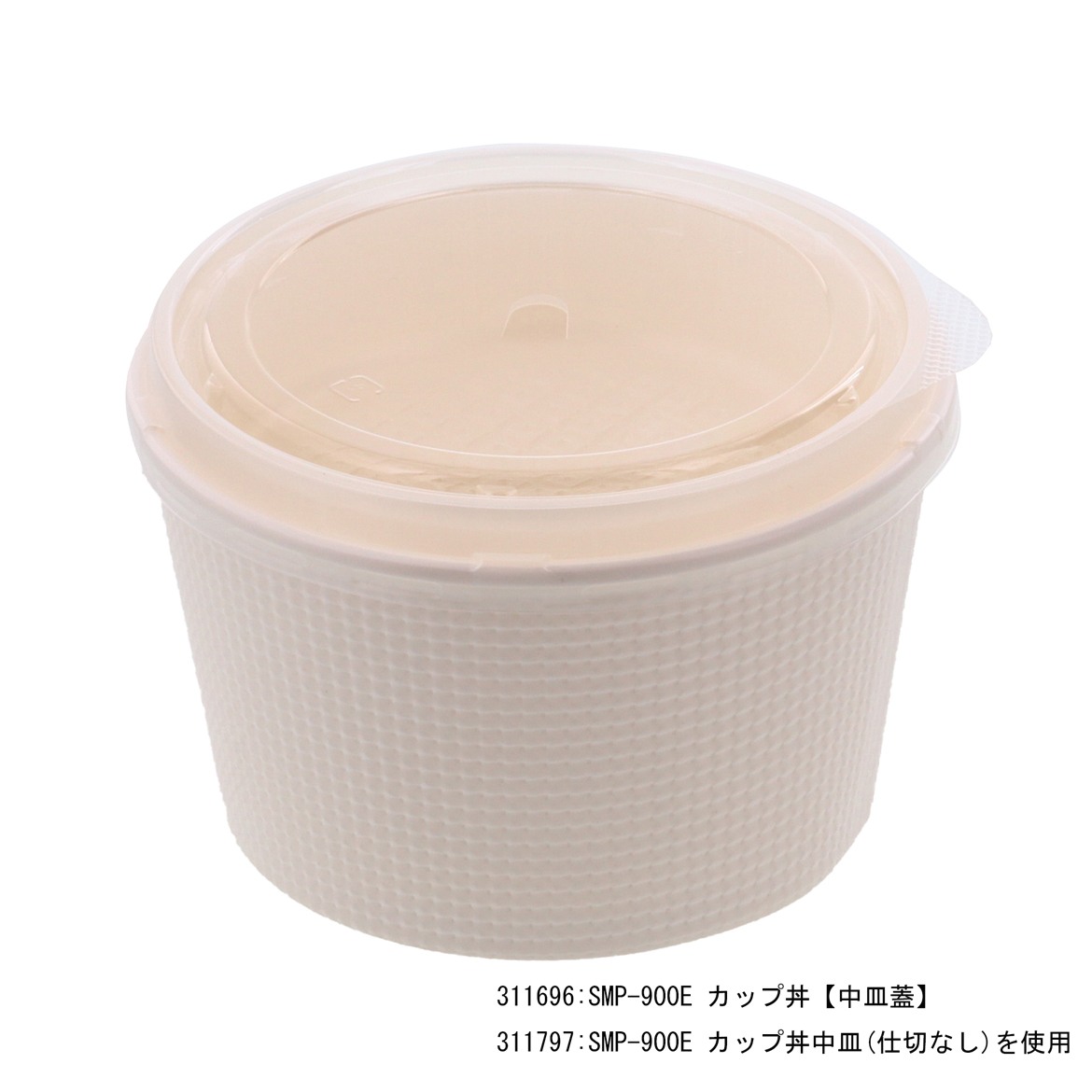 断熱性に優れていて、温かいカレーや丼ぶりなどに使いやすい容器です。また容器の口が広いため、から揚げなどの大振りのお惣菜を入れるのにもおすすめ。容量は910mlで、容器の側面には滑りにくく持ちやすいエンボス加工が施されています。また中皿を利用いただくことで、白米とル-やあんを分けたり、別の料理を盛ることも可能です。