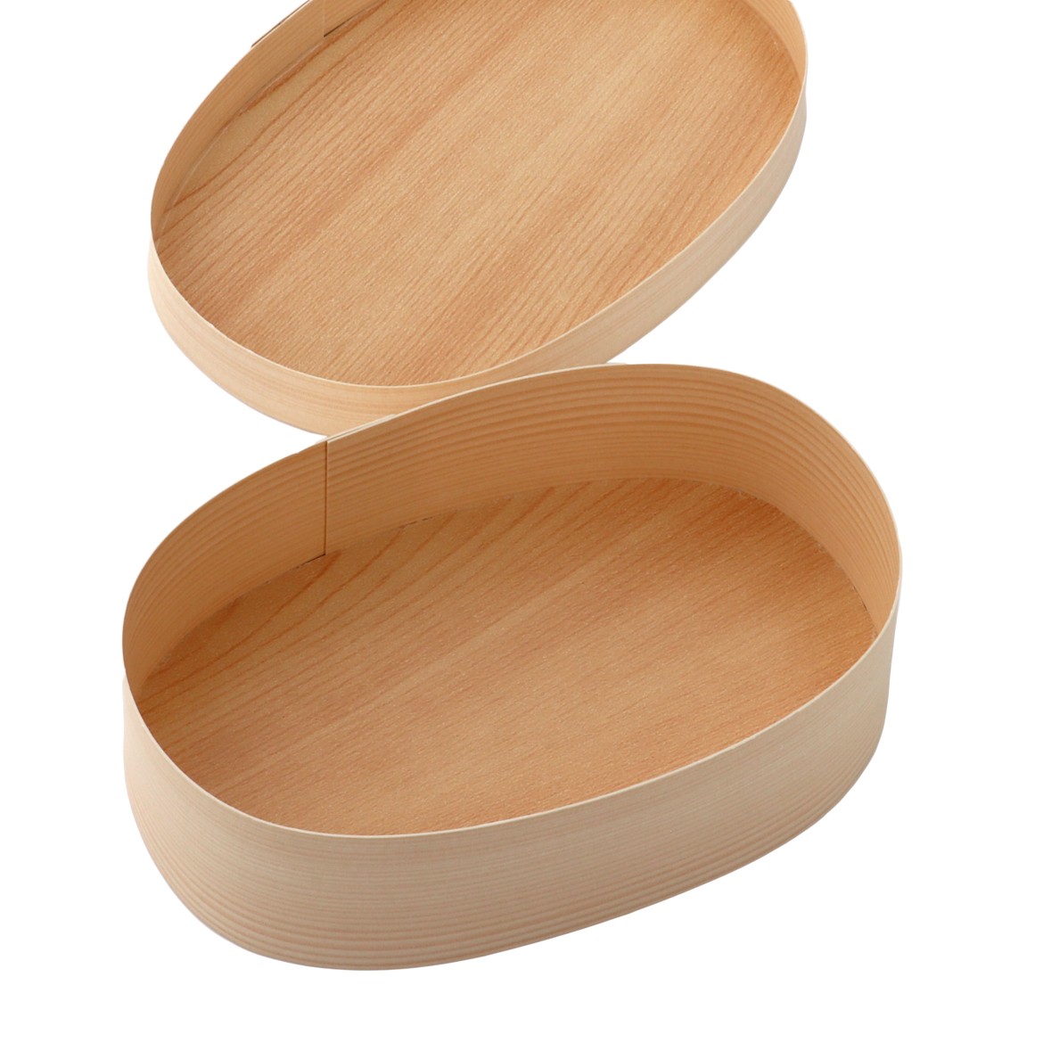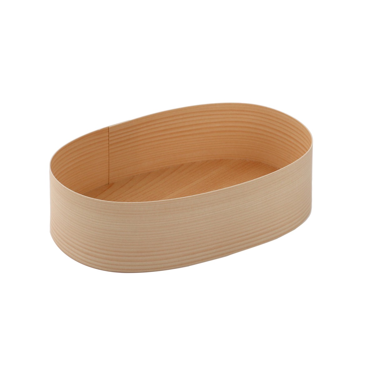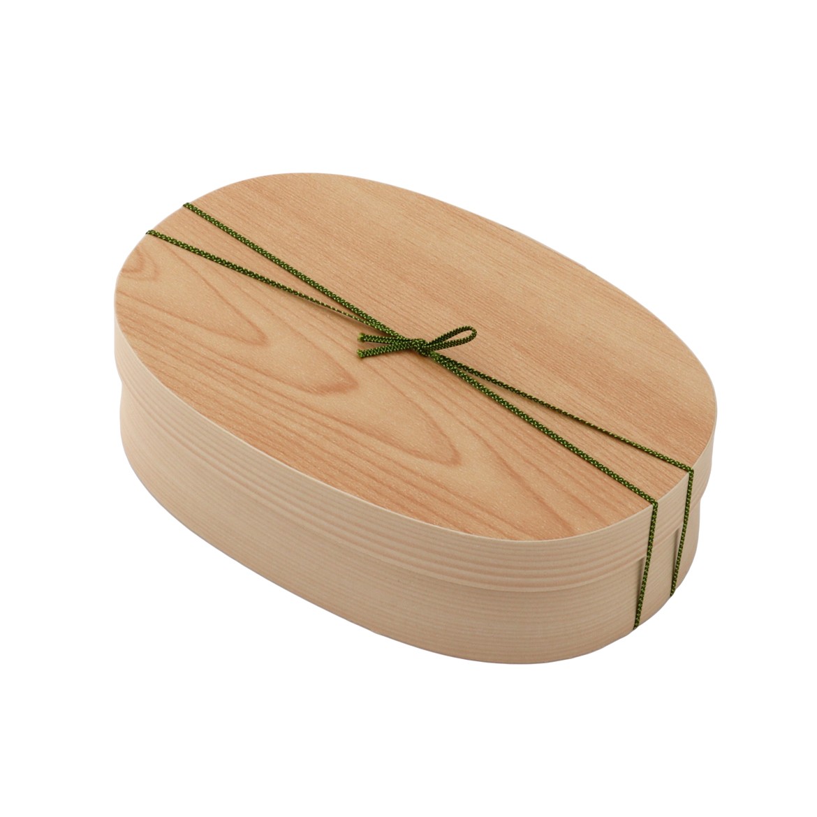 ・全て紙素材で作られた、小判型のわっぱです。素材は紙ですが、色合いや質感は、木のわっぱのような印象です。