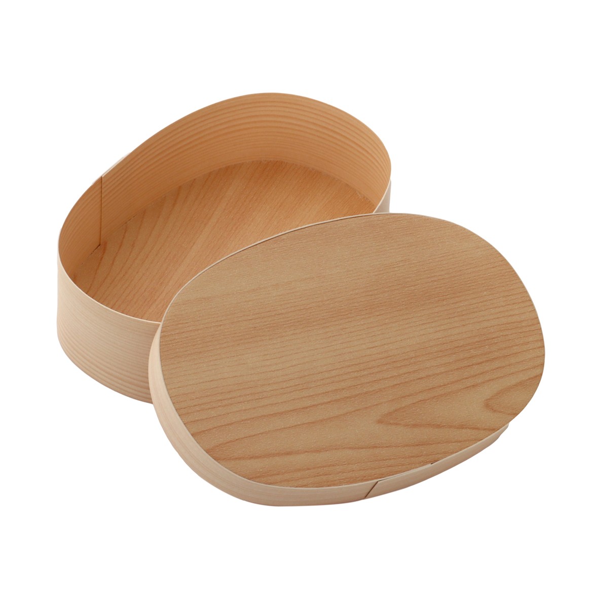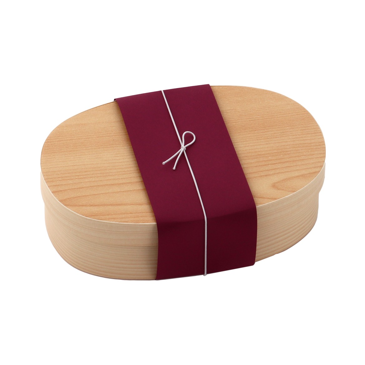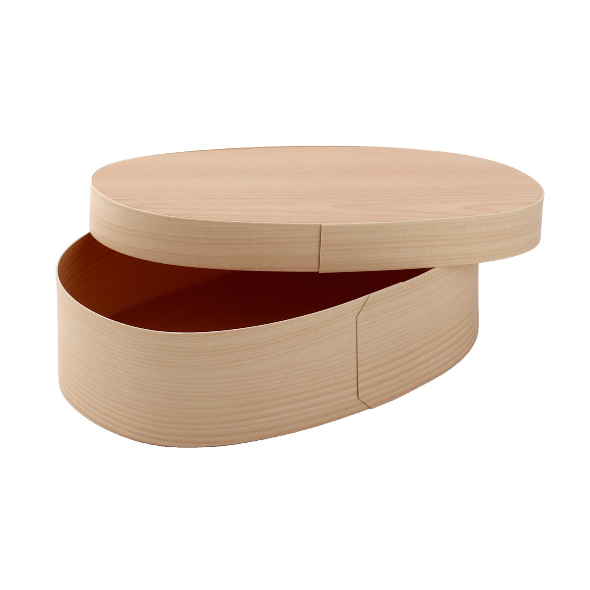 ・全て紙素材で作られた、小判型のわっぱです。素材は紙ですが、色合いや質感は、木のわっぱのような印象です。