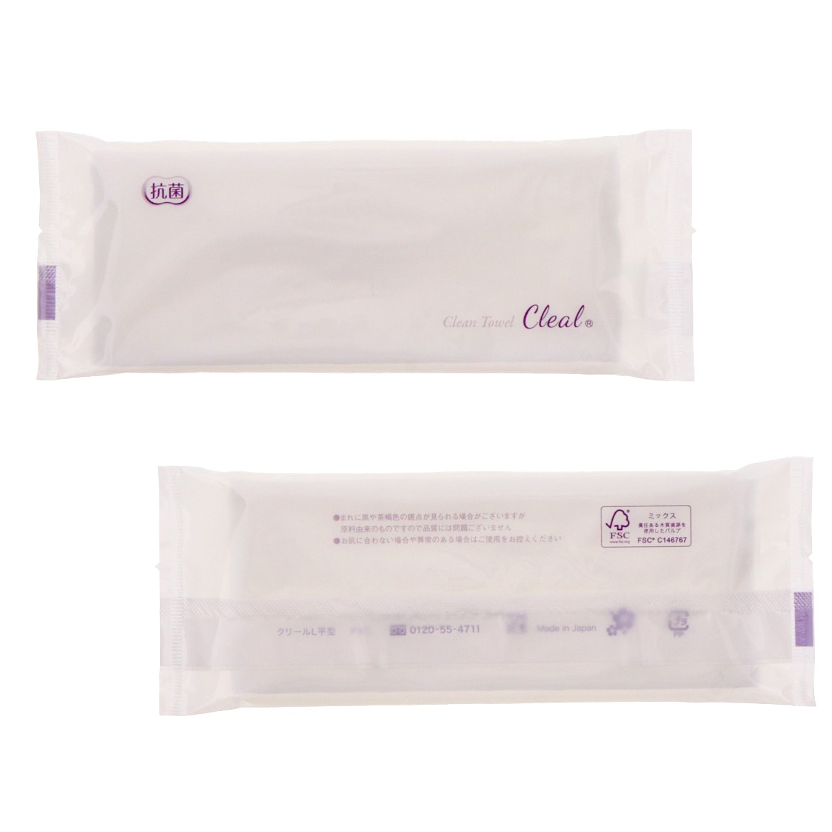 ・おしぼり:バガス(さとうきびの搾りかす)の繊維を混合した環境配慮商品。「FSC認証」24×29cm(広げた大きさ)外袋:OPP