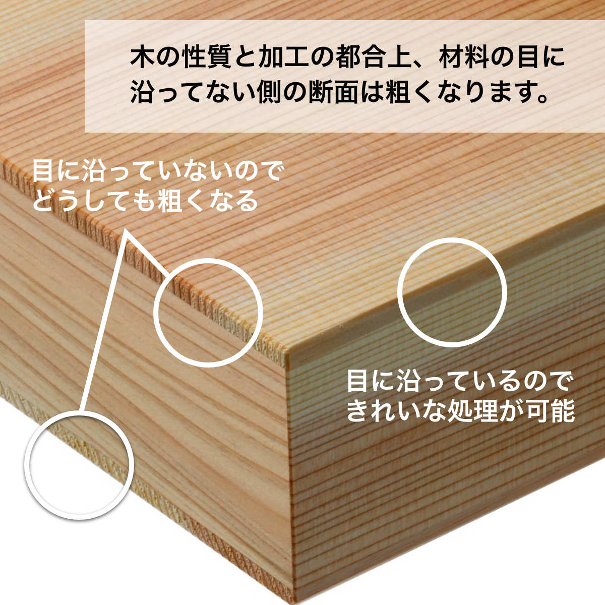 側面の木目は綺麗に揃っており、天板は柾目で見た目も美しく上品な仕上がりです。ひとつひとつ職人の手により作られ、全ての辺も丁寧に面取りし、加工しています。ほのかに香る秋田杉は、より上質なおもてなしに最適です。