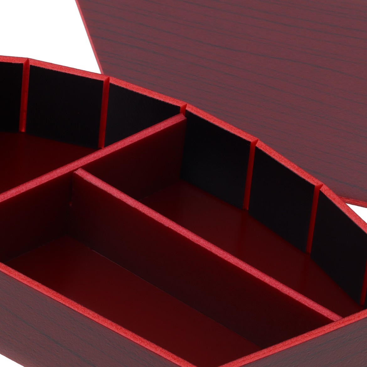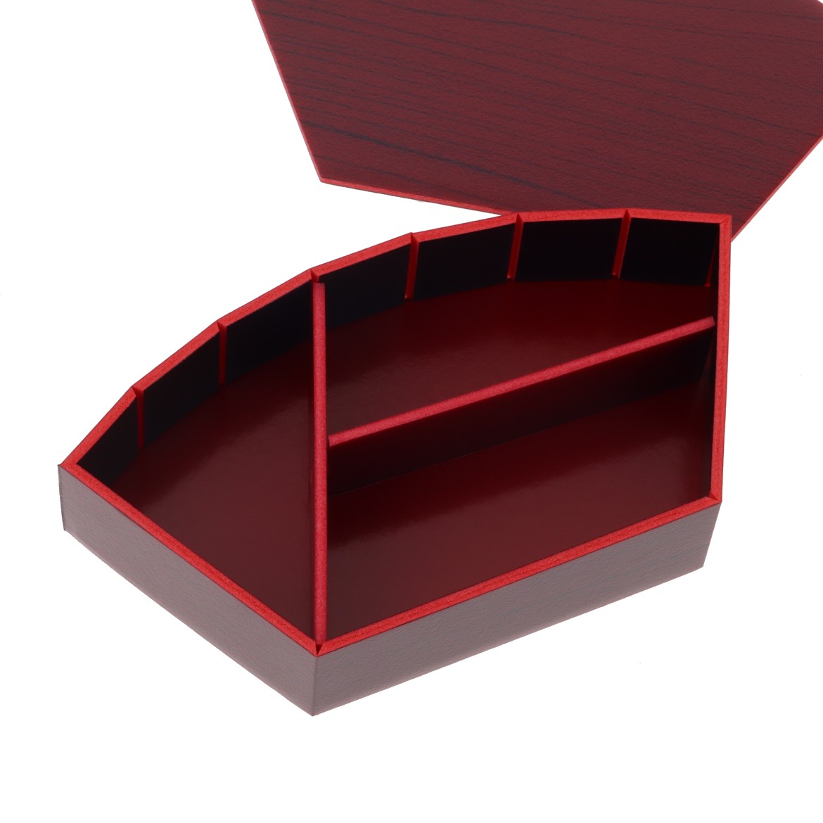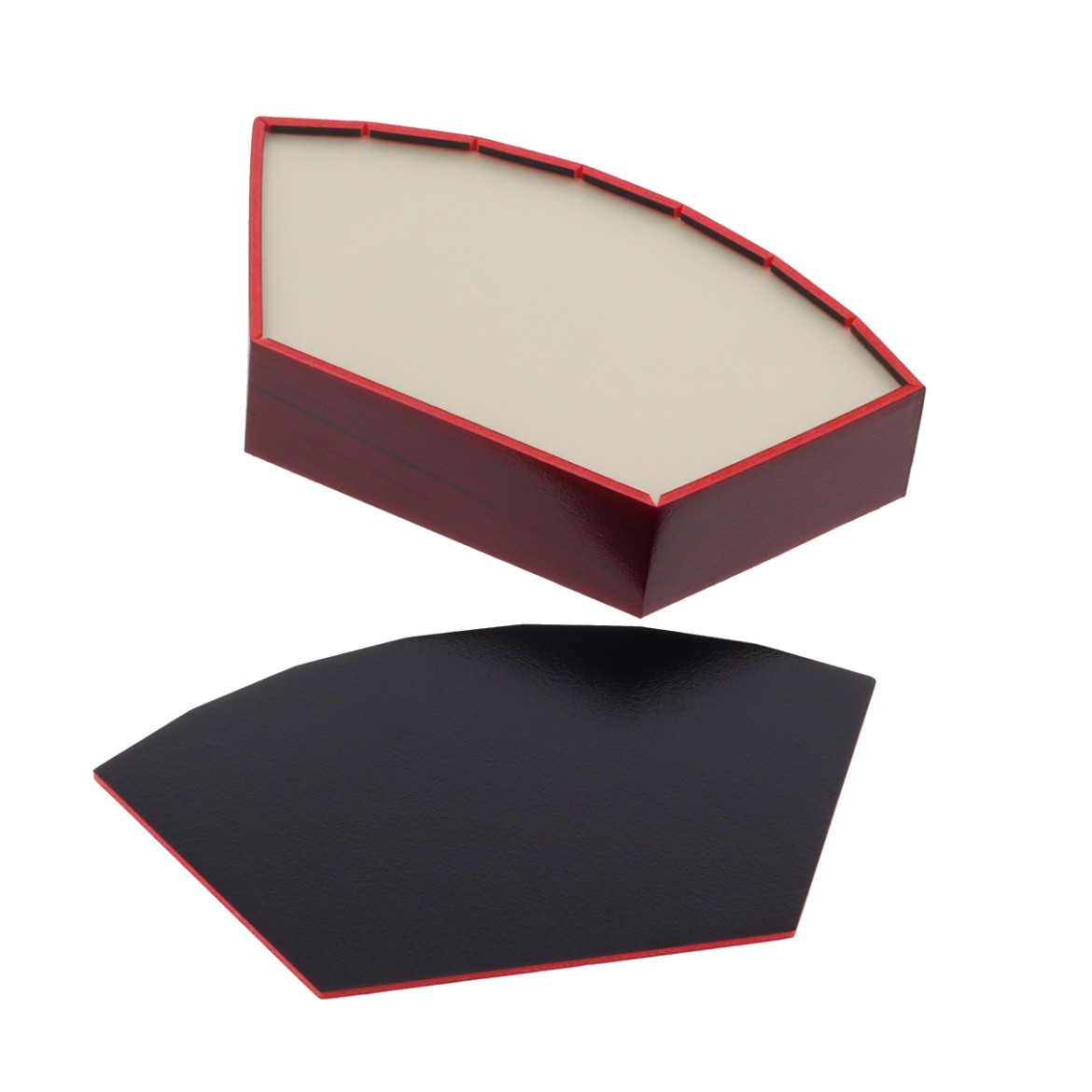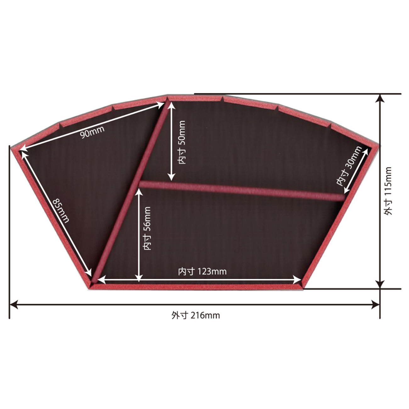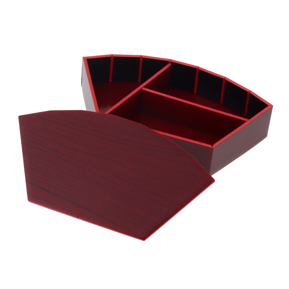 食事を華やかに見せる扇形の折。T字の仕切りは固定されているためズレることがなく盛り付けしやすい仕様です。一つの折でお弁当にしても、おかず用の折としてもオススメです。