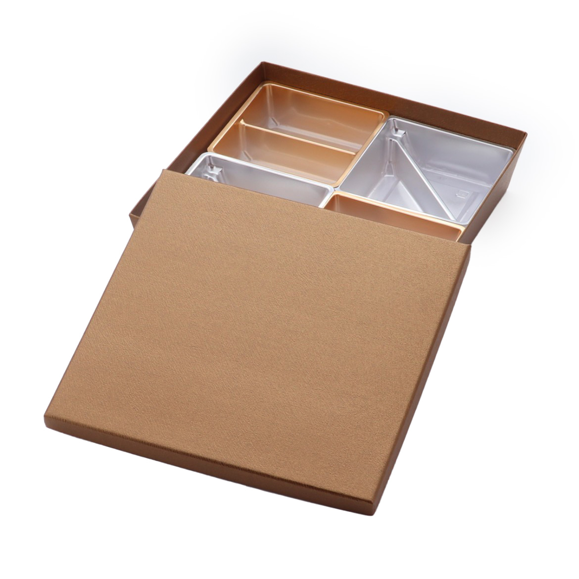 表面に質感のあるエンボス加工を施した紙を採用した、高級感がありながら価格は抑えた紙製の折箱です。本体がテーパー型で、重ねられますので在庫スペースに優しい商品です。本体には当社で販売している小鉢70が4個ピッタリ収まるサイズになっており、色々な形状の小鉢をお使い頂けますので、あらゆるメニューにご利用いただけます!