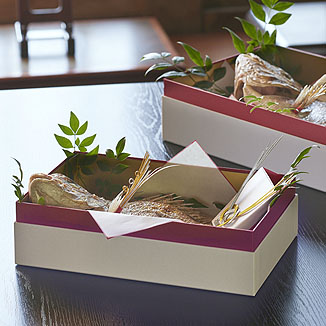 串焼きをして躍動感ある焼き鯛は見た目がさらに豪華になりますが、故にその鯛を入れるとなると、どうしても高さのある箱が必要となってきます。「めで鯛ボックス」は尾紙など飾りを施したままでもすっぽり収まる高さがあります。