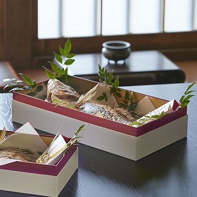 串焼きをして躍動感ある焼き鯛は見た目がさらに豪華になりますが、故にその鯛を入れるとなると、どうしても高さのある箱が必要となってきます。「めで鯛ボックス」は尾紙など飾りを施したままでもすっぽり収まる高さがあります。