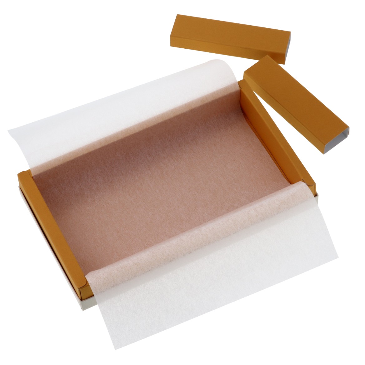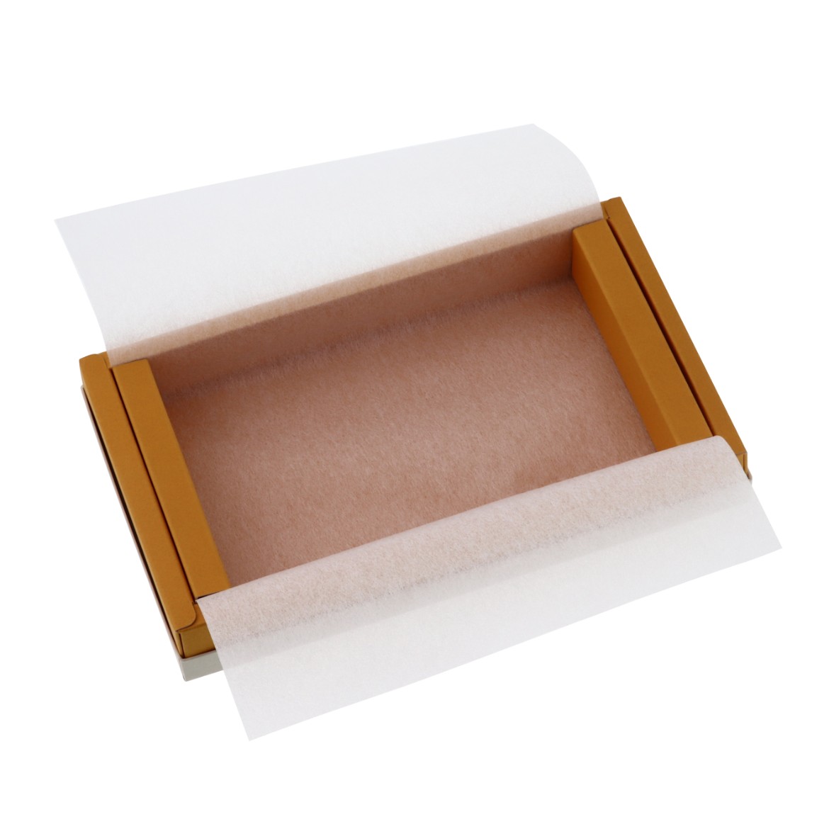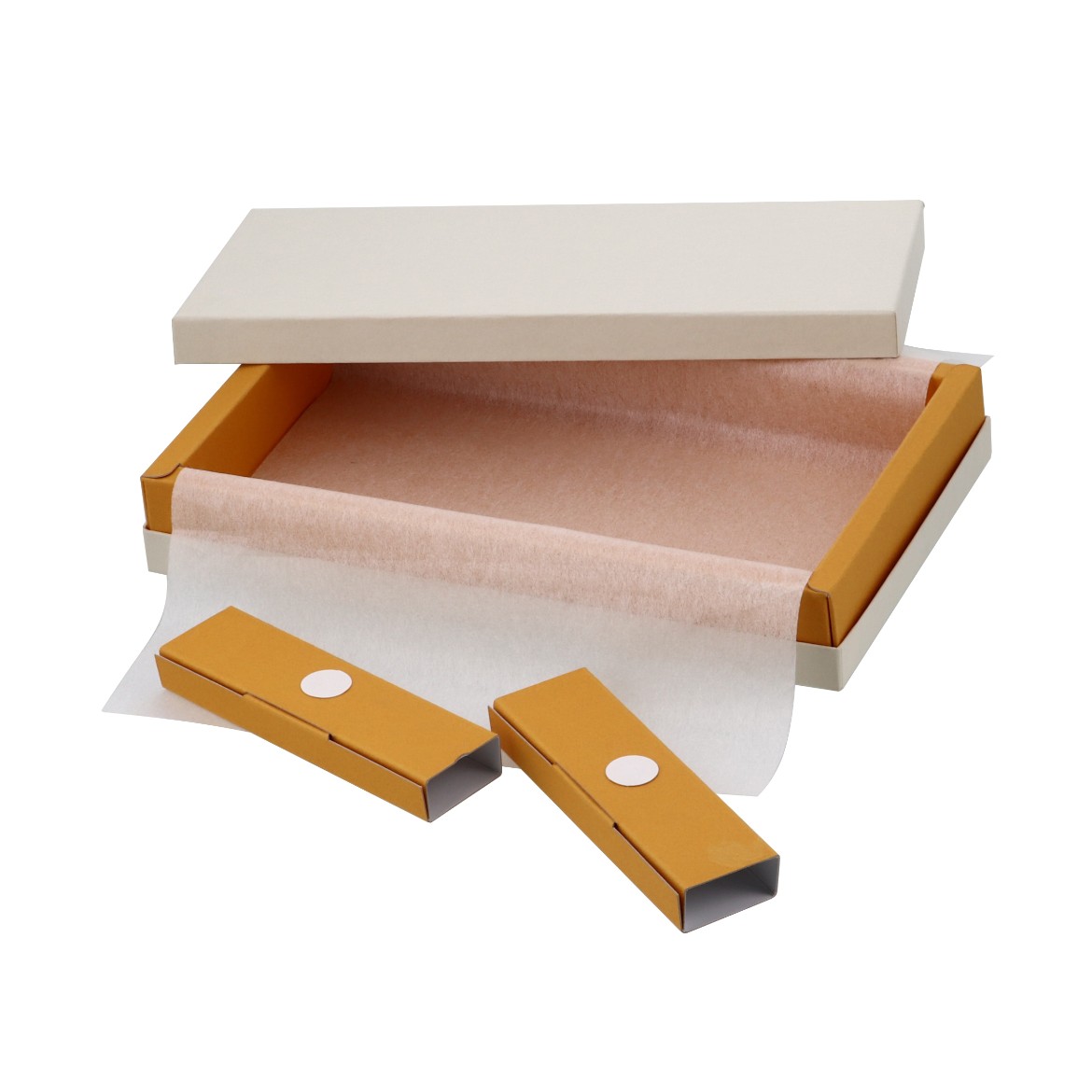 からすみの厚さに合わせて作られた箱なので、深さが無く沈み込むことがありません。また、付属のレーヨン紙に包めば上品な見た目にも仕上がります。
