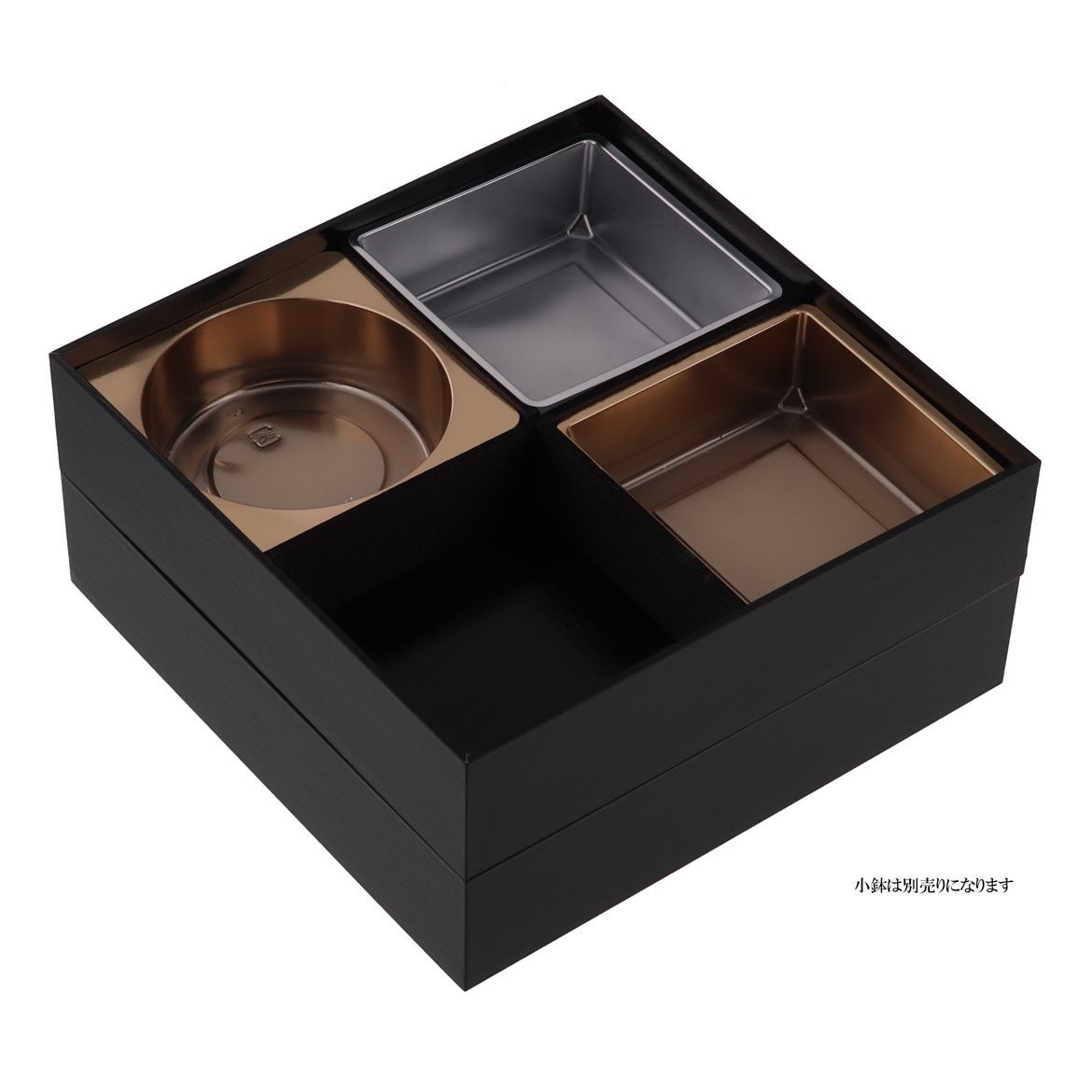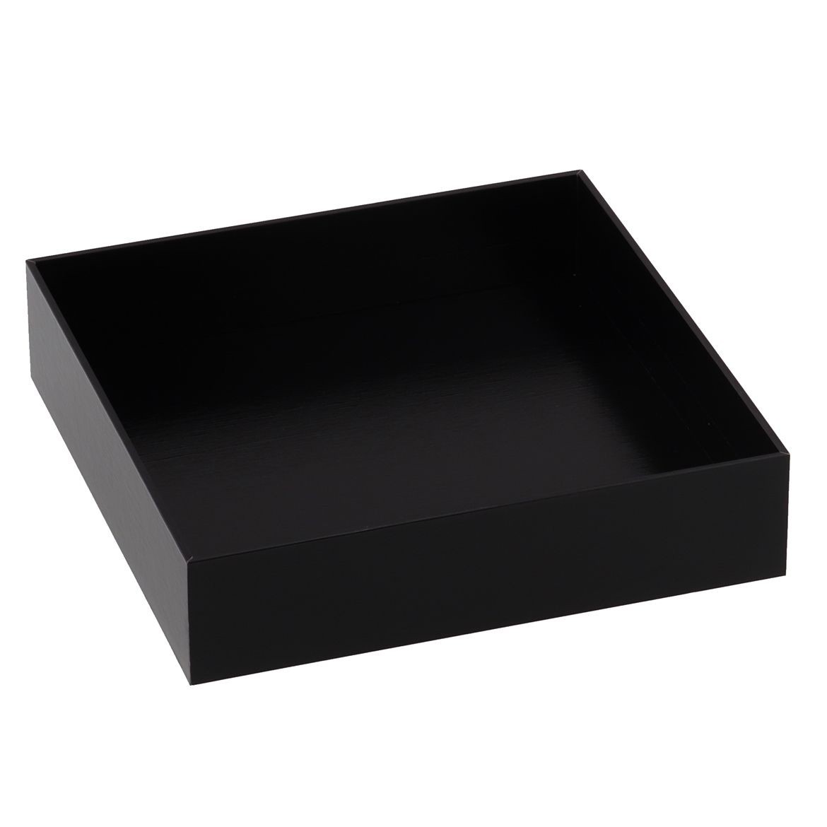 黒漆の品のある蓋付の松花堂弁当用の折箱です。2段、3段と重ねてお使いになる際にご利用くださいませ。底の内側は重ねてズレないような仕様になっています。