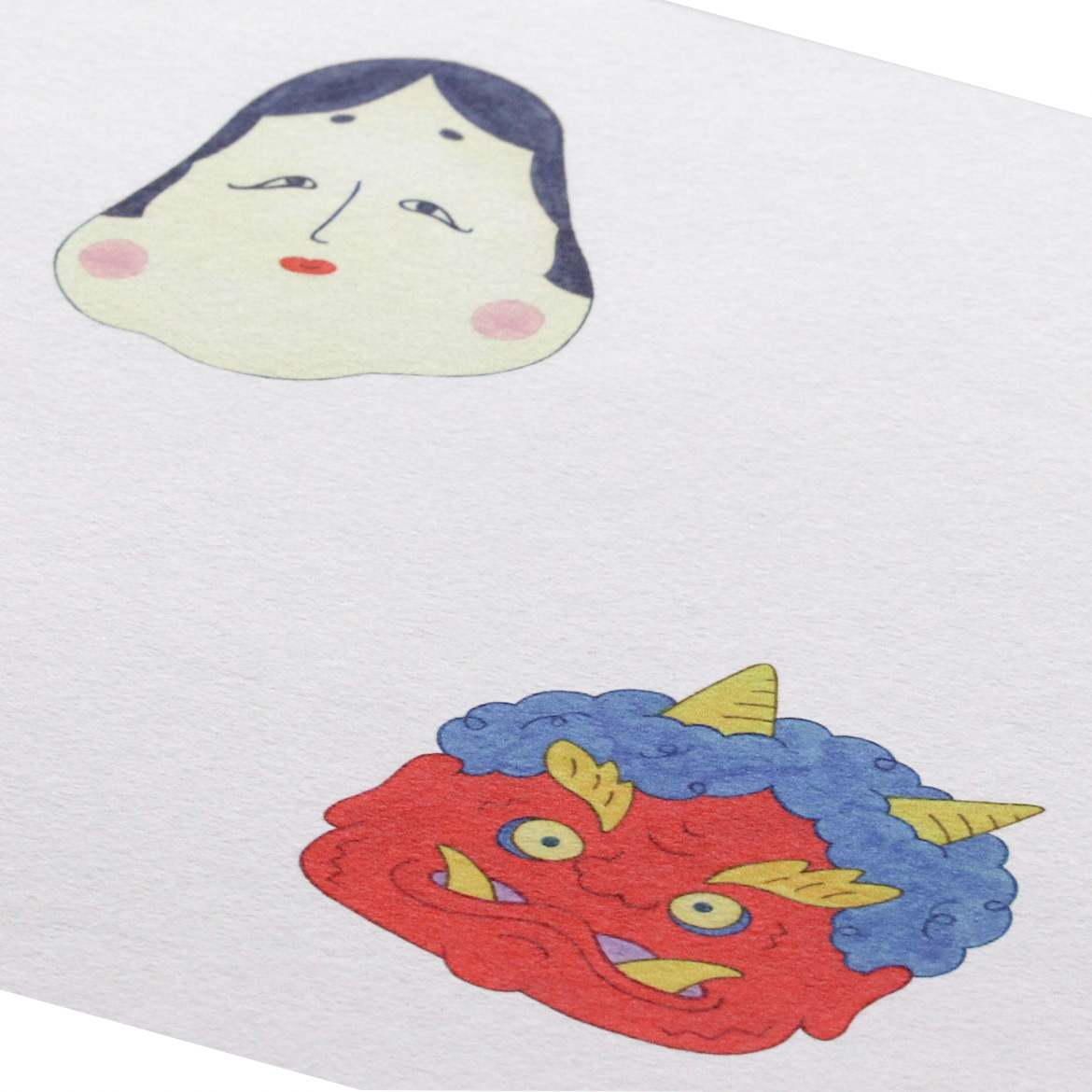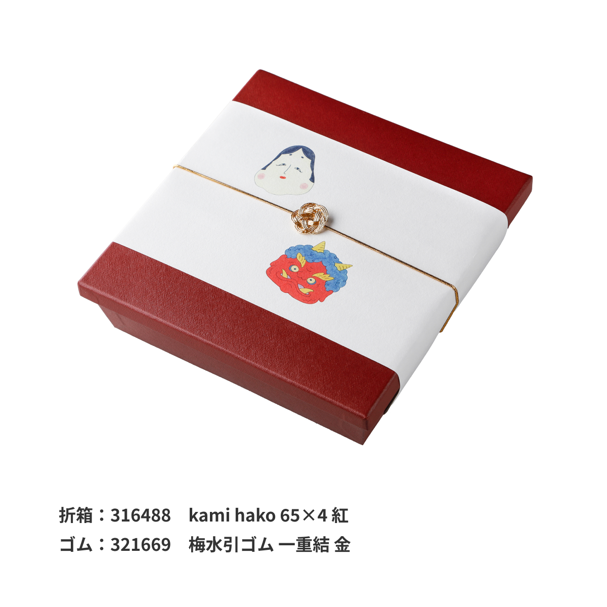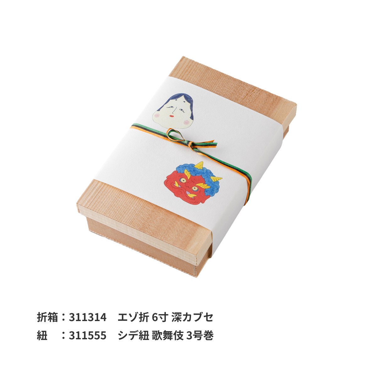 節分の時期にぴったりな可愛らしい鬼とお多福の掛紙です。いつもの折箱にはもちろん、恵方巻などの細長い折にも合わせられるサイズ感でお作りしました。