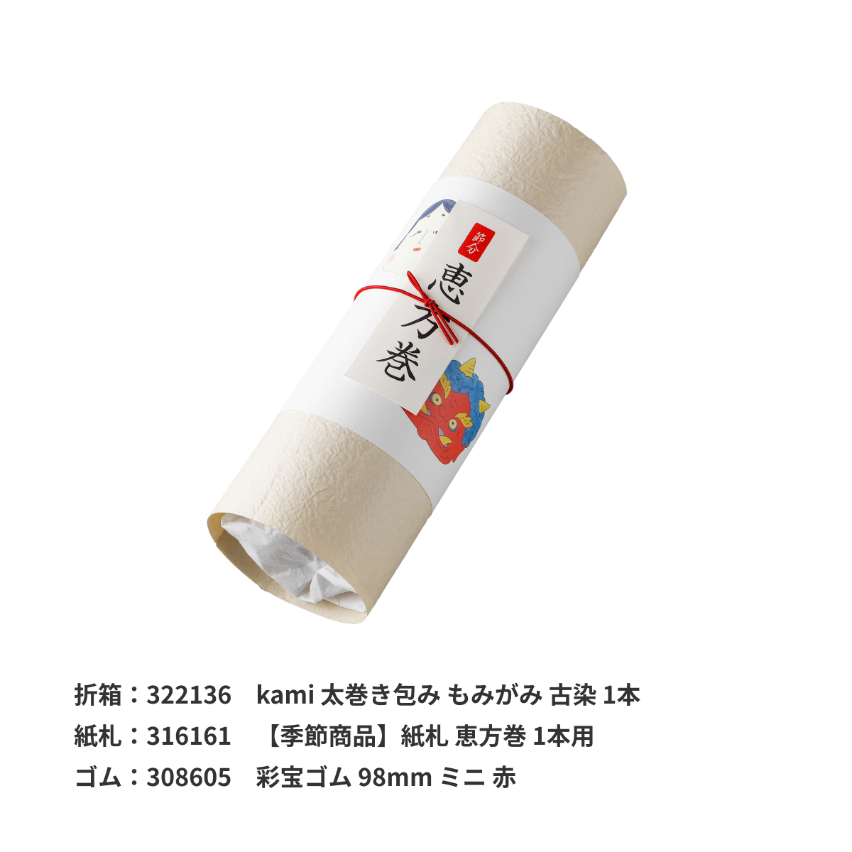 真ん中にお店様の札やシール、「恵方巻」の札シールを張り付ければ、ちらりと覗く鬼やお多福が。ありそうでなかった、節分の掛紙です。