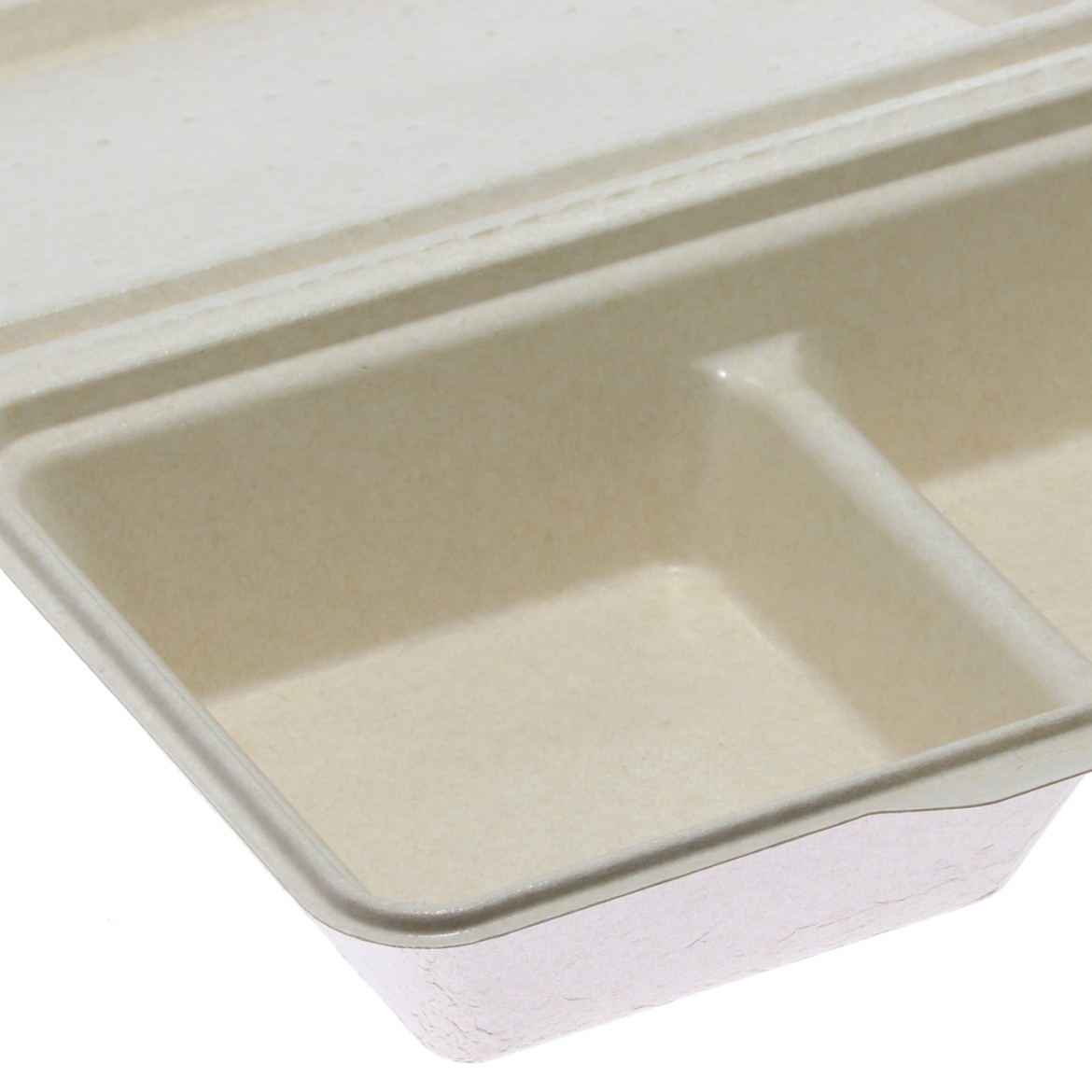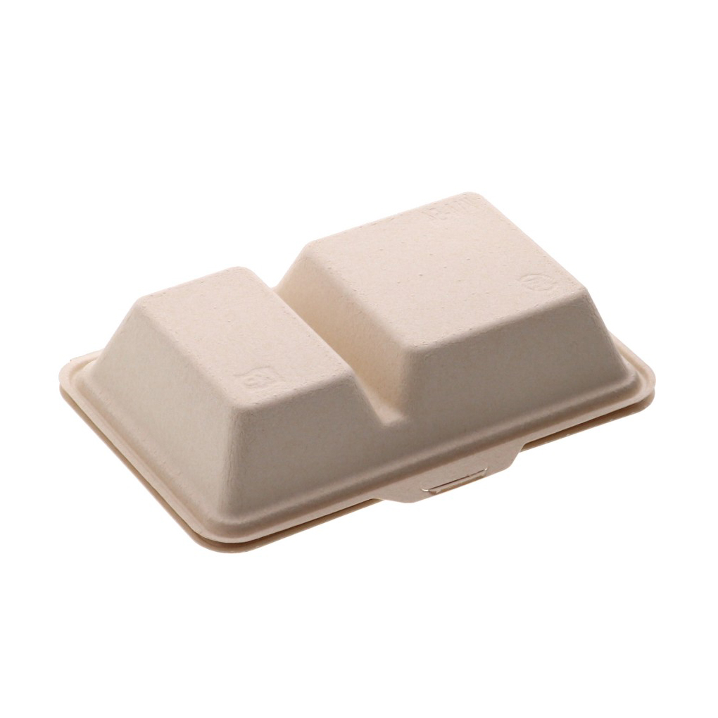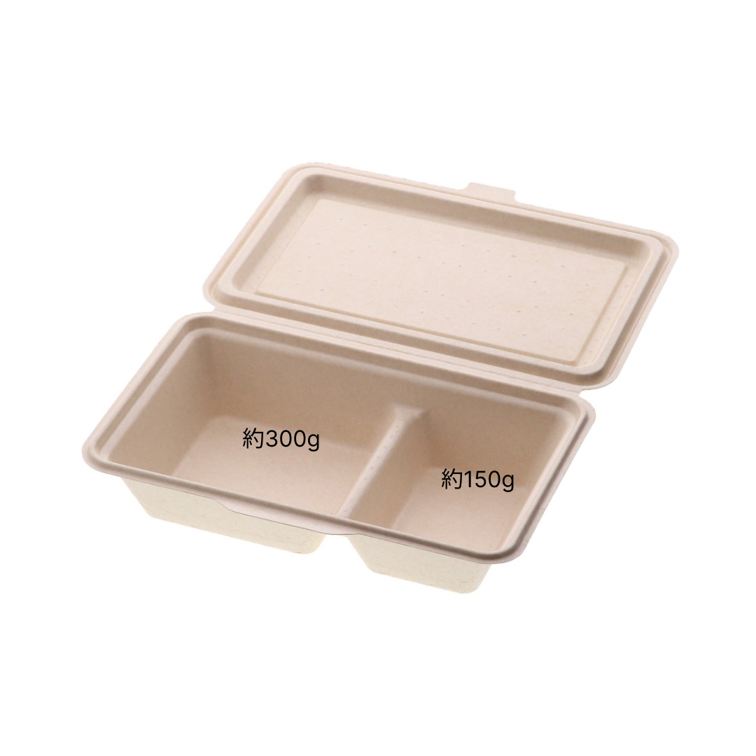 2つ仕切の電子レンジ対応の蓋一体型パルプモールド容器です。