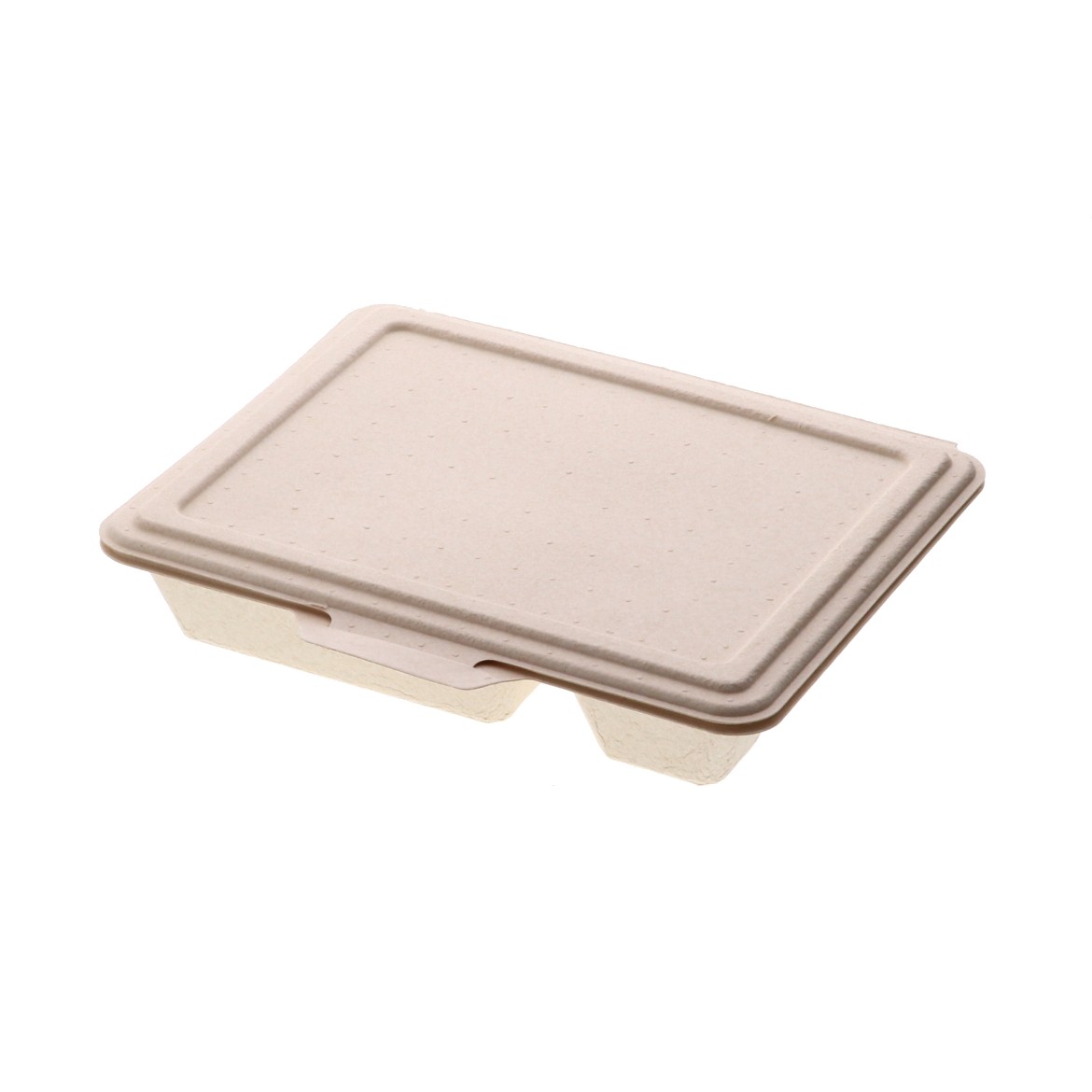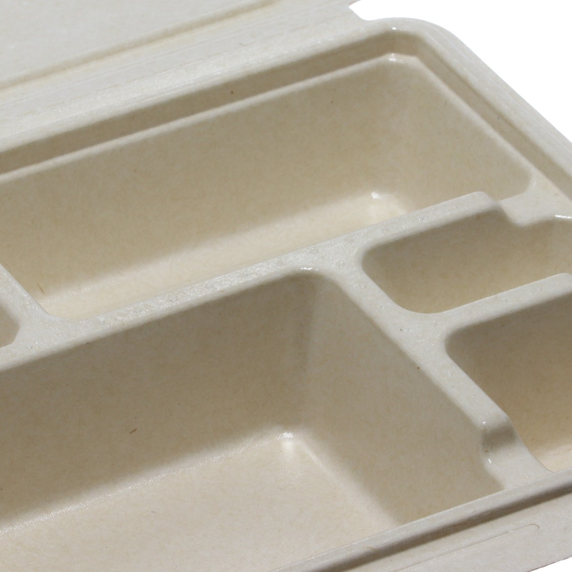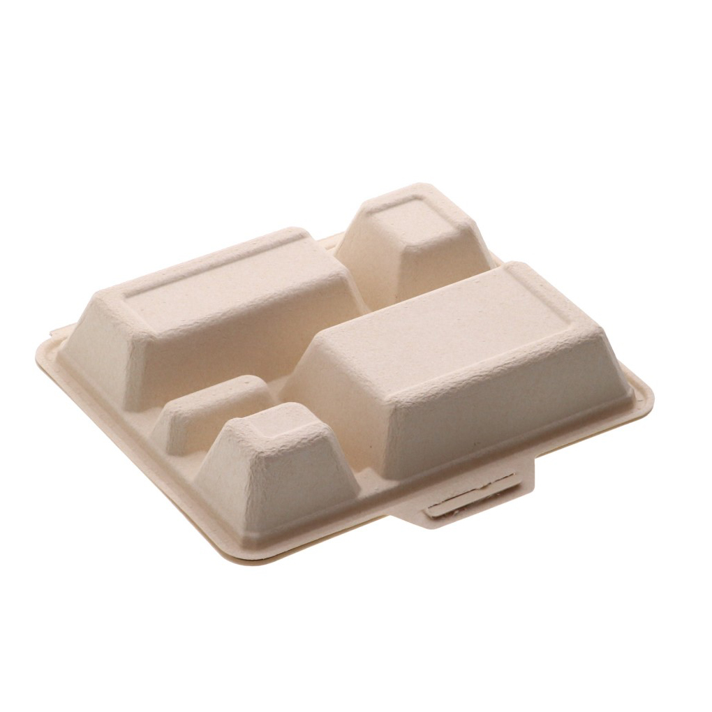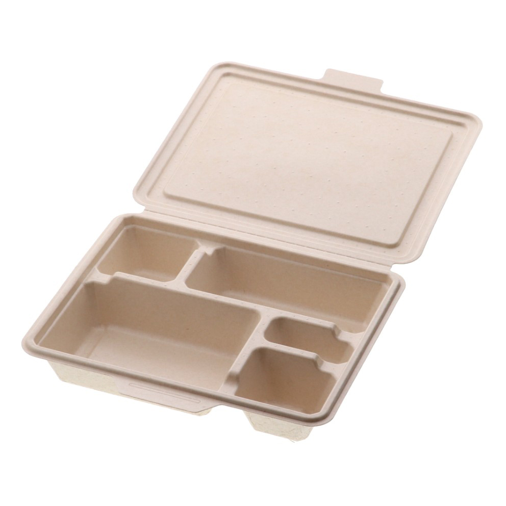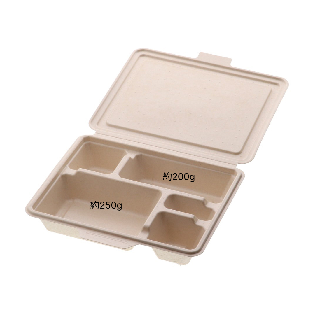 5つ仕切の電子レンジ対応の蓋一体型パルプモールド容器です。