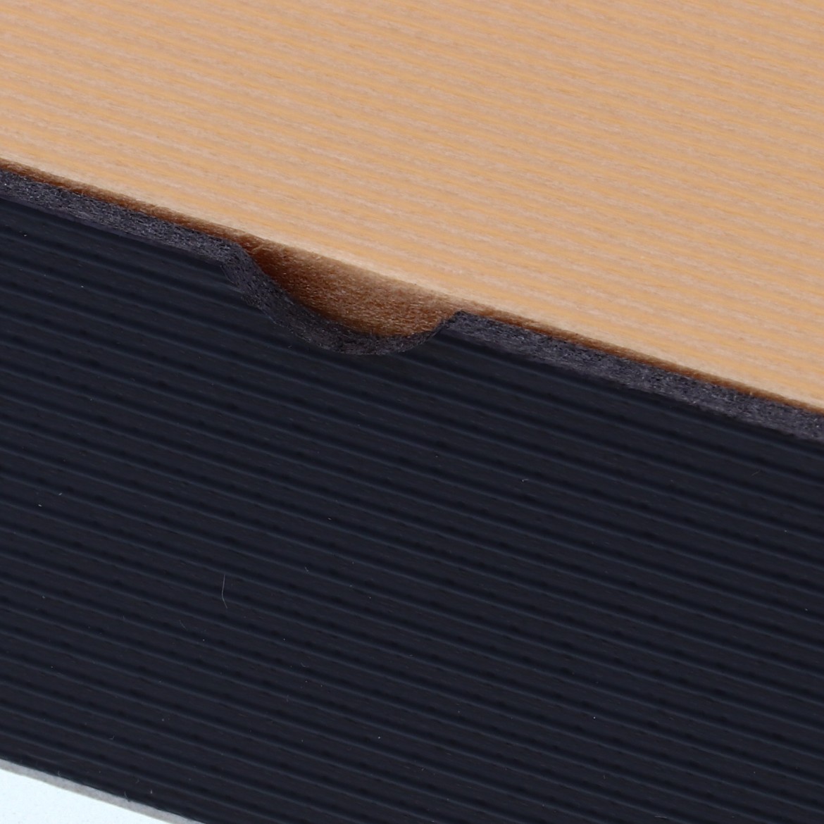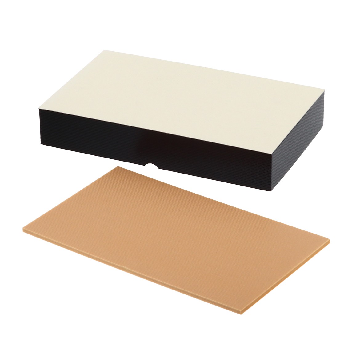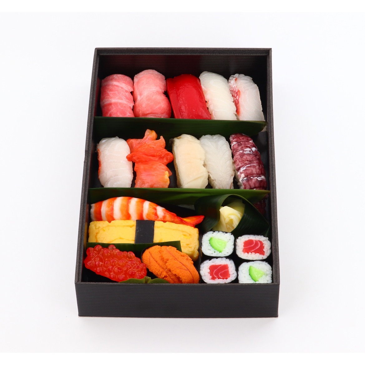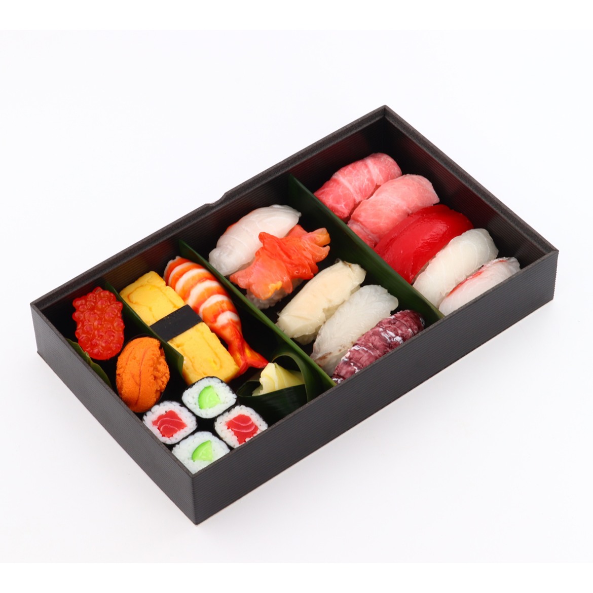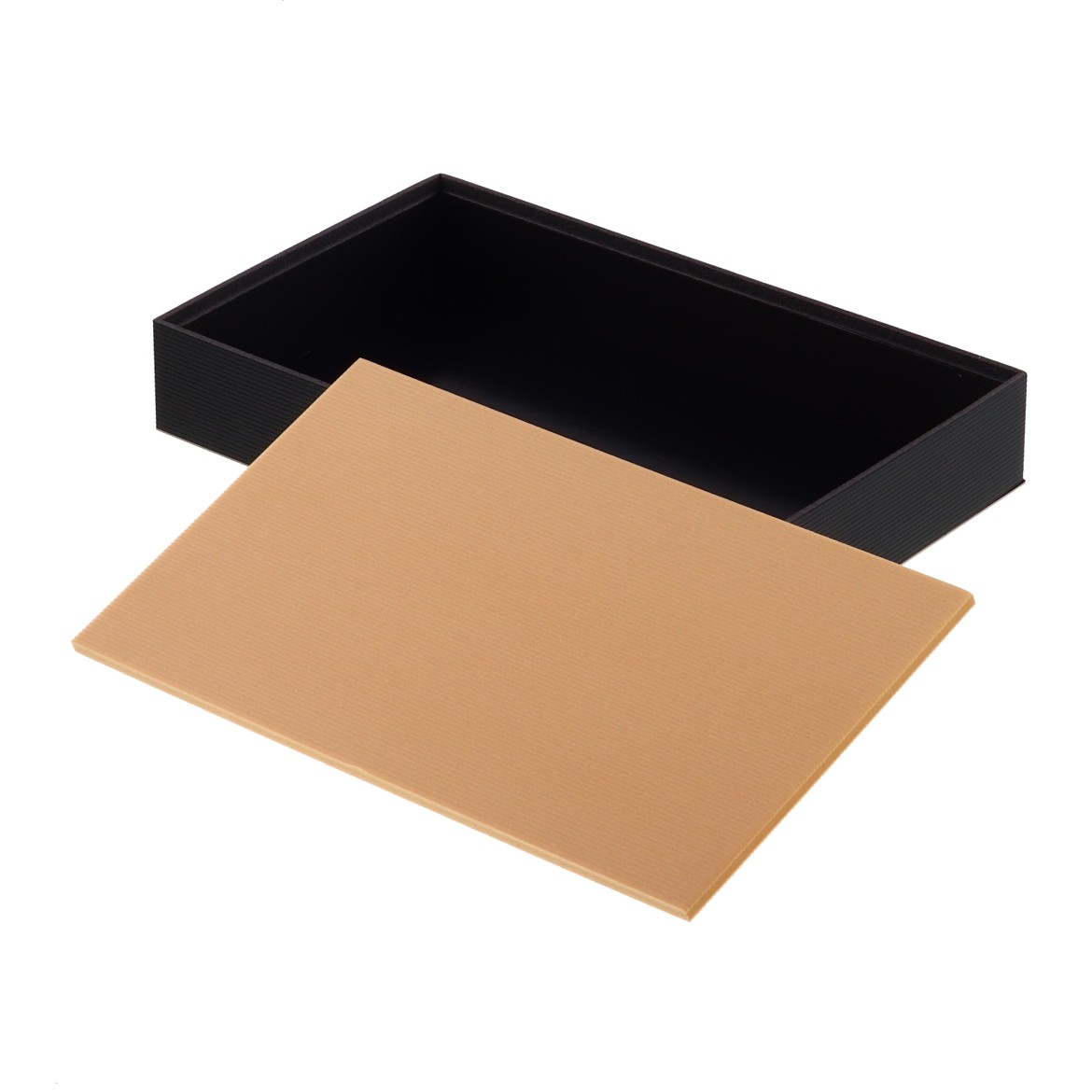 尺寸サイズは通常の握り寿司の2人前~2.5人前を想定しています。蓋・身ともにエンボス加工が施され、見た目、手触りともに高級感があるため、食卓などにもそのままお出しいただきやすいデザインです。木目のようなデザインの蓋はシャープで温かみのある印象を持たせ、黒色の板が寿司や食材を際立たせます。