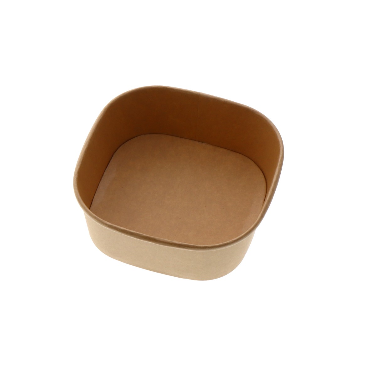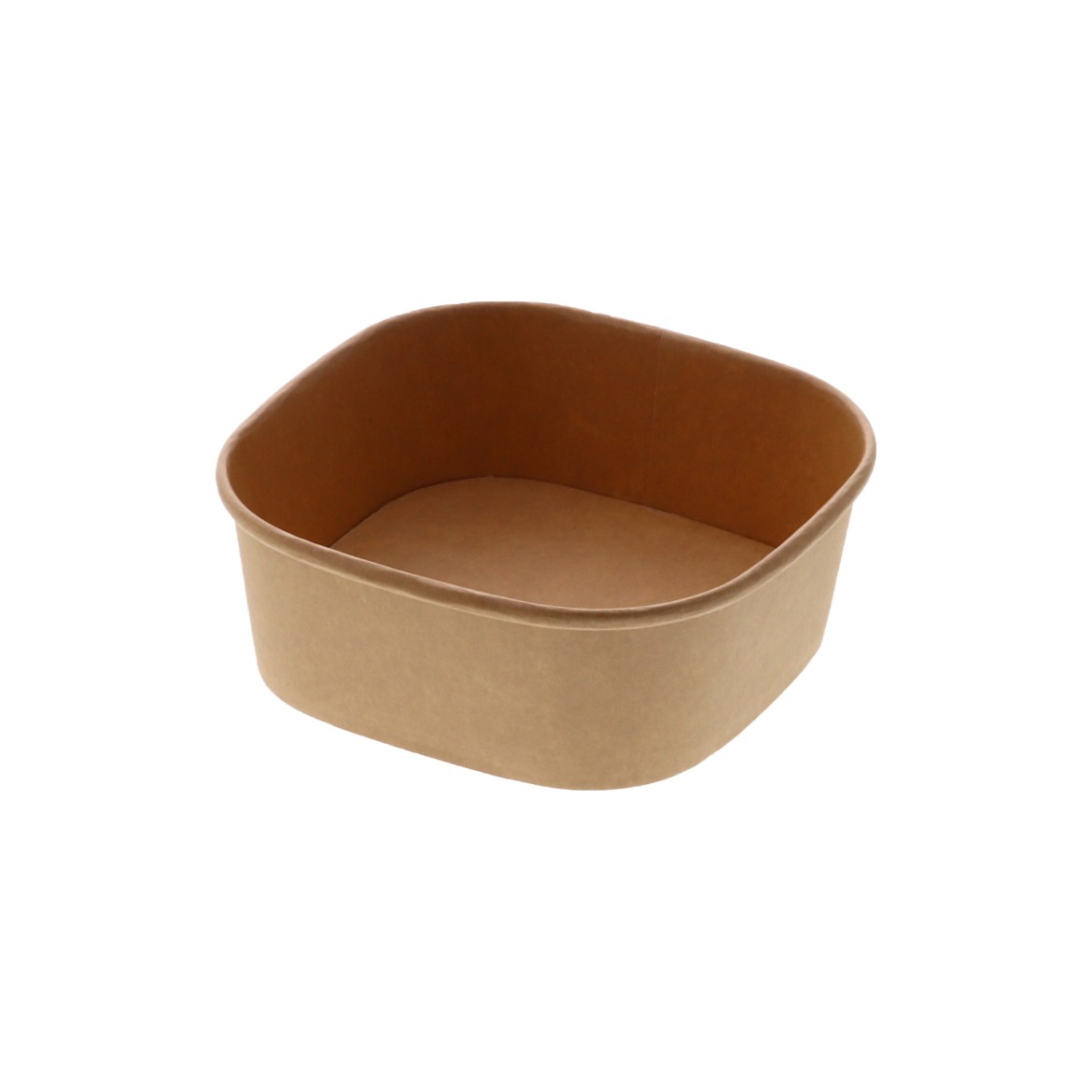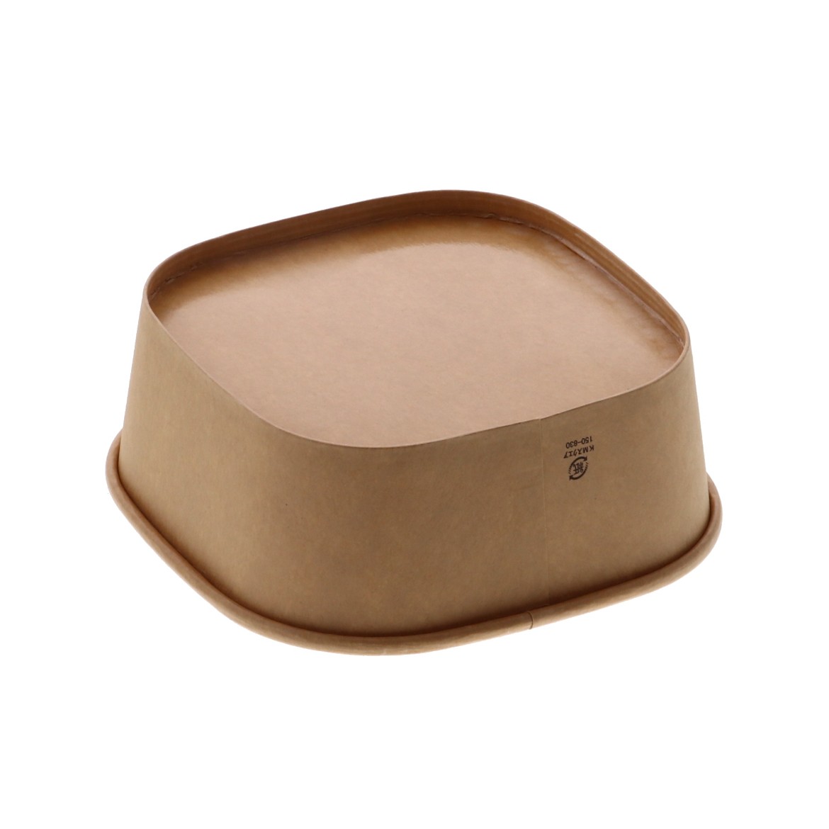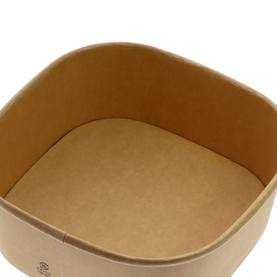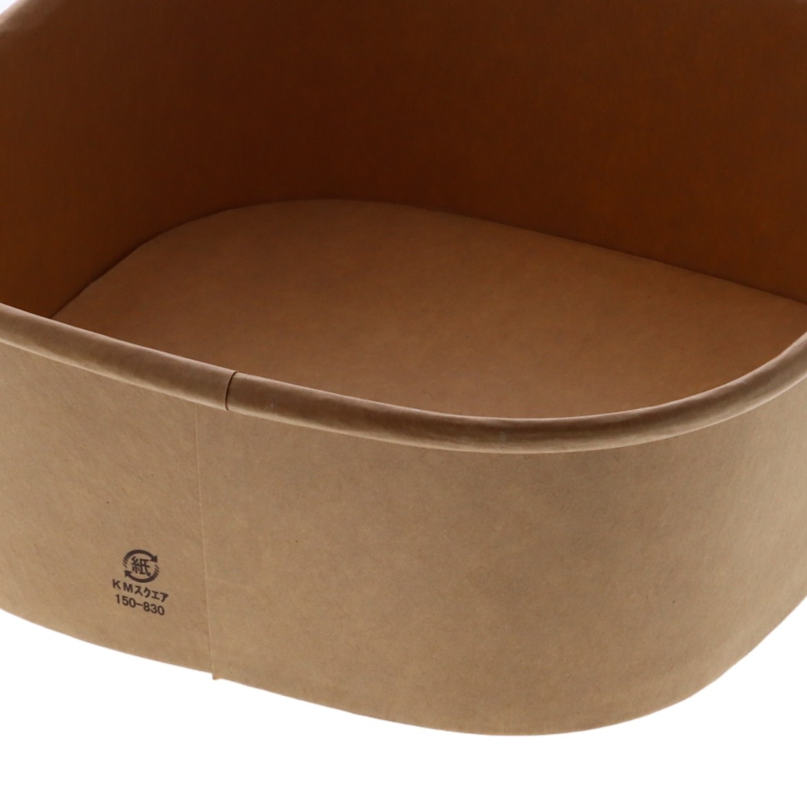 電子レンジ対応のスクエア型の紙製容器です。丸みを帯びた角にご飯が集めやすく最後まで食べやすくなっています。