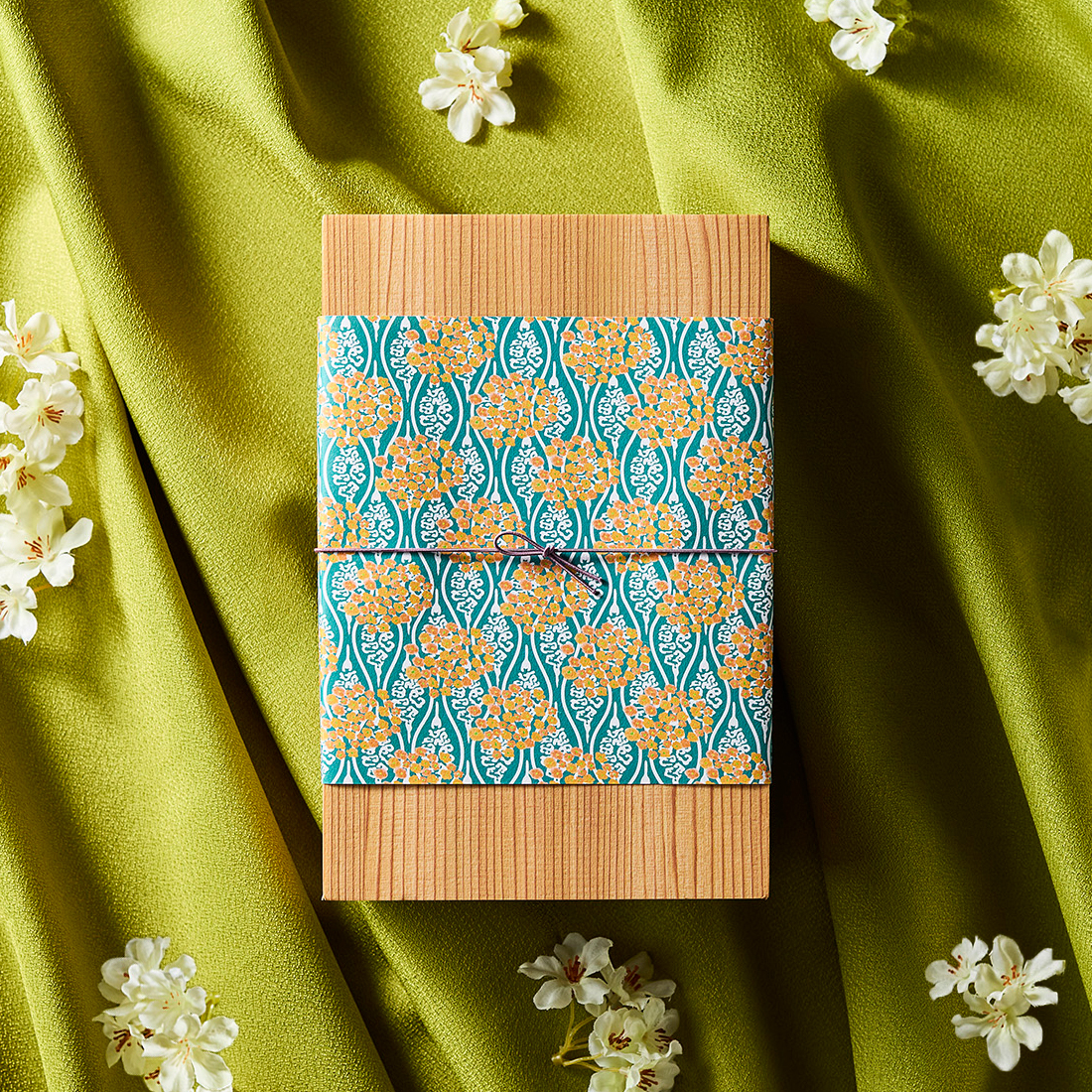 まるで帯のように華やかで艶やかかな掛紙のシリーズ。一見インパクトのある柄ですが、組み合わせることで折箱が着物のように気品溢れるパッケージに。中央に合わせる位置によって雰囲気も変わります。いつものお弁当にはもちろん、贈答品など特別な贈り物のパッケージにもおすすめです。