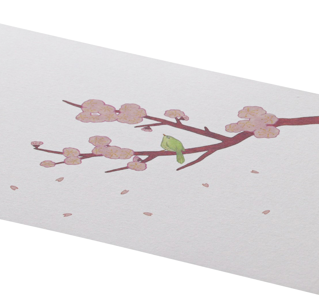 舞い散る桜の木の上に、一休みするウグイスのイラストが描かれた春の訪れを感じられる1枚。