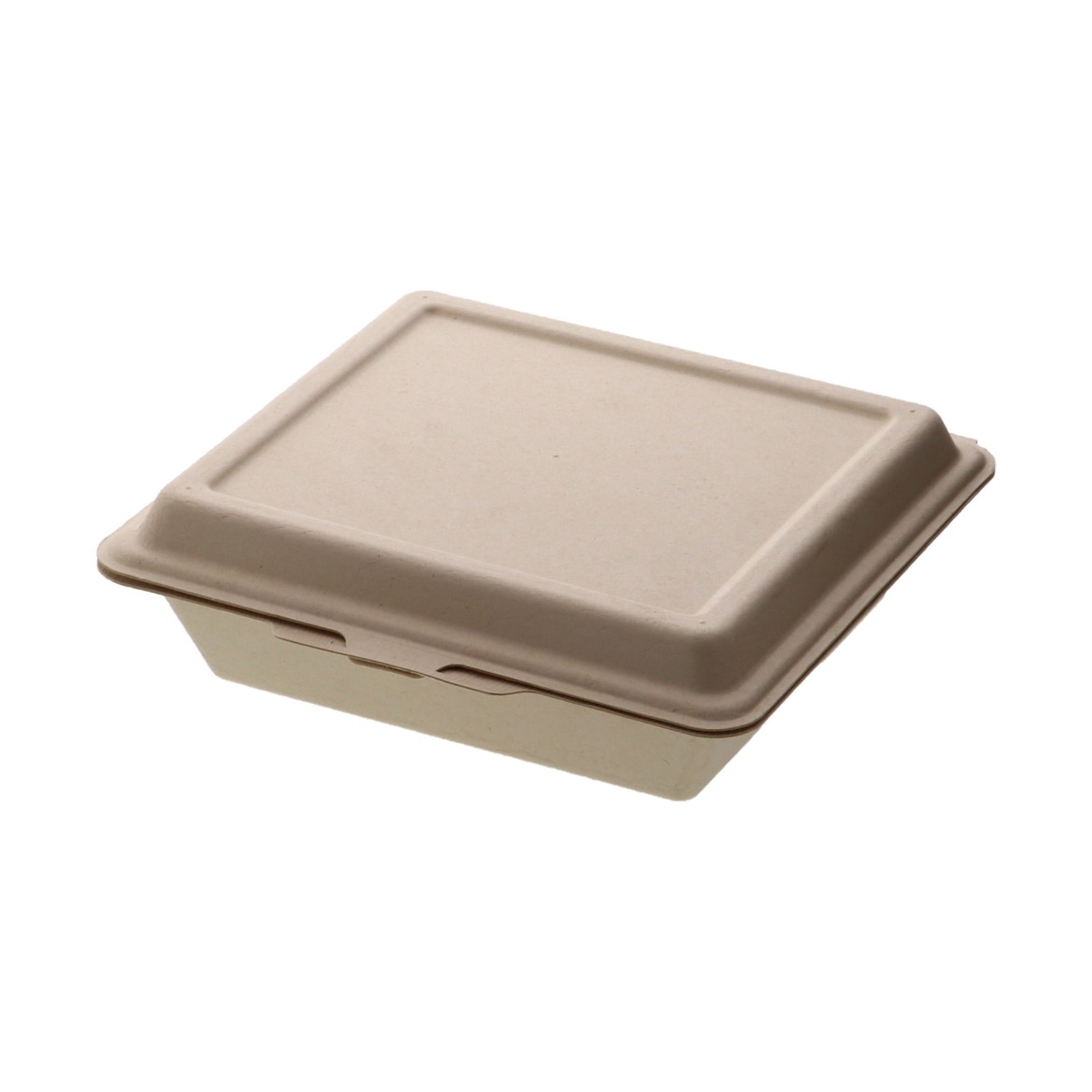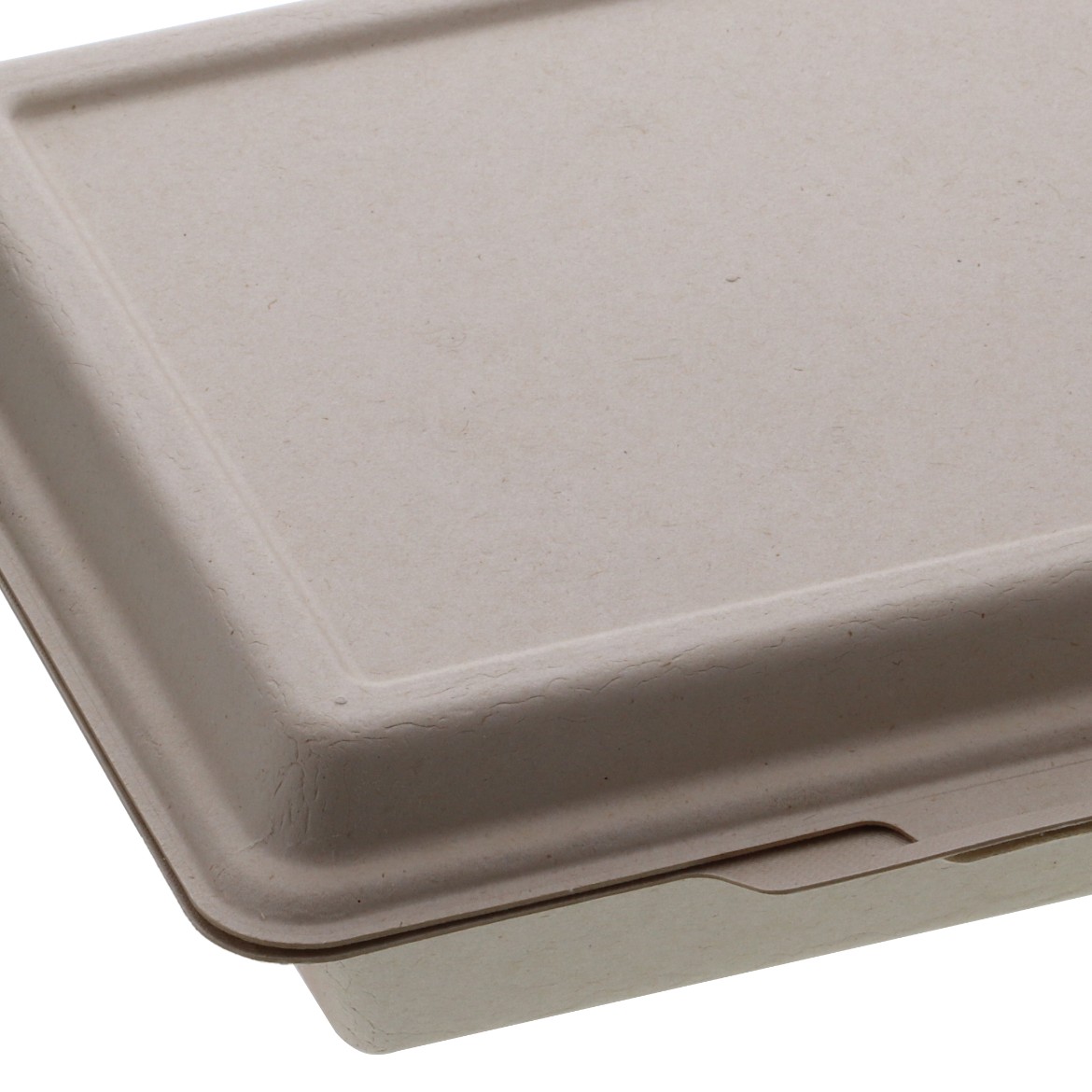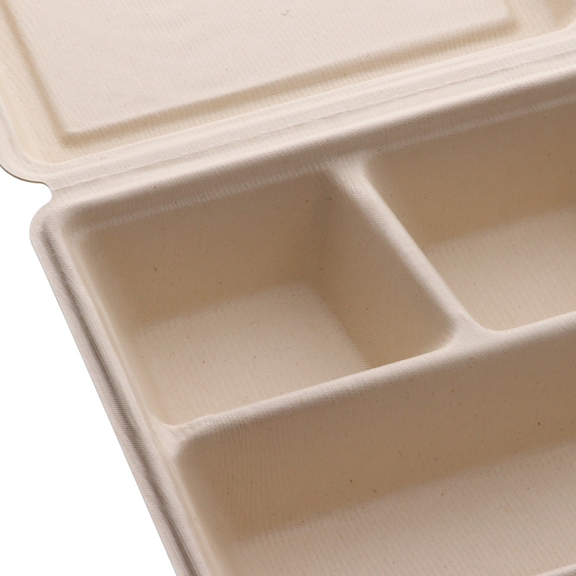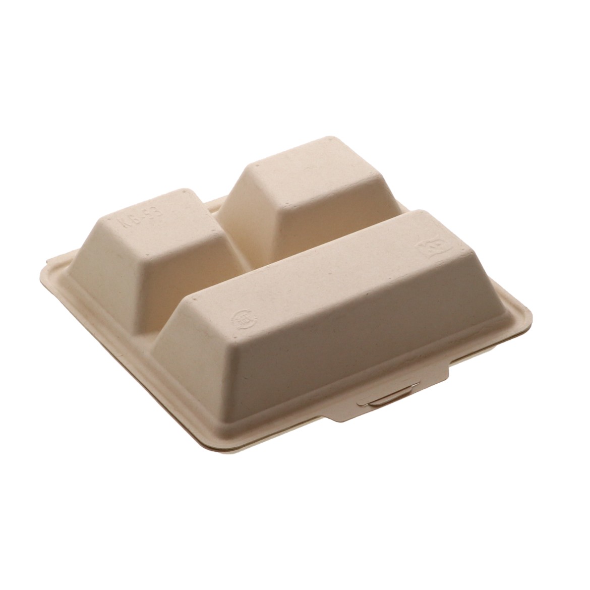 3つ仕切の電子レンジ対応のバガス(サトウキビ)の素材を使った蓋一体型モールド容器です。
