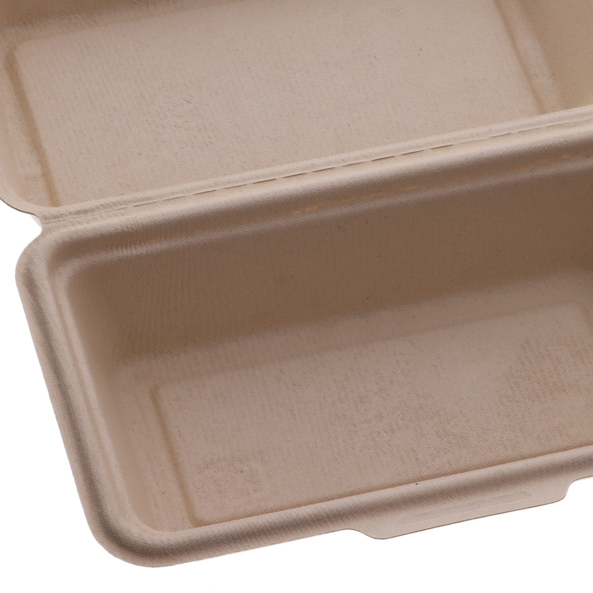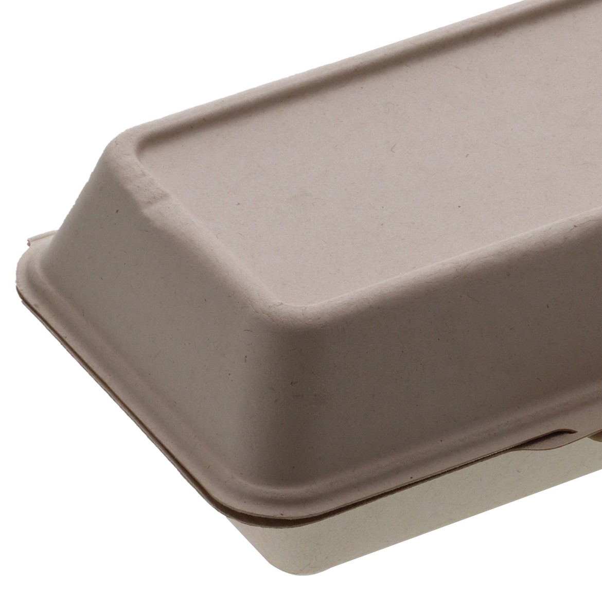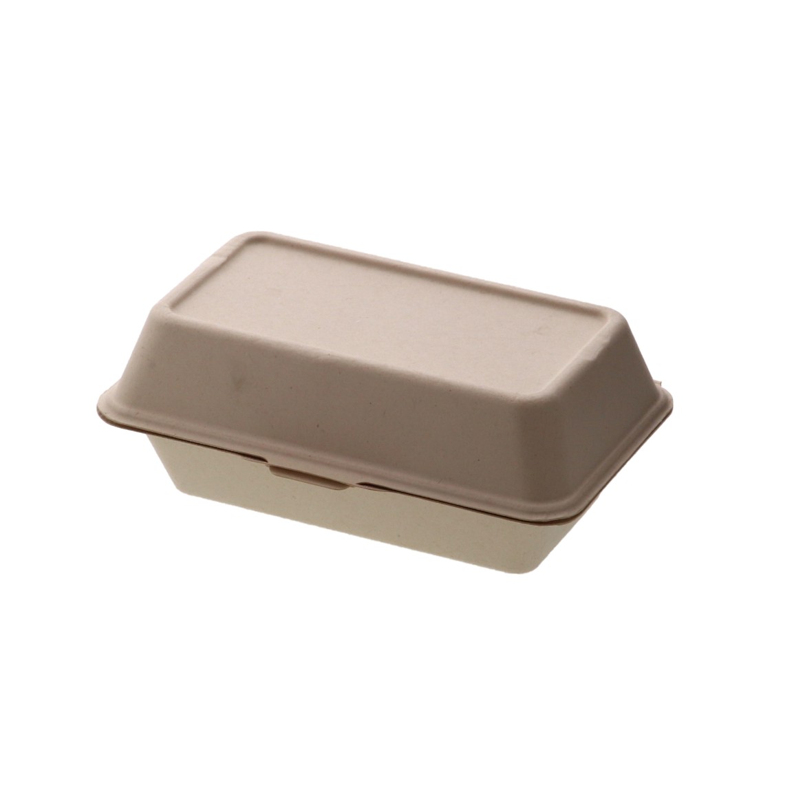 電子レンジ対応のバガス(サトウキビ)の素材を使った蓋一体型モールド容器です。