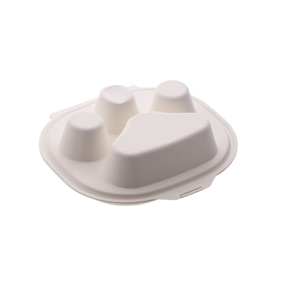 肉球のような形が可愛らしい、電子レンジ対応の蓋一体型パルプモールド容器です。