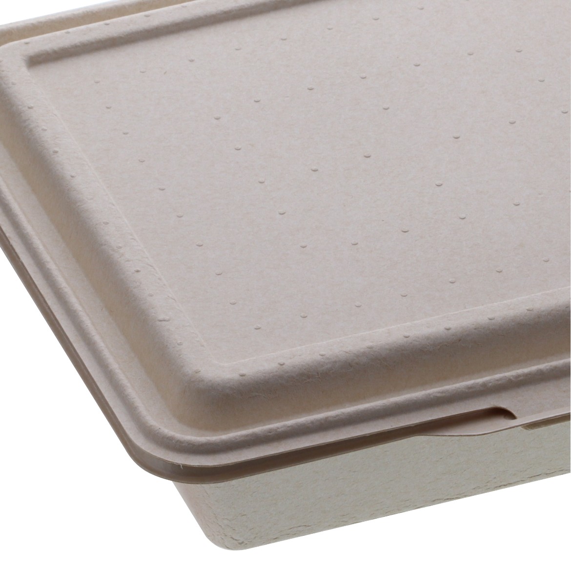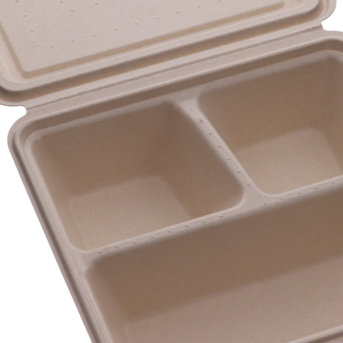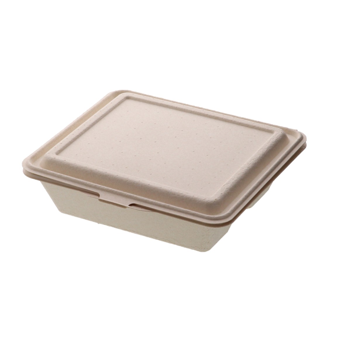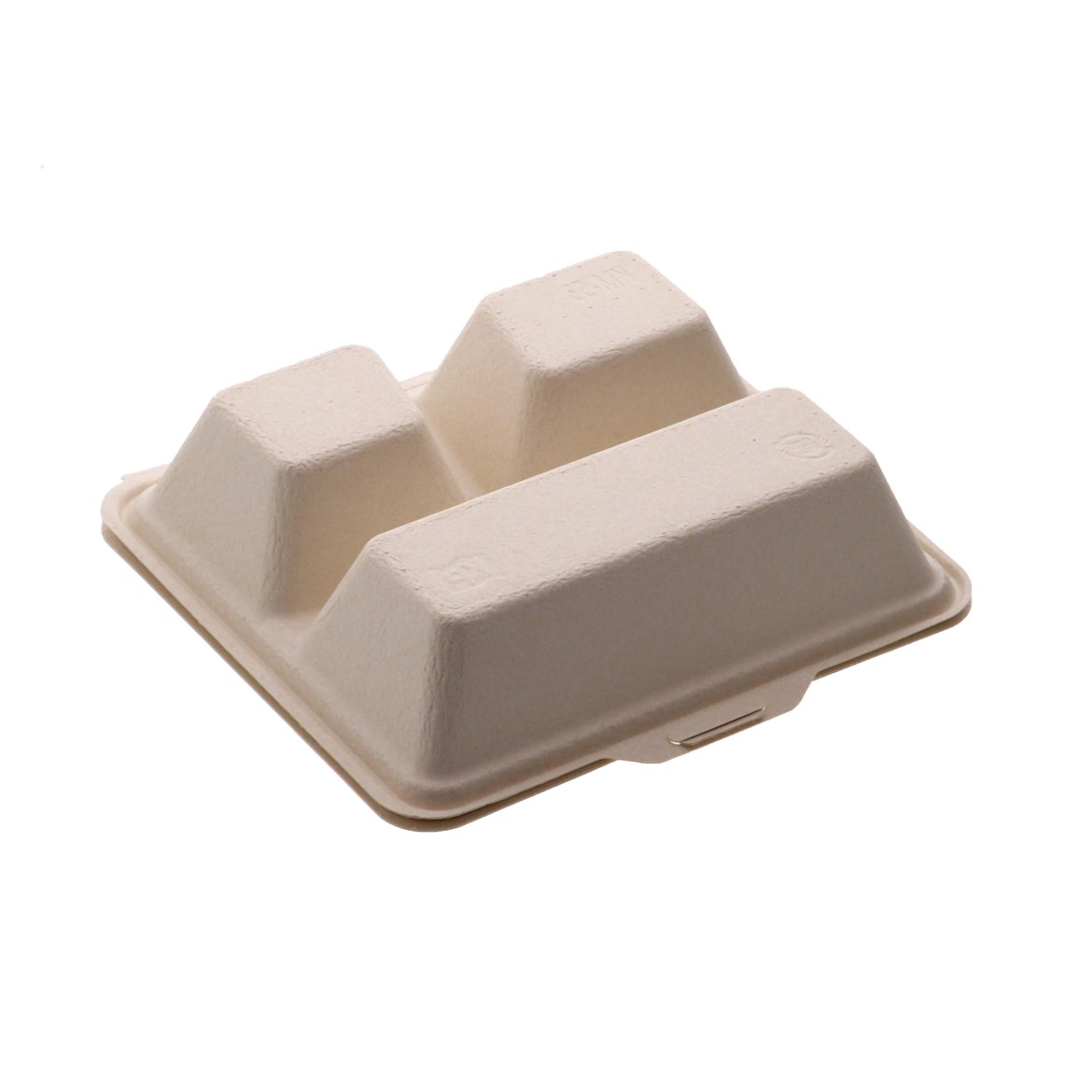 2つ仕切の電子レンジ対応の蓋一体型パルプモールド容器です。