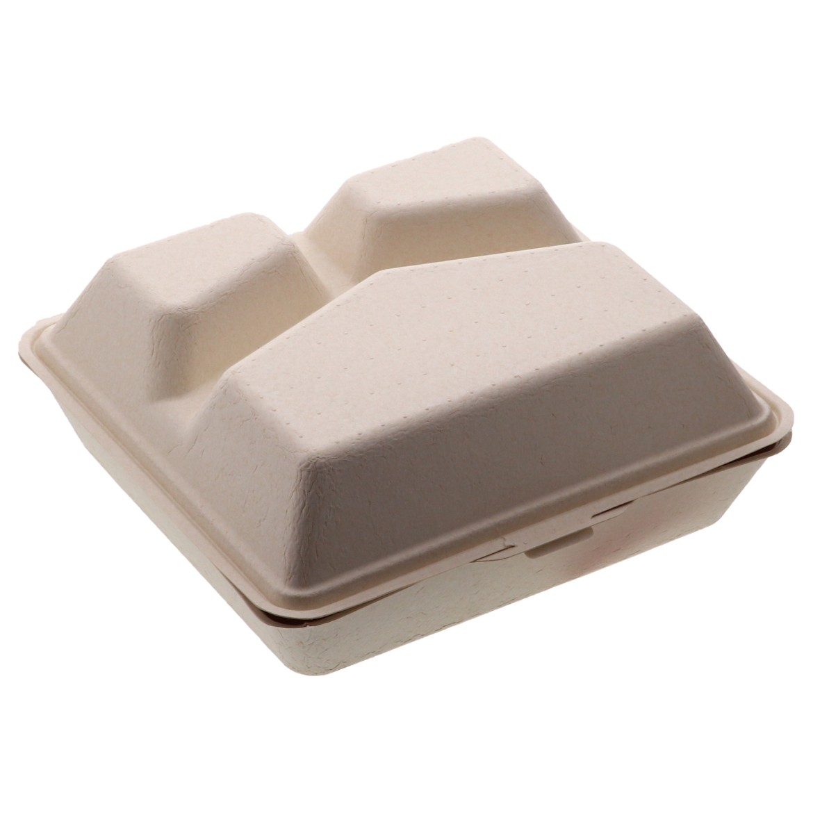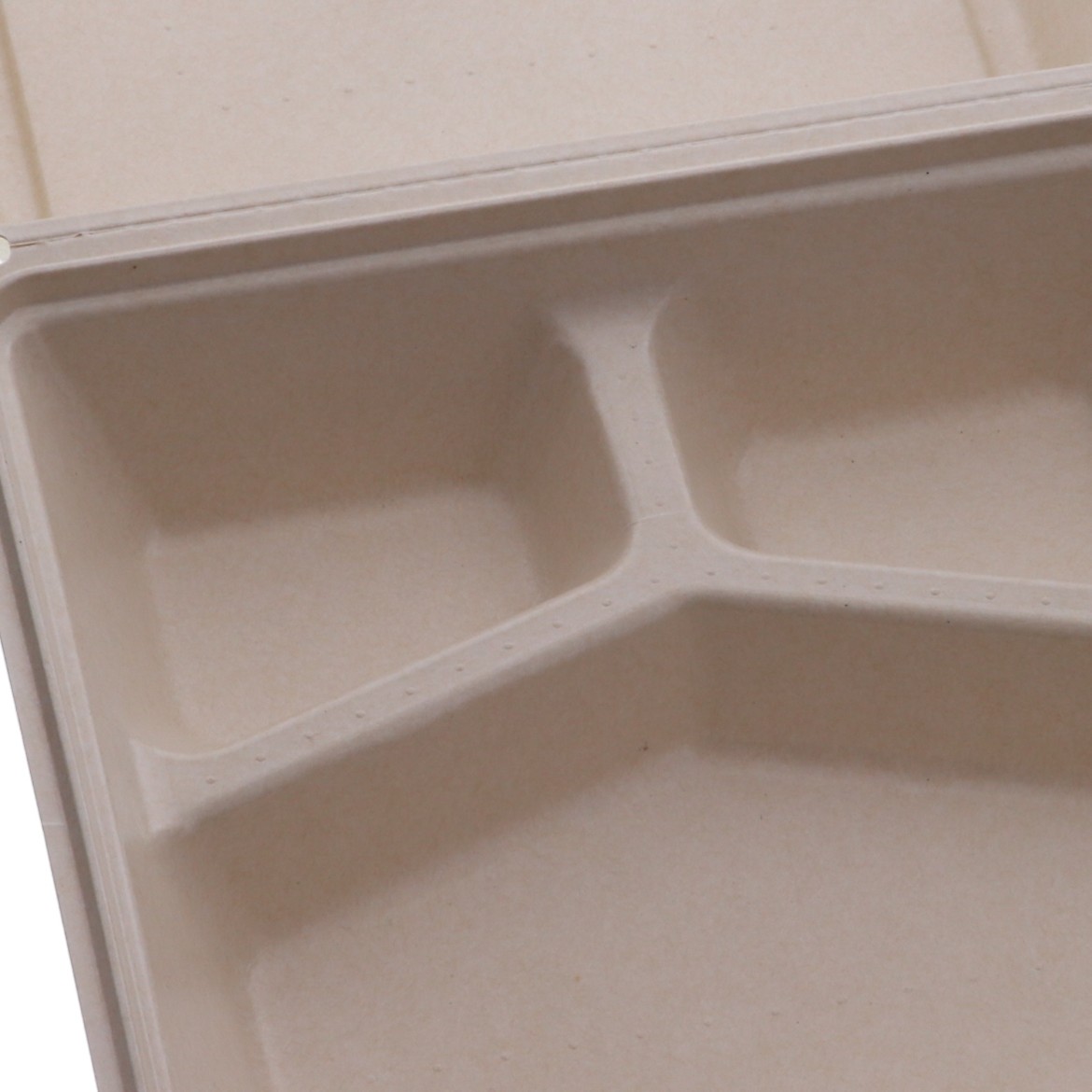 3つ仕切の電子レンジ対応の蓋一体型パルプモールド容器です。