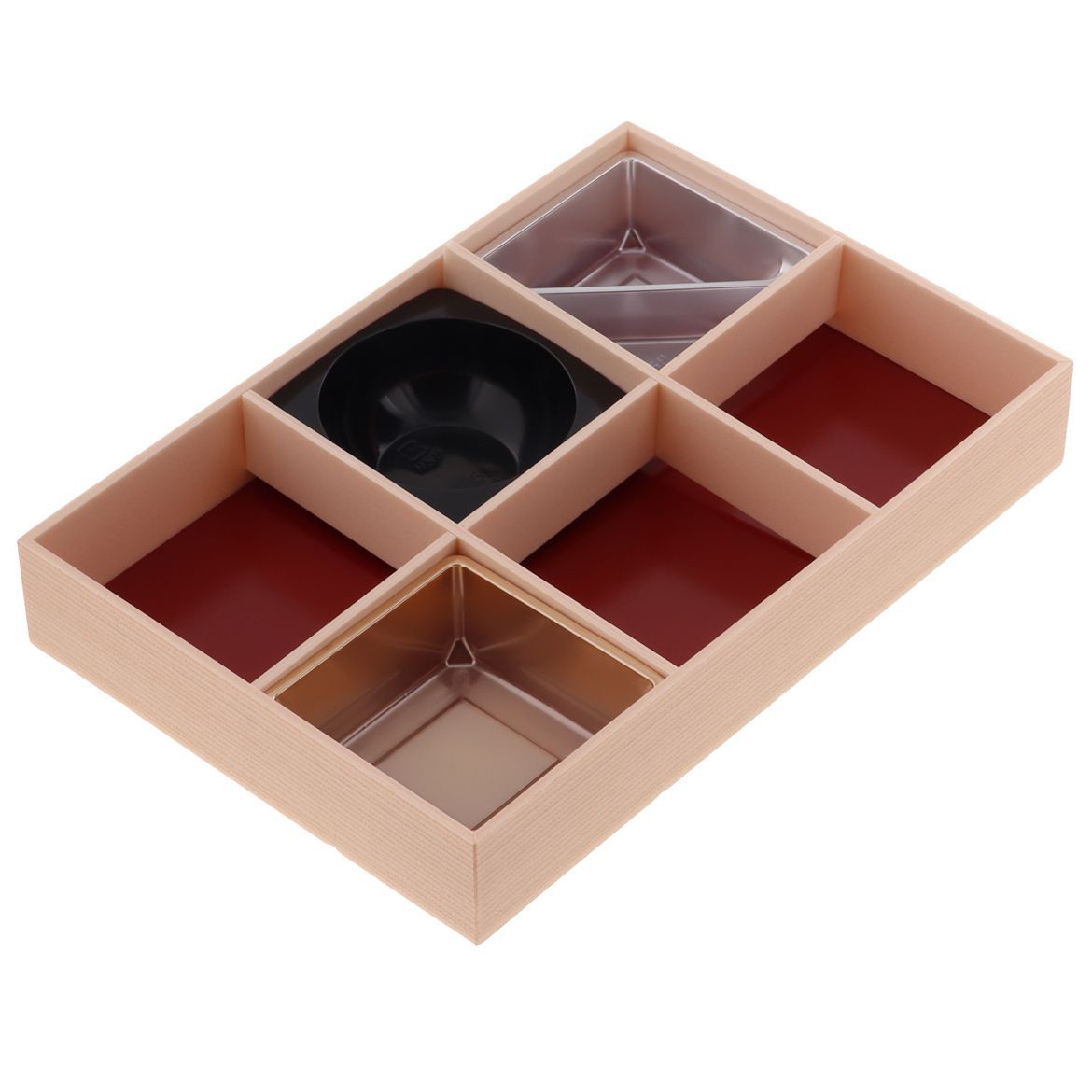 六分する仕切りが付いており、様々な種類の料理を入れたいときに適しています。和洋中何にでも合わせやすいデザインで大変人気の折箱です。仕切りは取り外し可能ですので、小鉢65を入れてお使いいただけます。汁物や汁もれしやすいおかずを入れる際には併せてご利用ください。