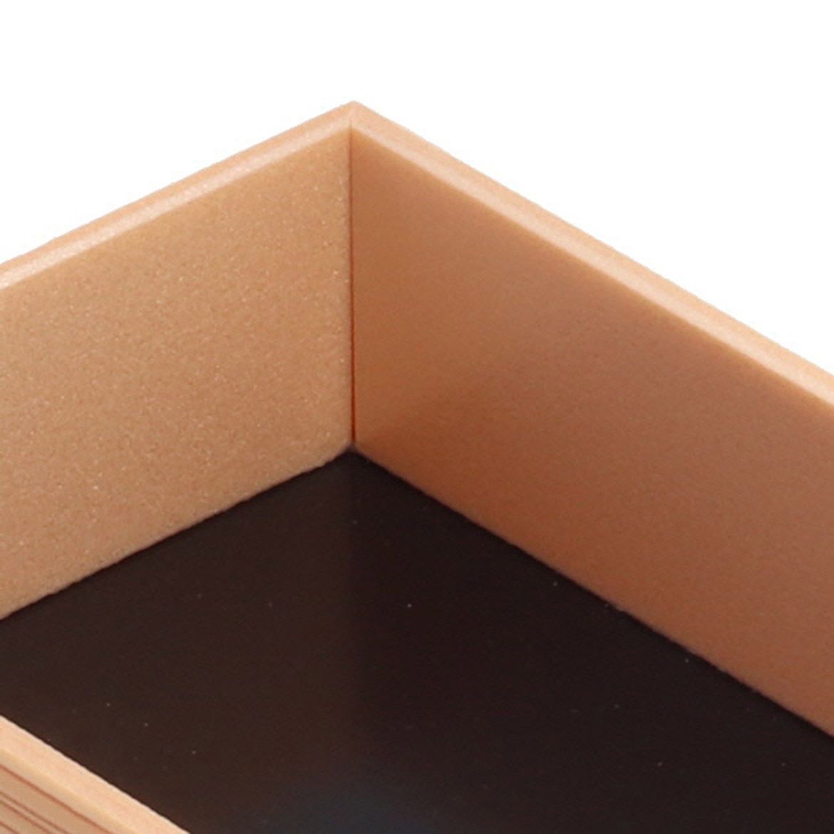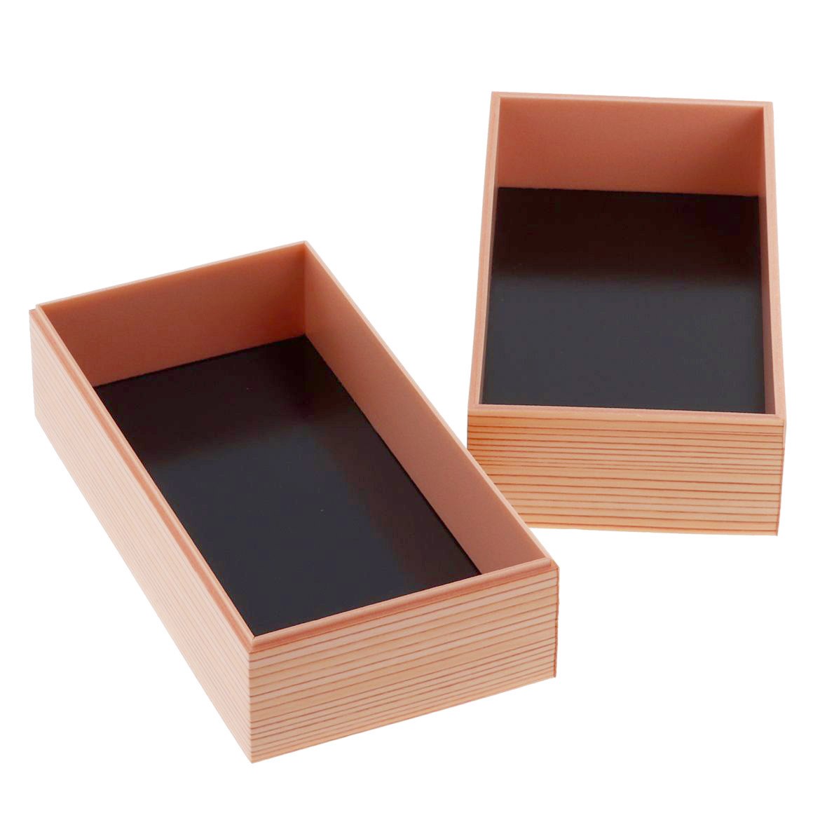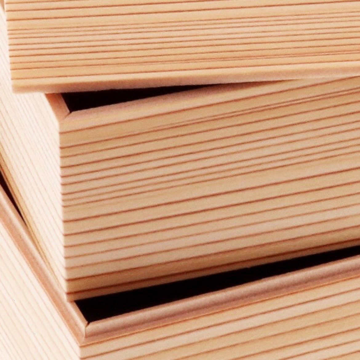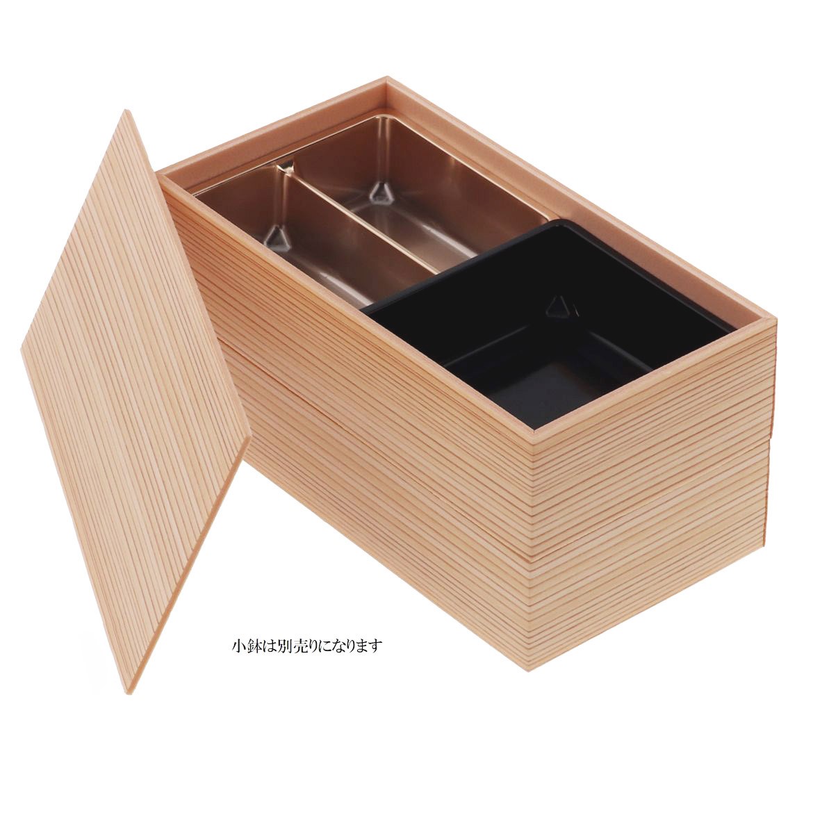 紙手提げにも入れやすい、二段の定番サイズ。落ち着いた木目の柄は、どのお料理にも合わせやすく大変おすすめです。小鉢70が計4個入りますので、汁物や汁もれしやすいおかずを入れる際には併せてご利用ください。