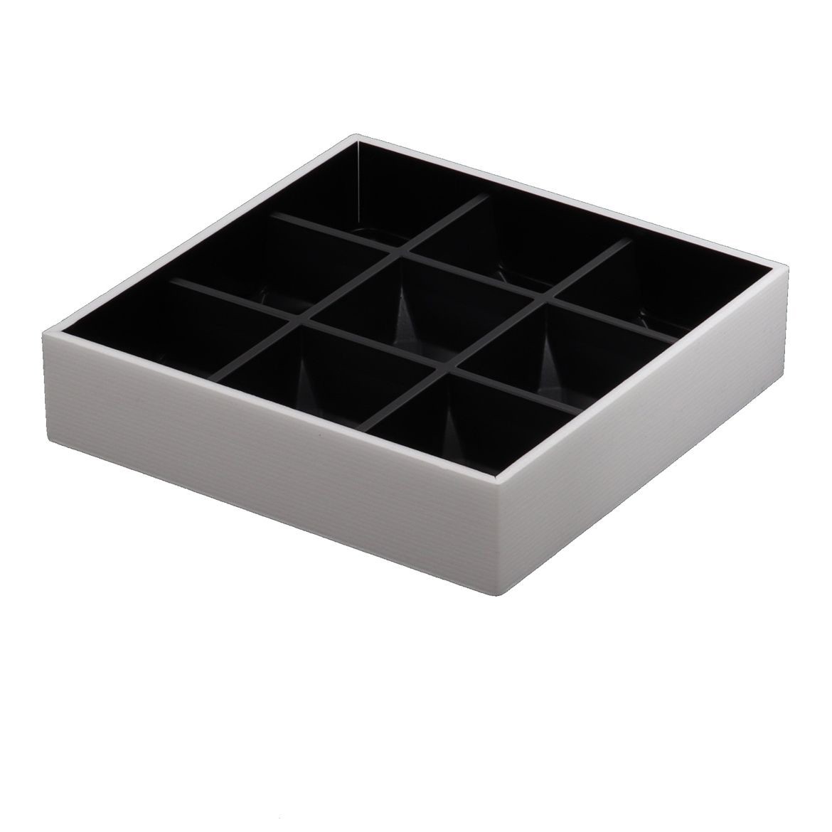 九分する井の字の仕切りが付いたトレーが内蔵されております。手毬寿司からオードブルなど一度に多くの種類を入れる際におすすめです。シンプルな外装のため、お好みの掛け紙や帯を合わせていただきやすい仕様になっています。
