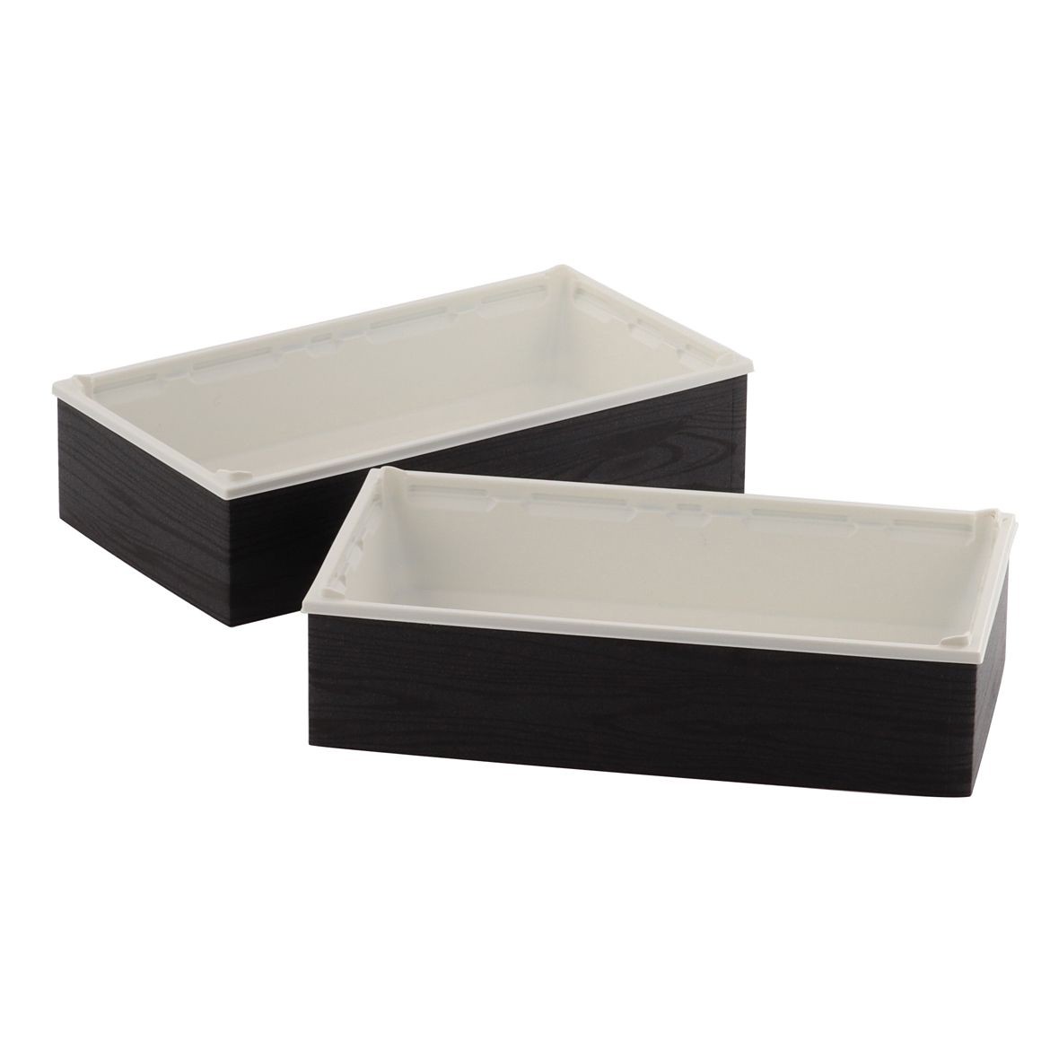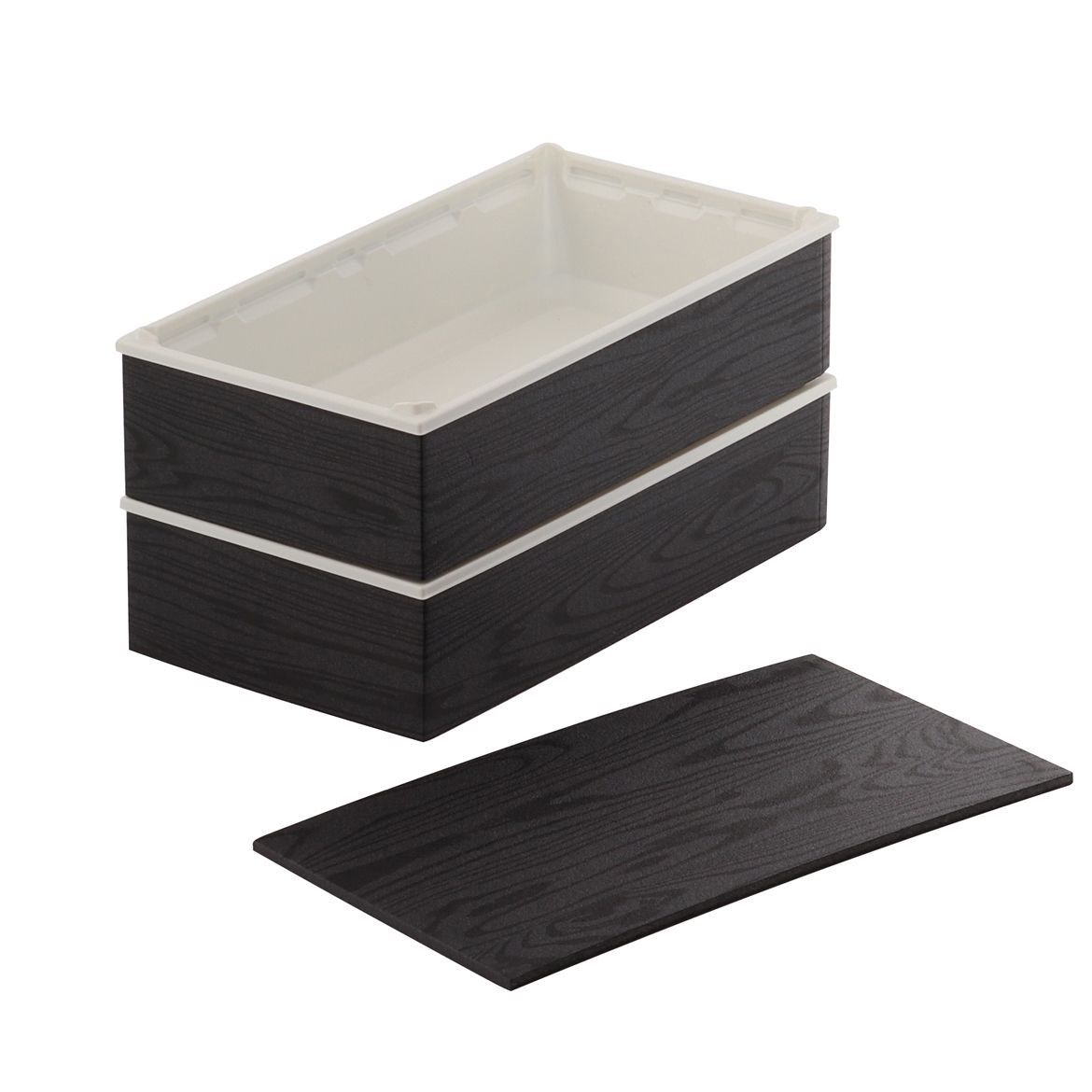 トレーは内蔵されており、タレや汁が漏れにくい形状です。高級感のあるシックな外装で、1段・2段と選べます。組み立て式のため在庫場所も抑えられ、おすすめです。