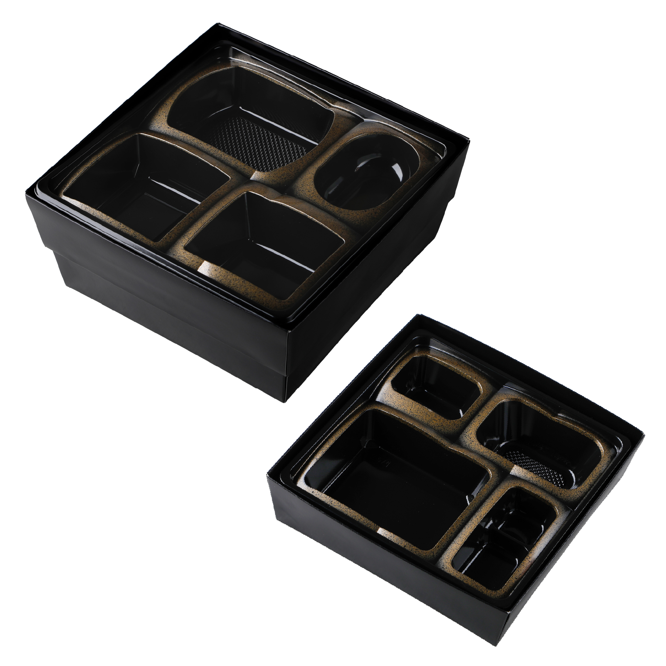足付で高級感のある紙ボックスタイプの二段弁当です。本体の模様にはエンボス調の凹凸が特徴です。