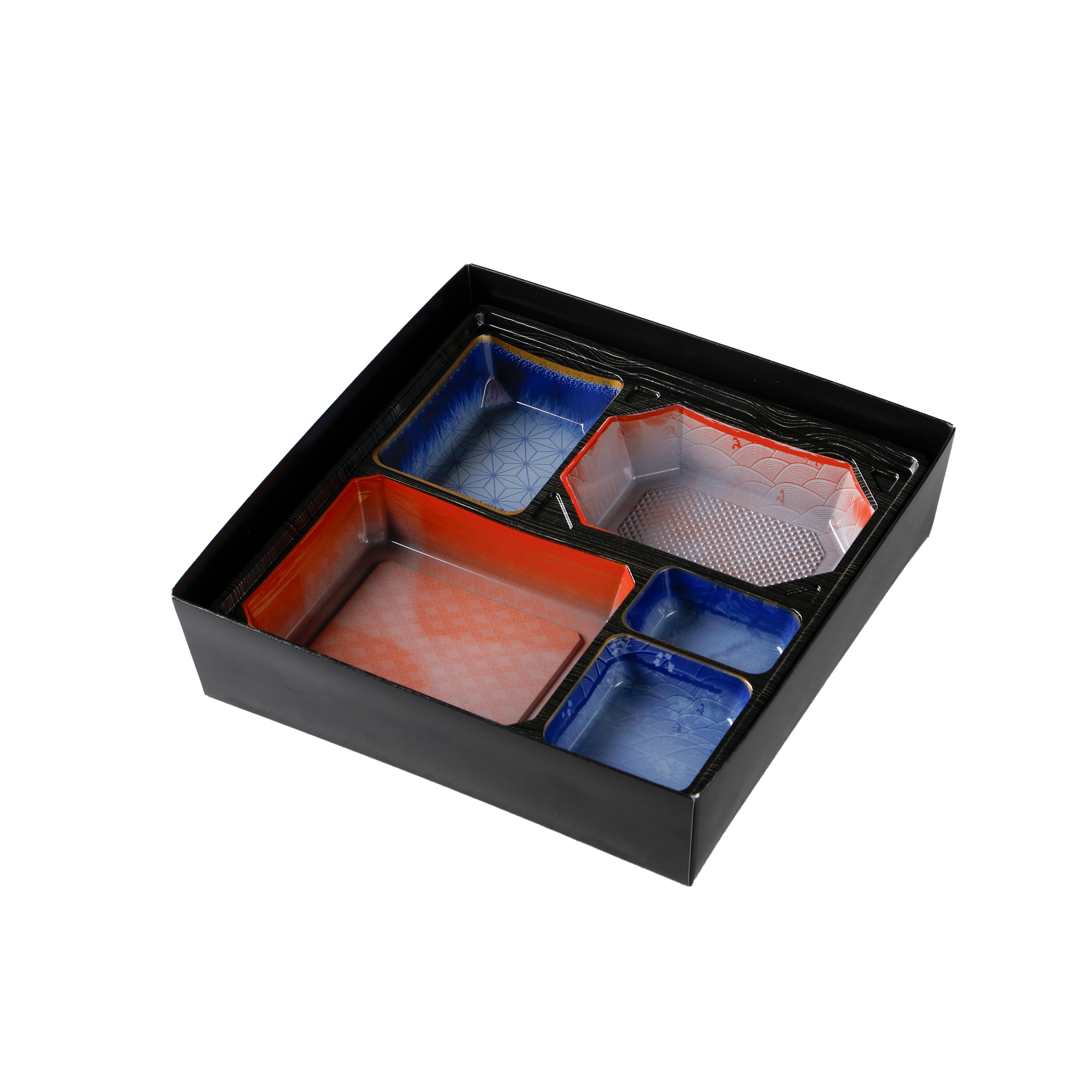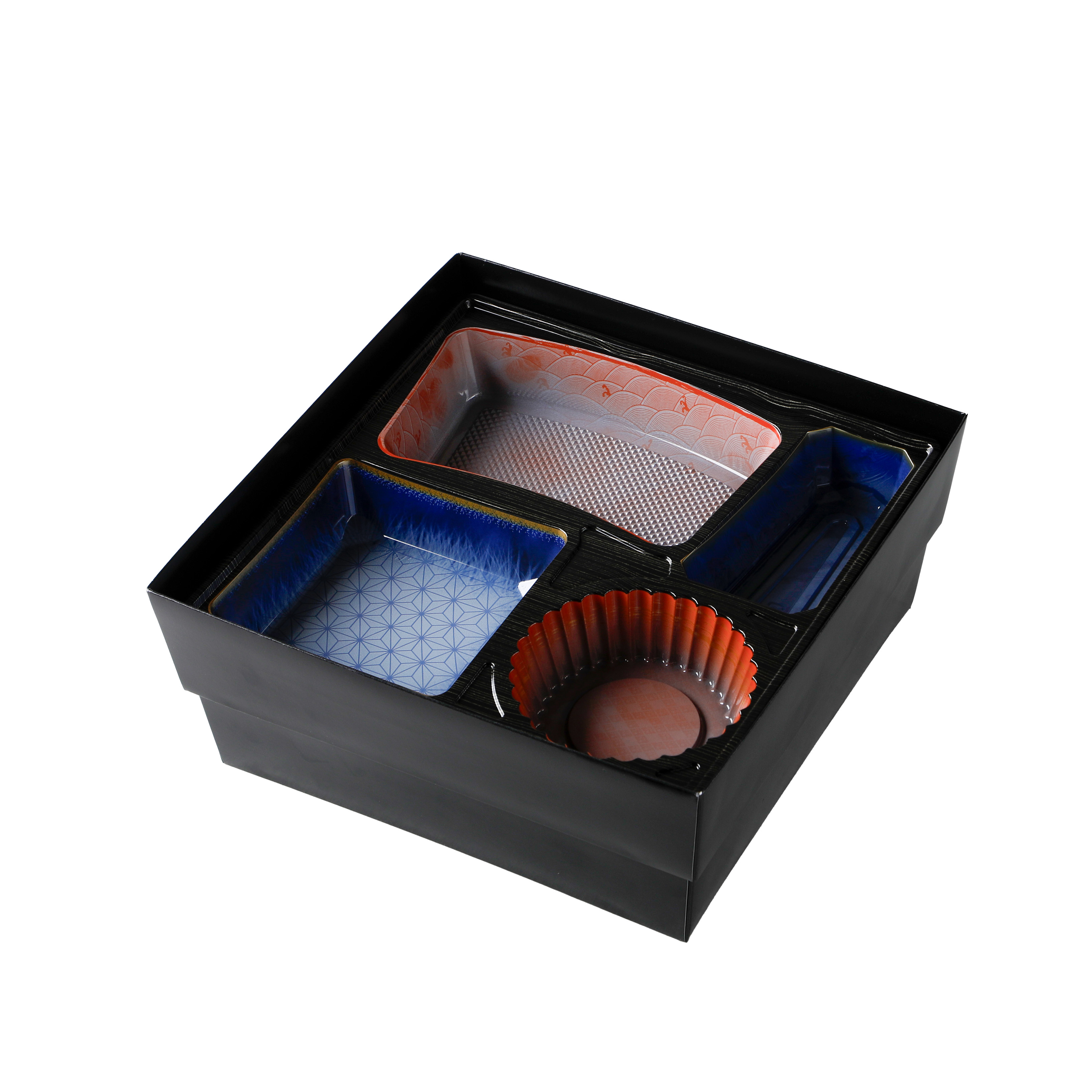 足付で高級感のある紙ボックスタイプの二段弁当です。本体の模様にはエンボス調の凹凸が特徴です。