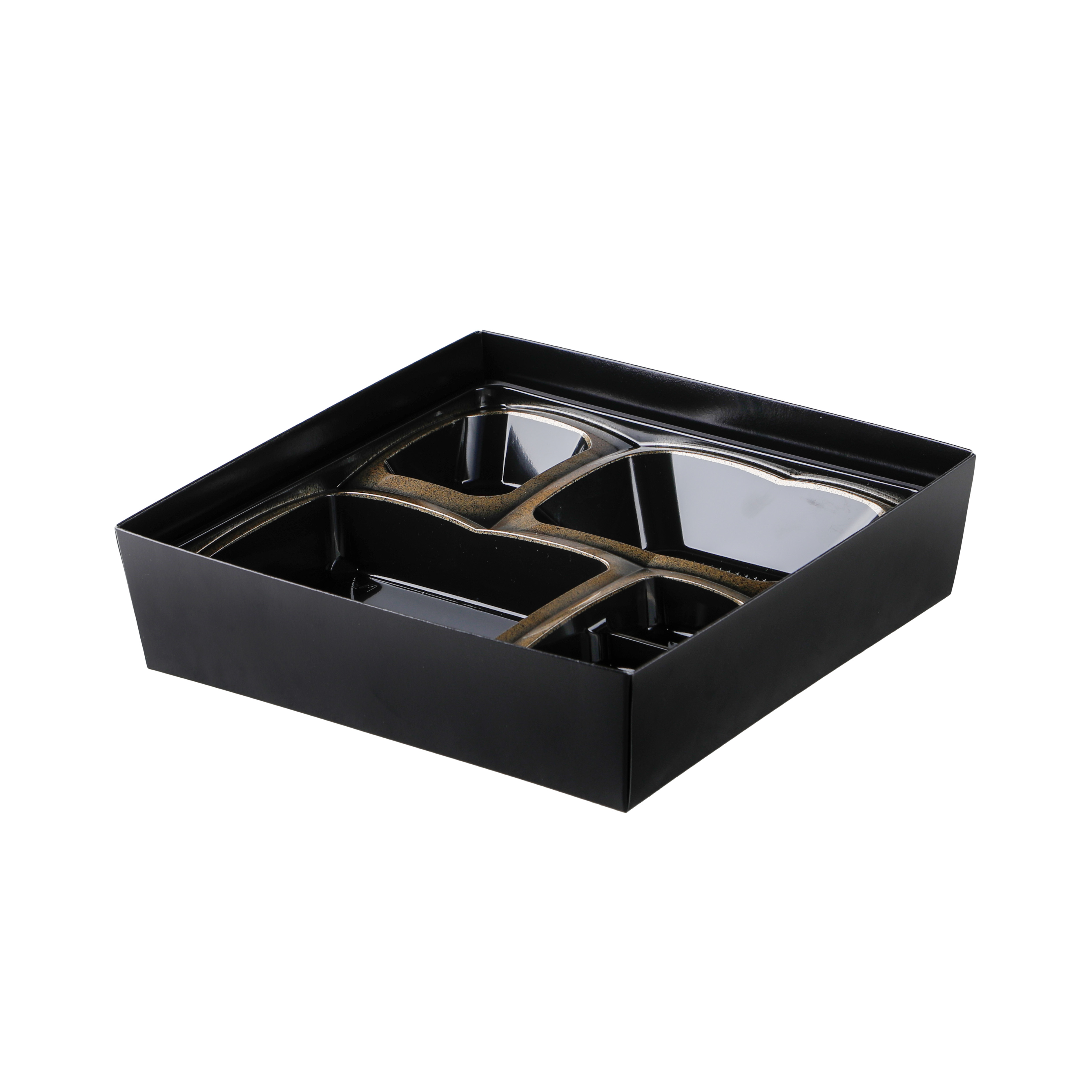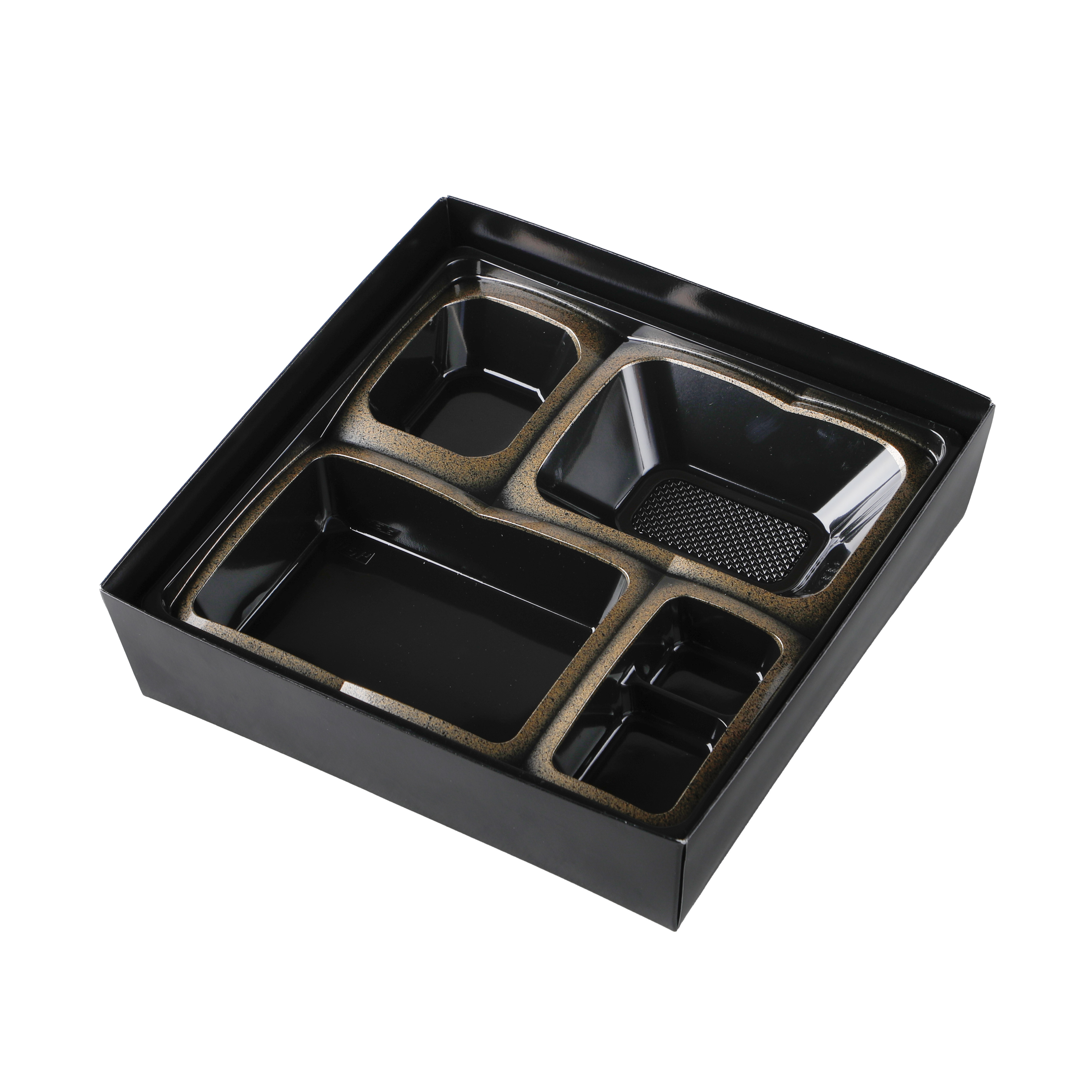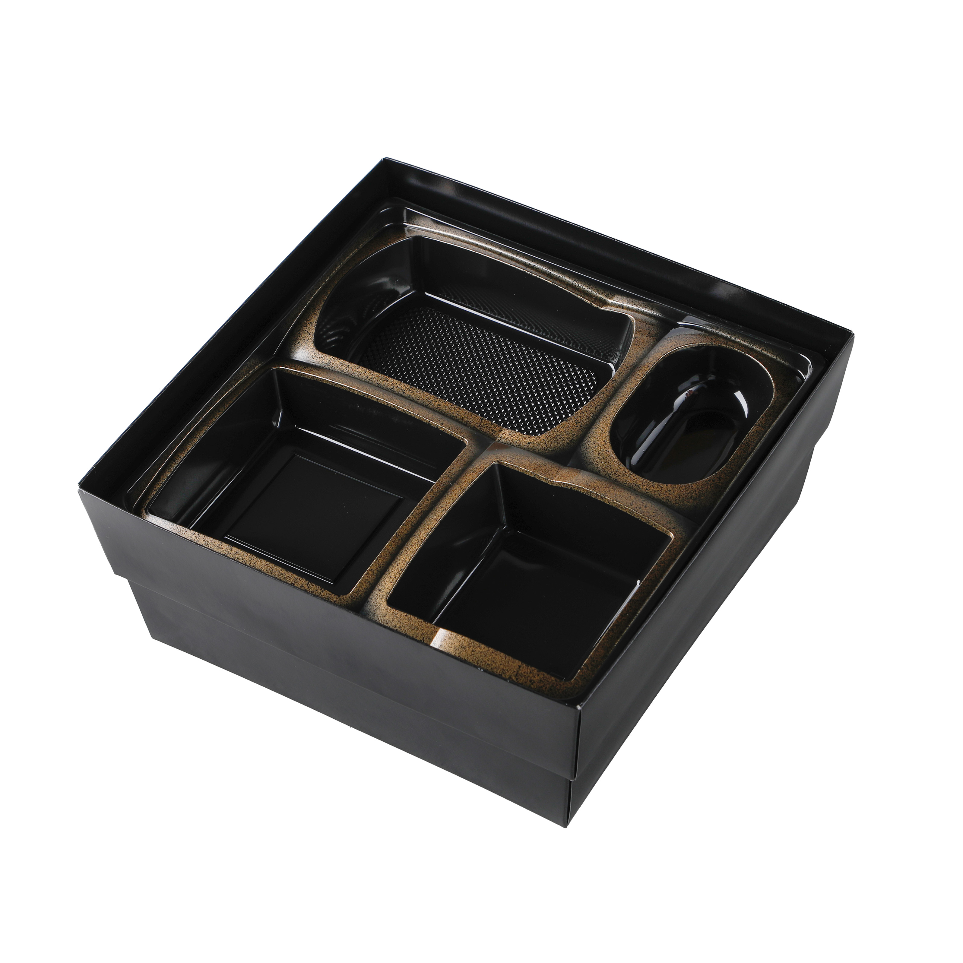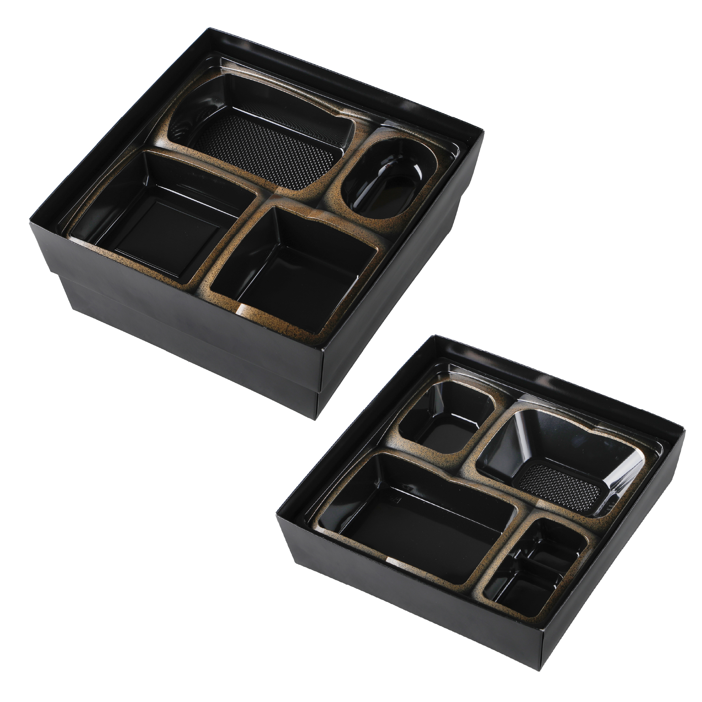 足付で高級感のある紙ボックスタイプの二段弁当です。本体の模様にはエンボス調の凹凸が特徴です。