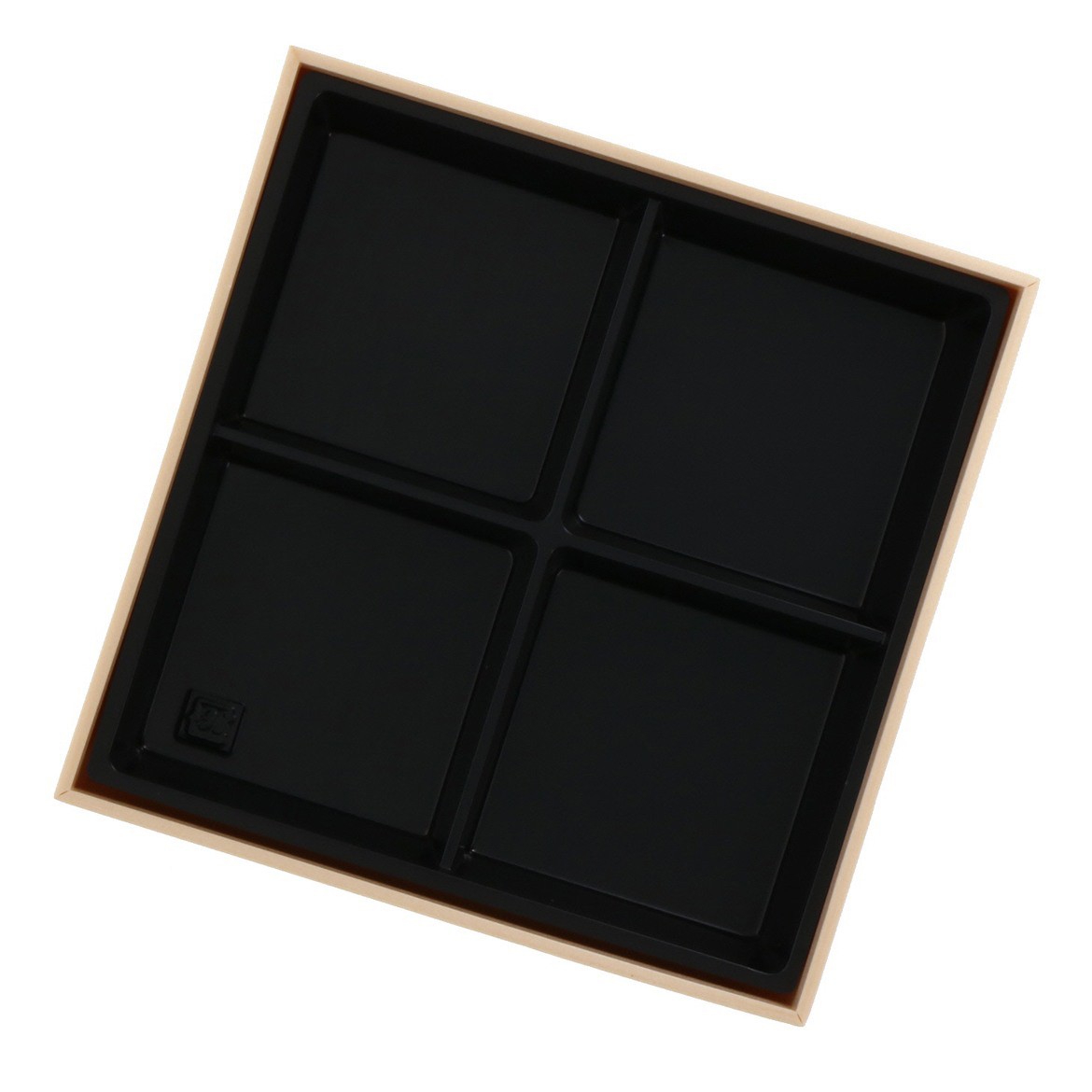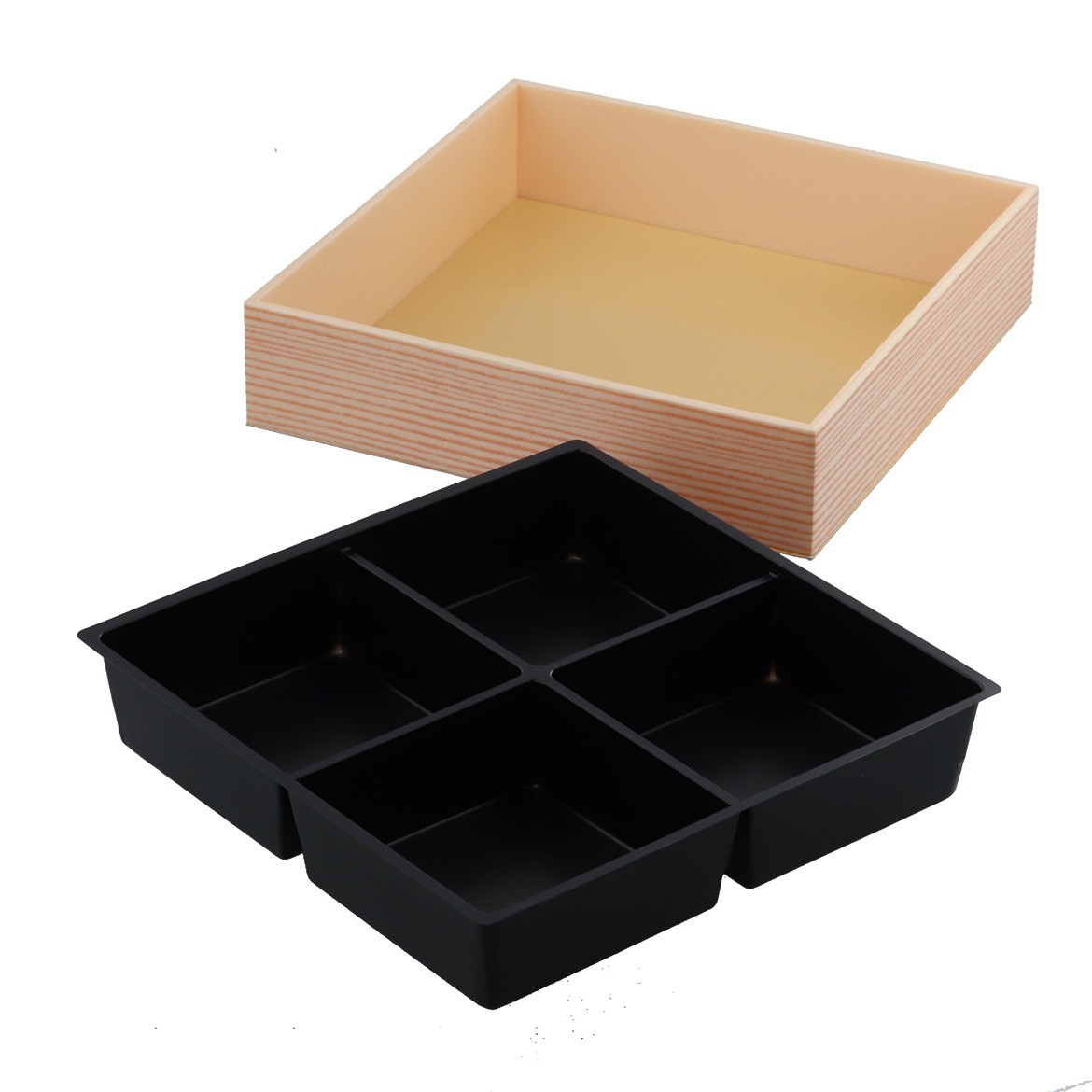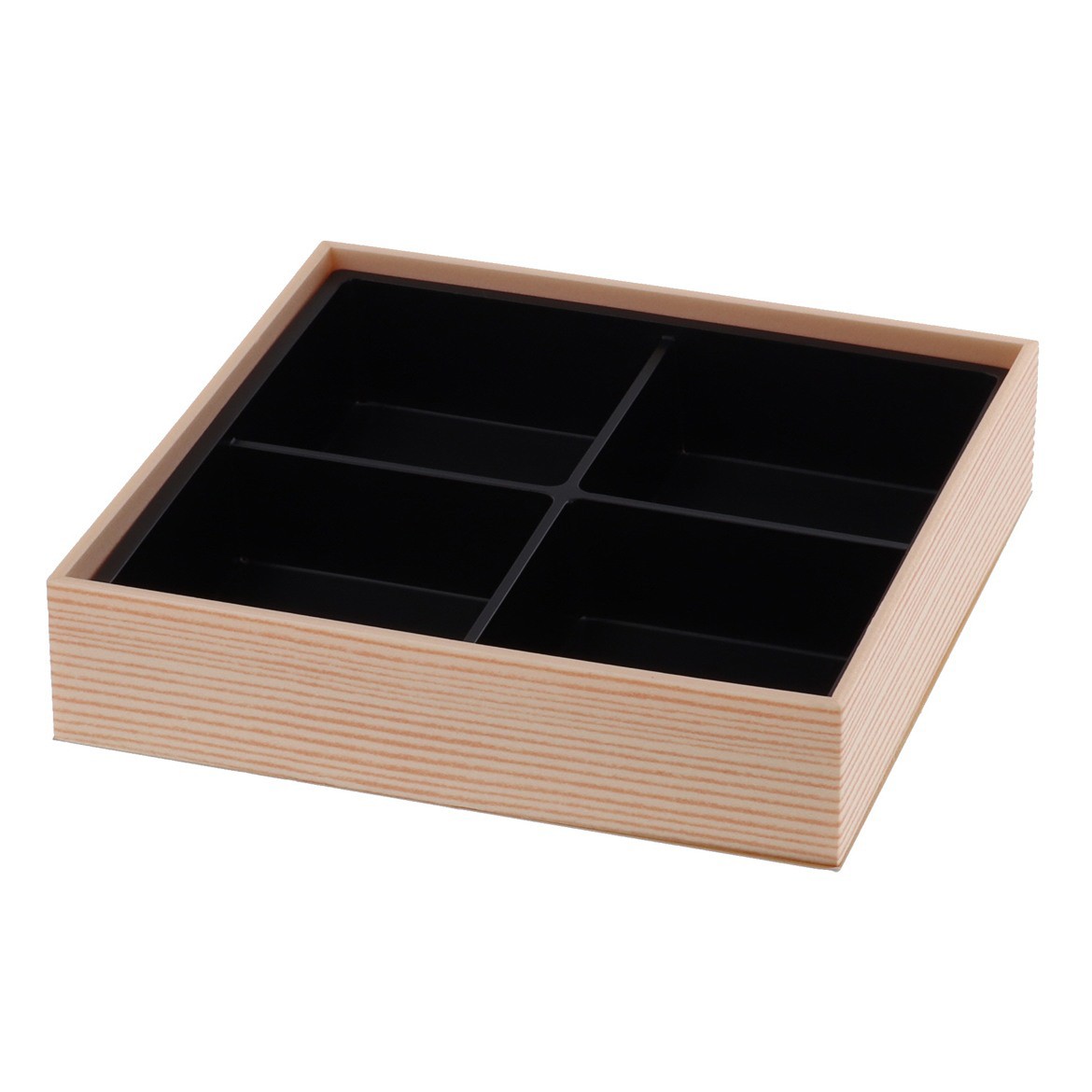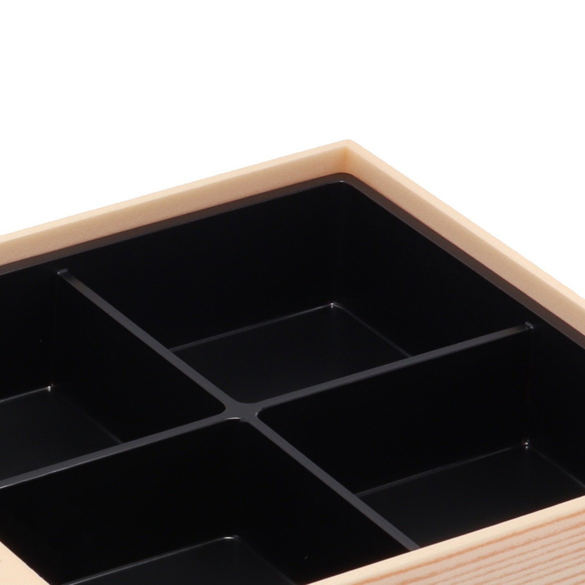 四分する十字の仕切りが付いたトレーは内蔵されており、タレや汁が漏れにくい形状です。