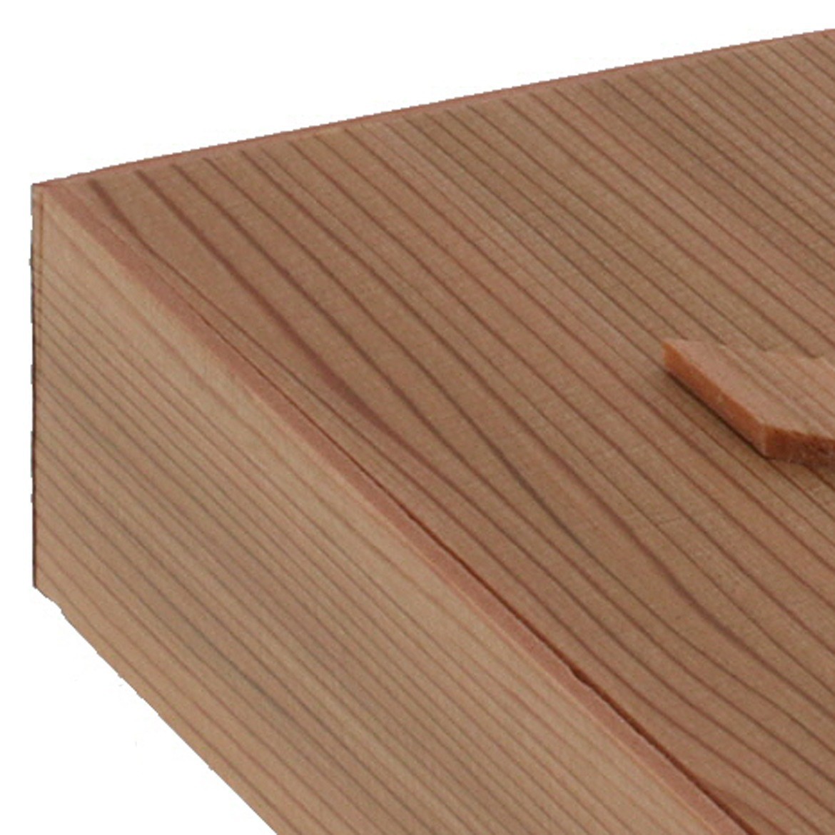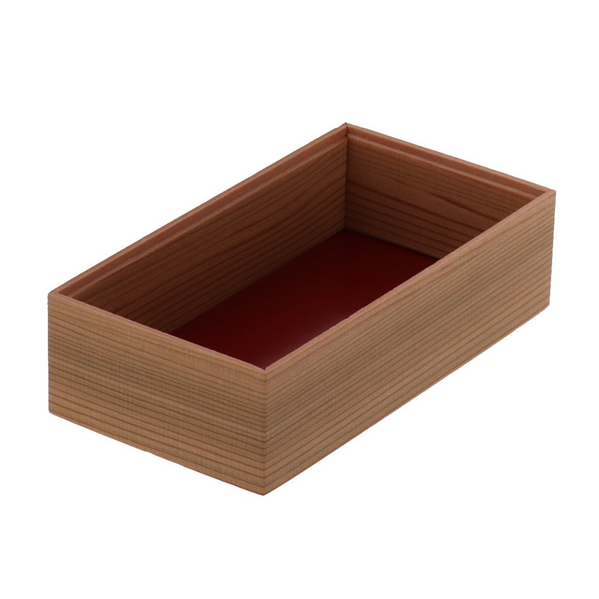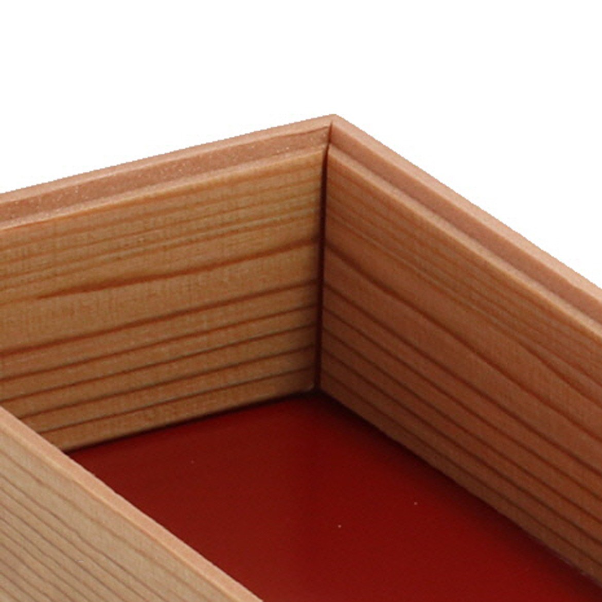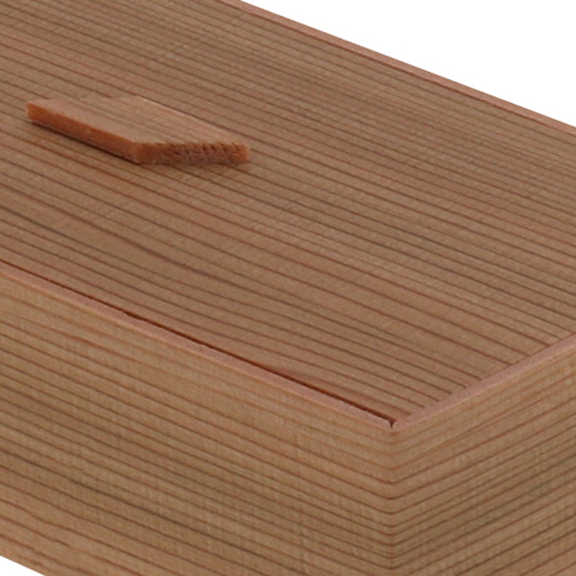 バラちらし用に制作された折です。四角形の取手部分が個性的な、温かみのあるデザイン。少量のお弁当や炊き込みご飯に最適な、使いやすいサイズが大変好評です。多聞杉のリアルな木目模様は光沢のないマットフィルムを使用しているため、本物により近い高級感のある質感に仕上がっています。
