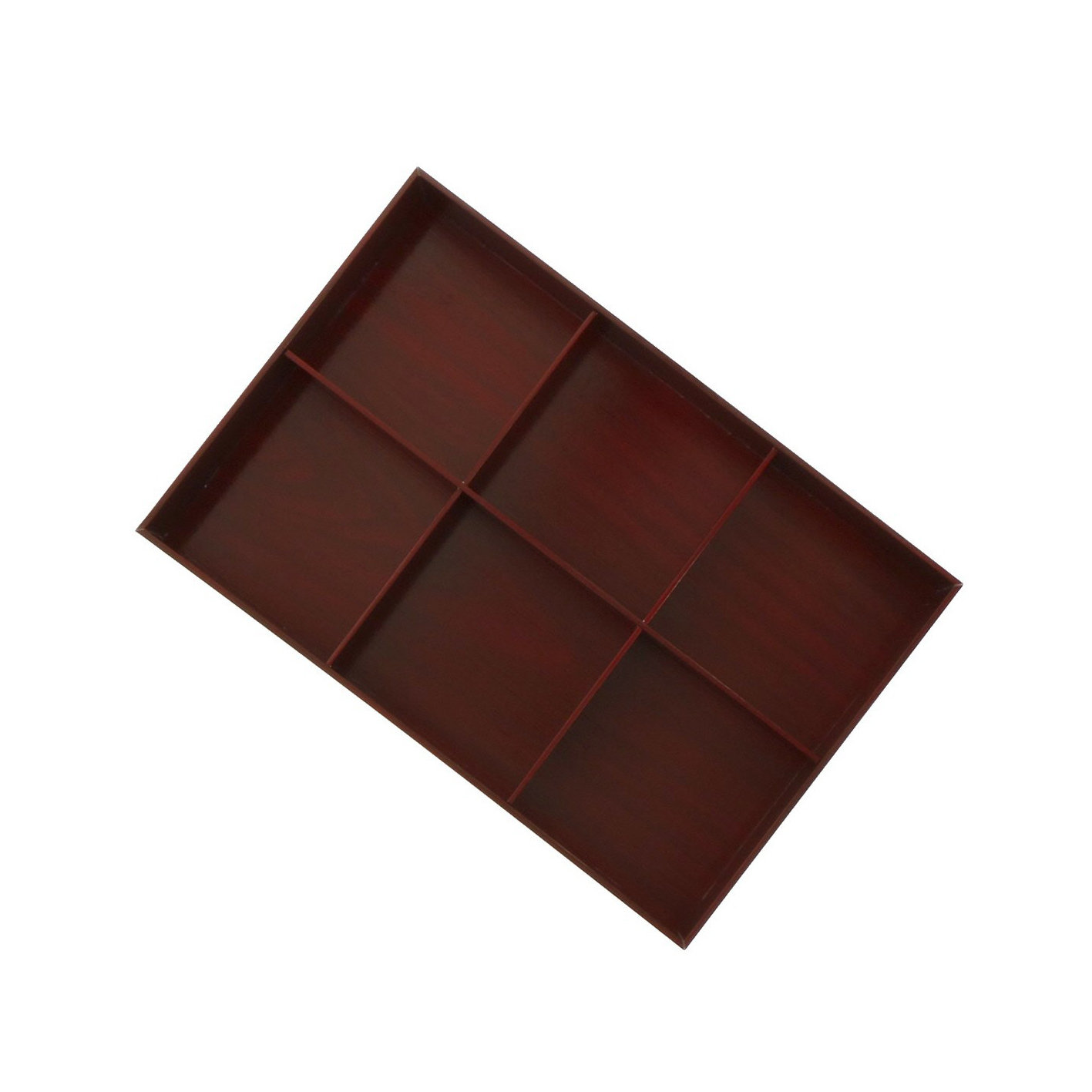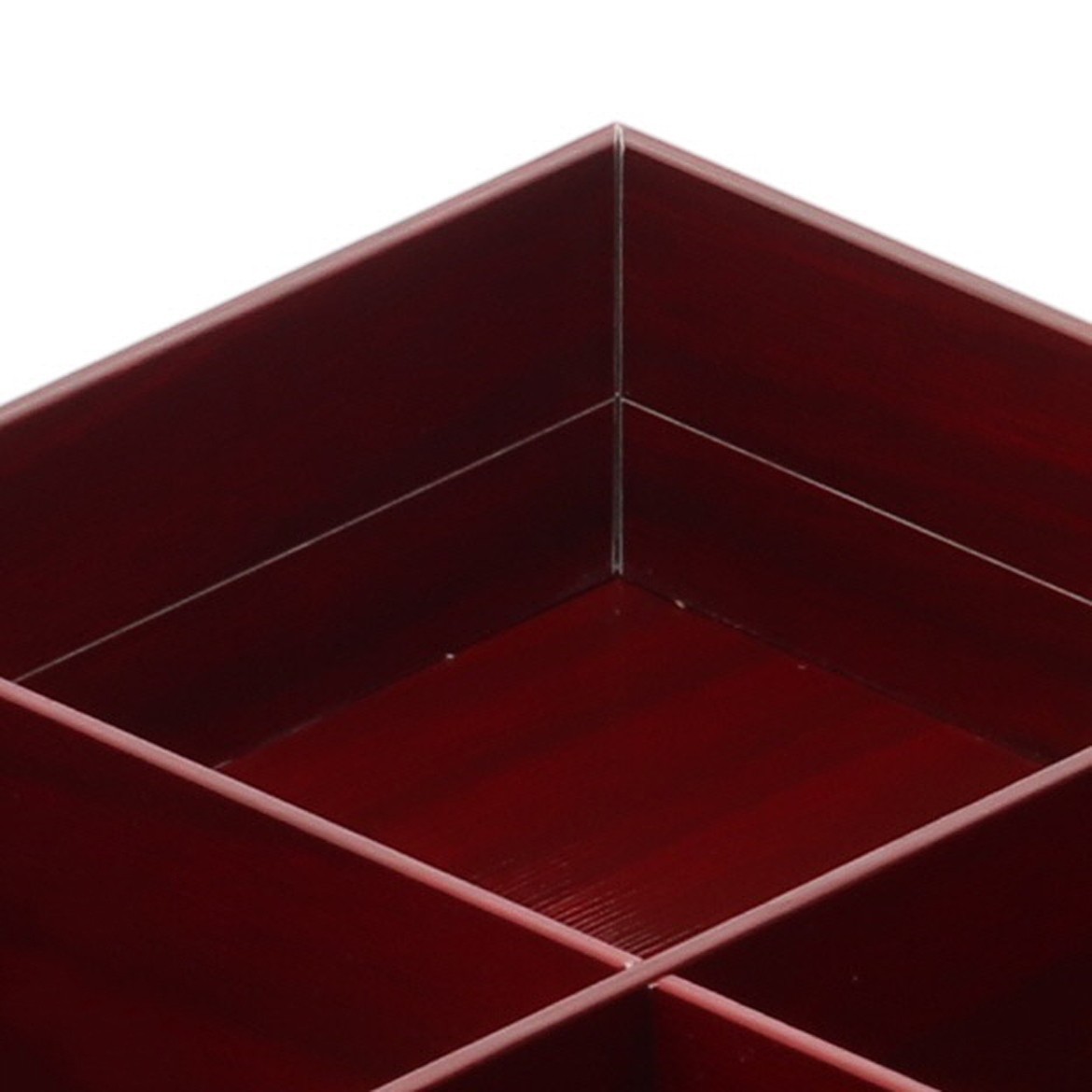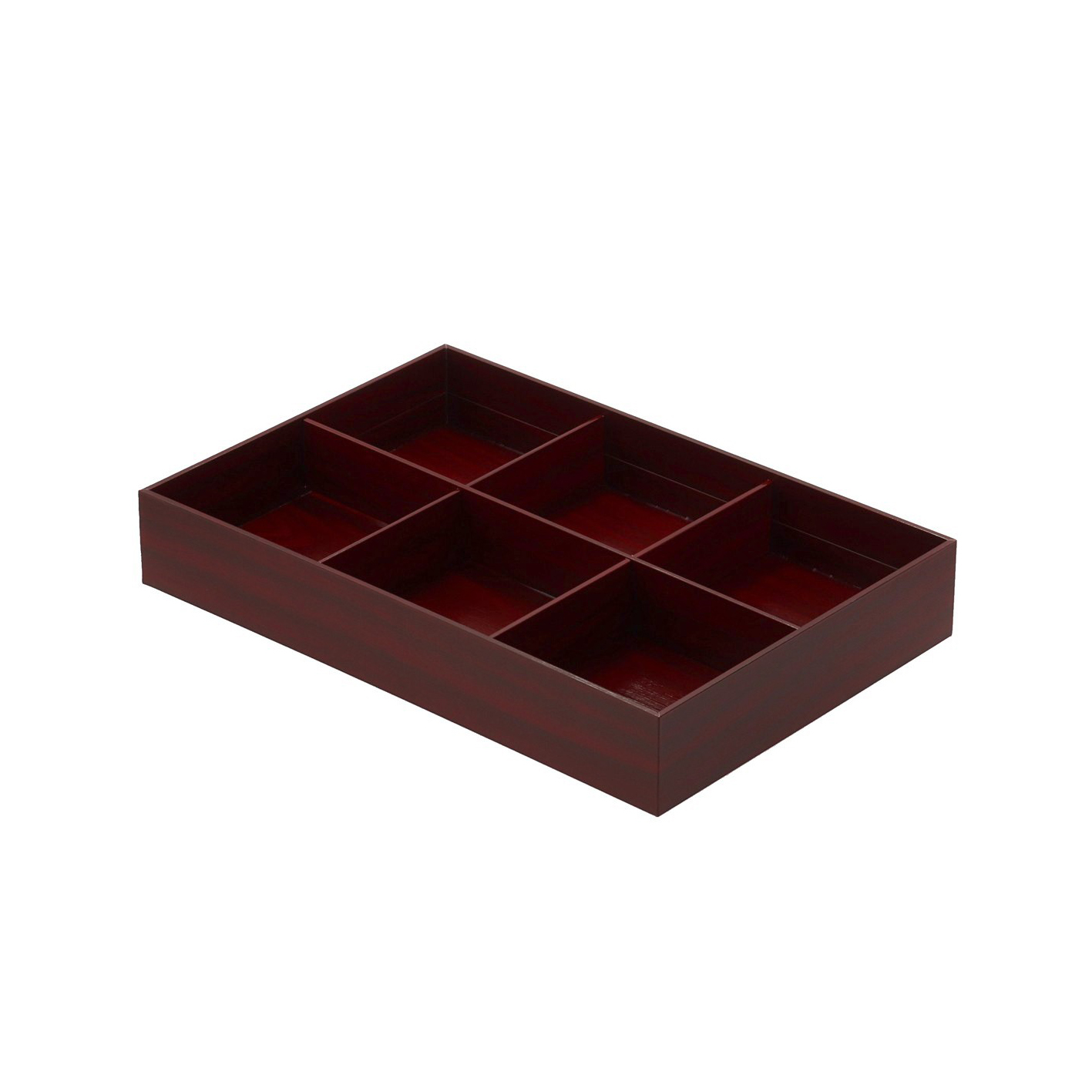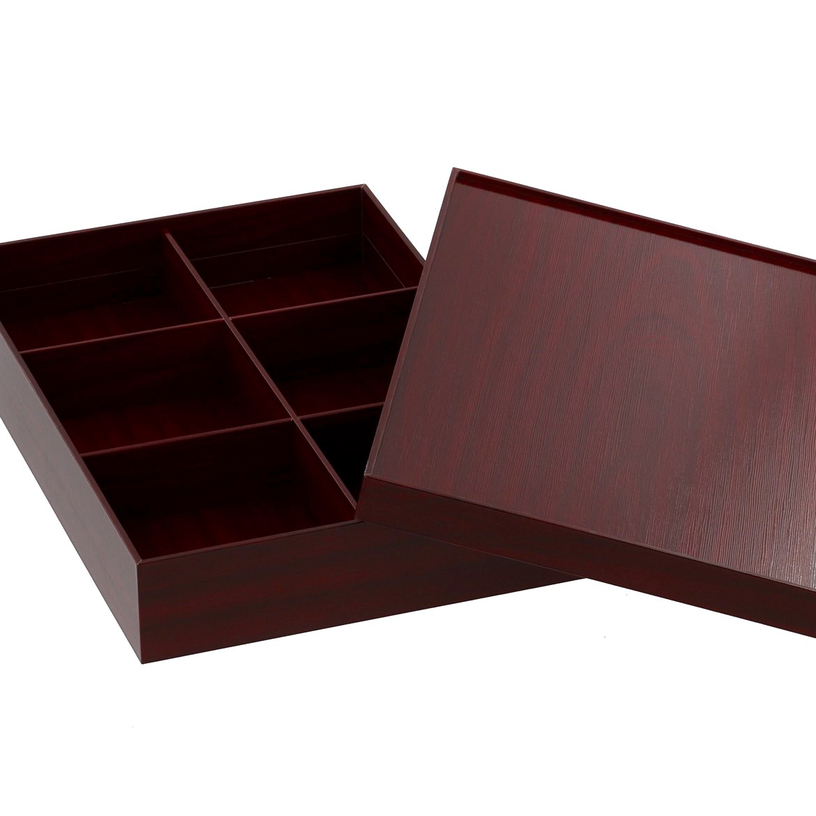 六分する仕切りが内蔵されている、お弁当にオススメの折箱。赤漆は品もあり、更に70サイズの紙皿を合せることで盛り付けやすく、料理も一層華やかになります。5000円以上のお弁当にも十分対応できるボリュームです。