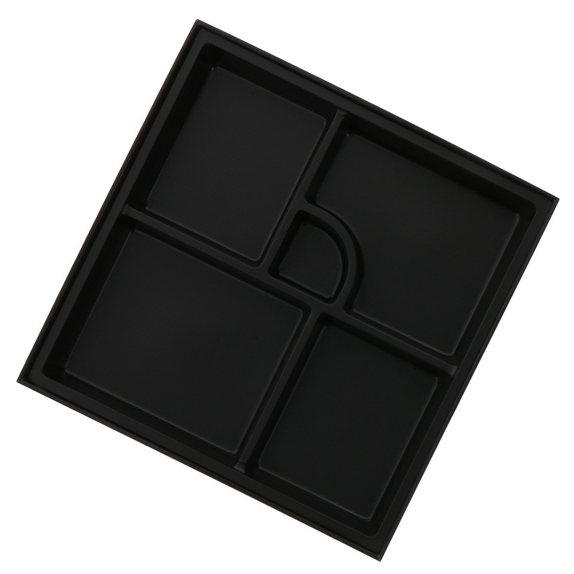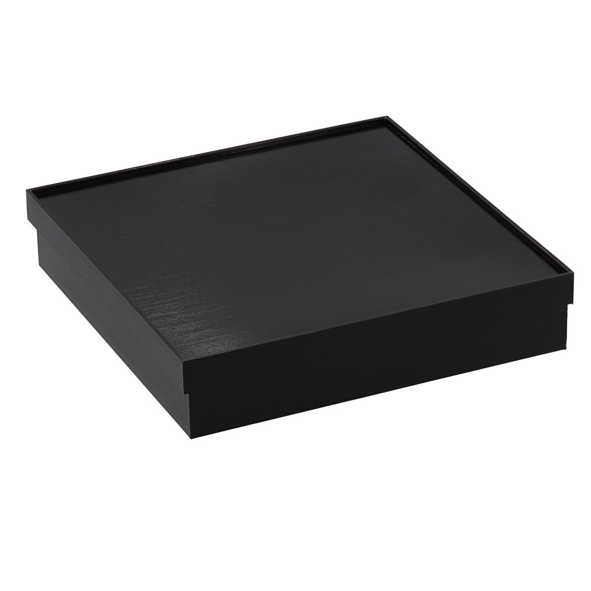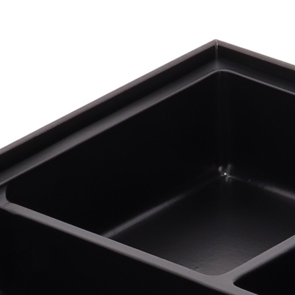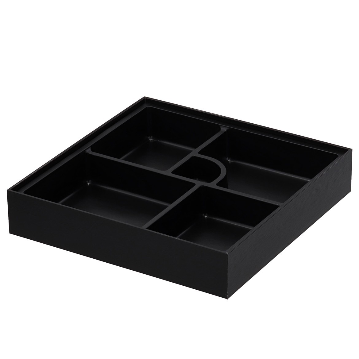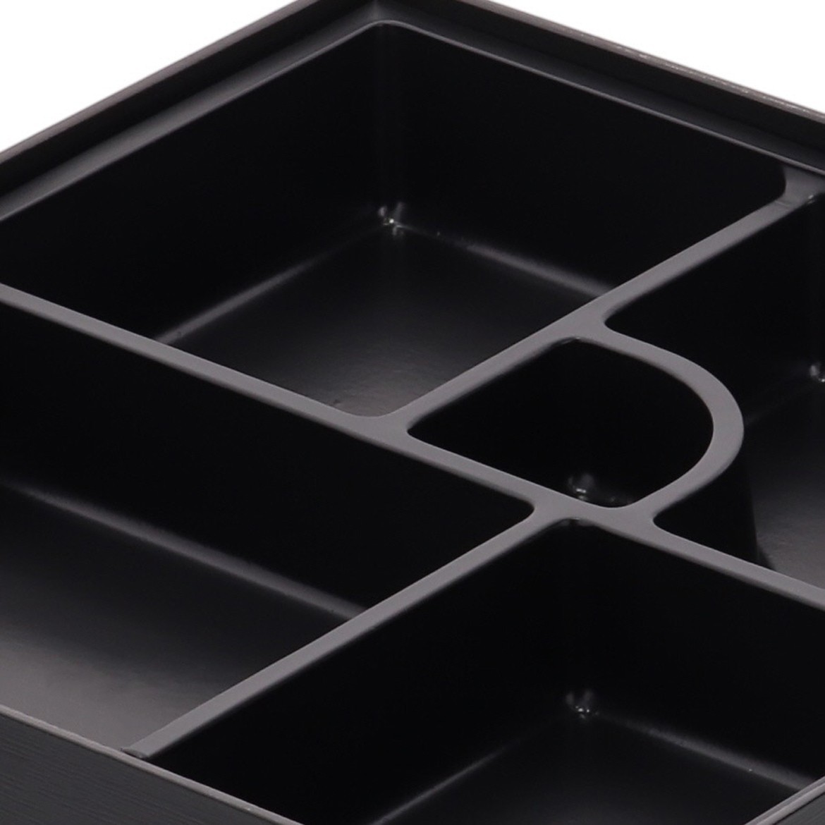 しっかりとした造りで、松花堂弁当では定番サイズの折箱。五分された仕切りが内蔵されており、マスの大きさも様々なため、お料理の盛り付けもしやすいです。