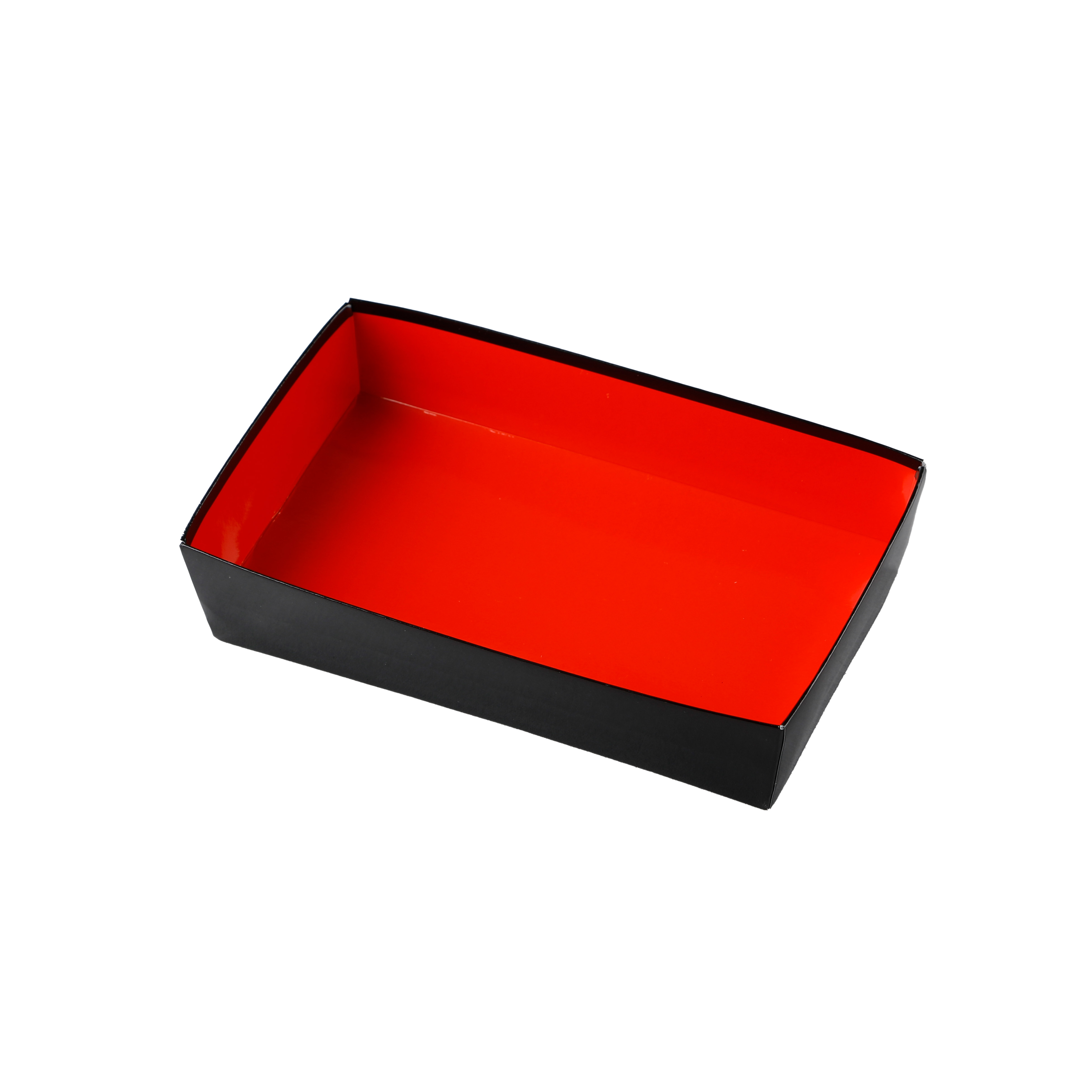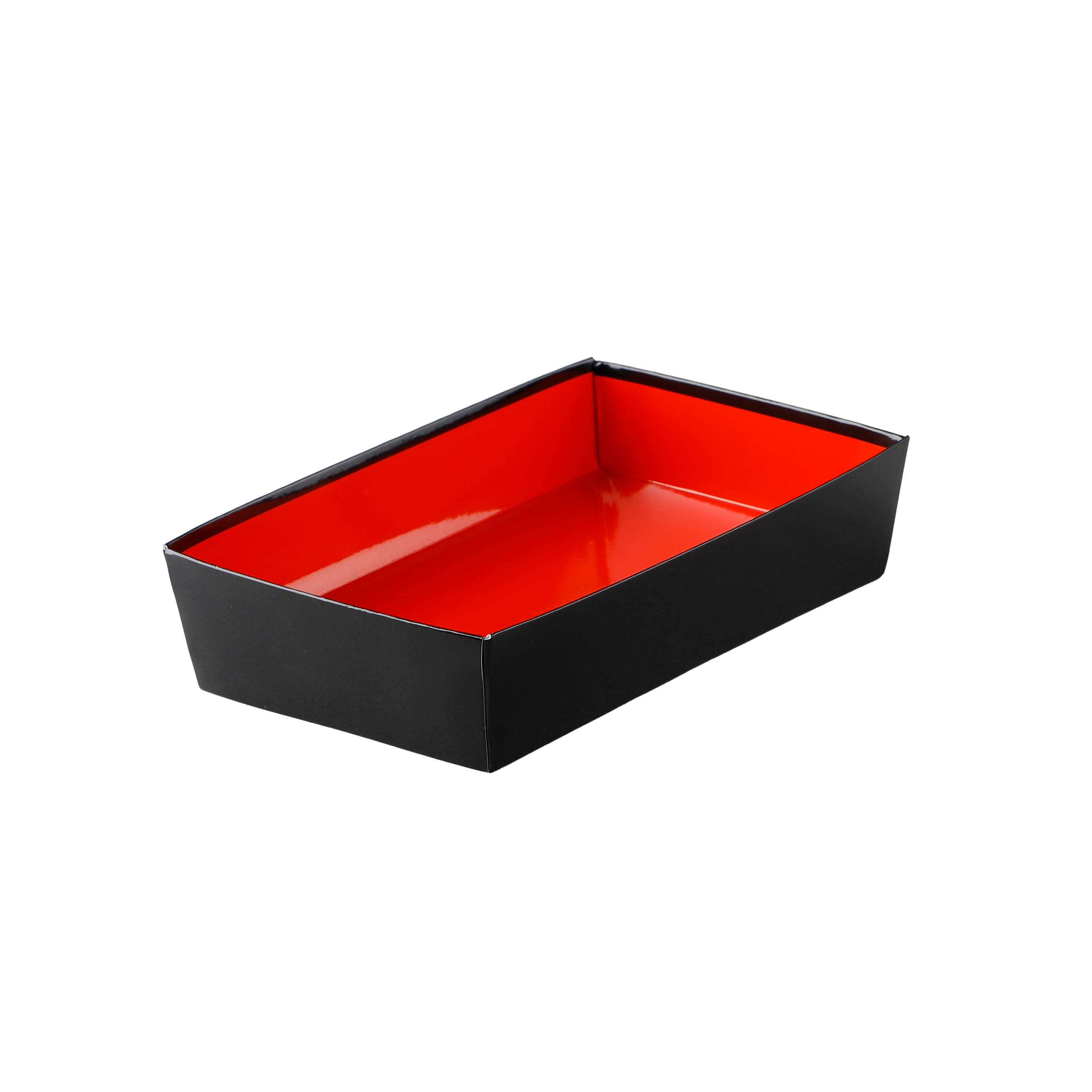 足付で高級感のある紙ボックスタイプの一段弁当です。中が朱色、外側は黒色なのが特徴です。
