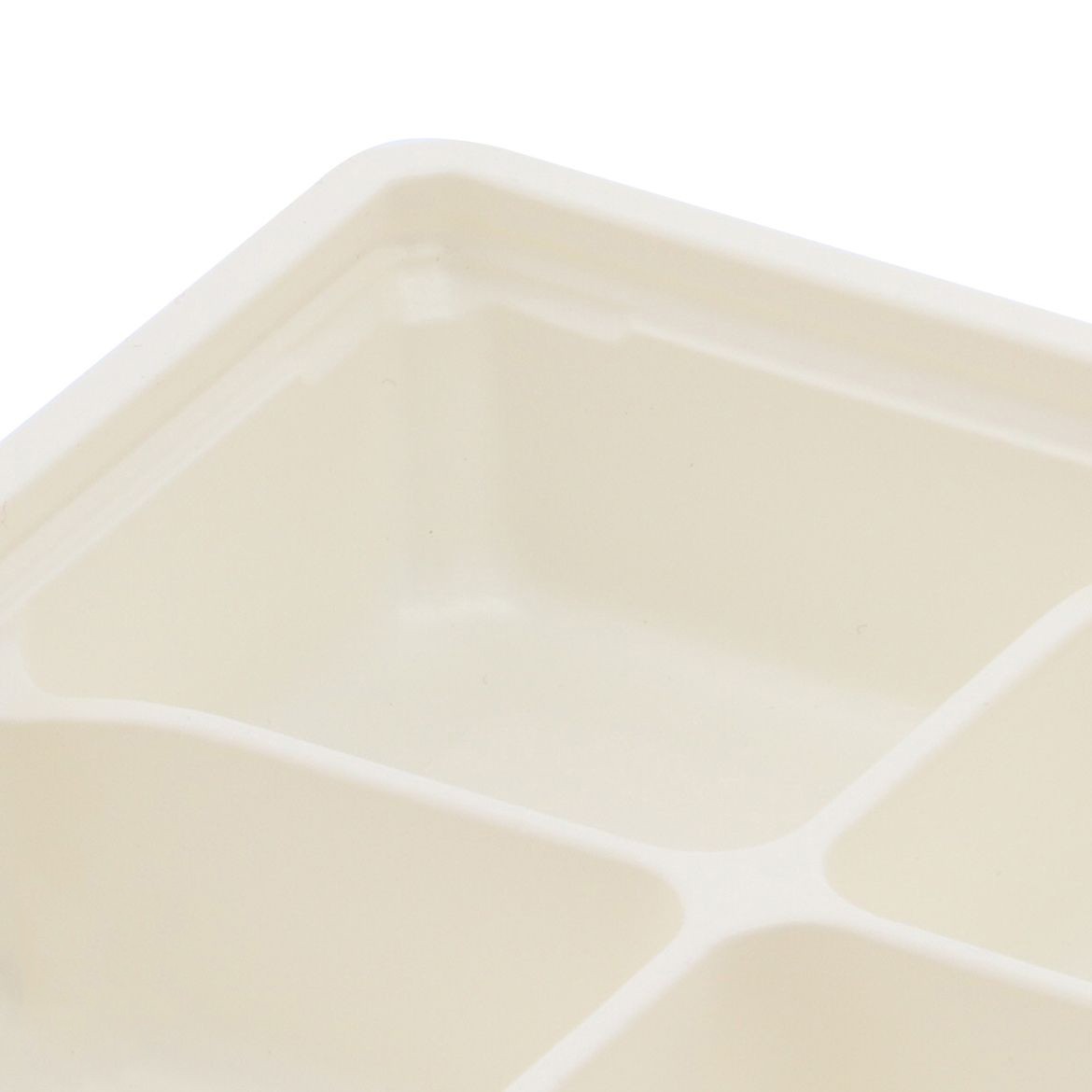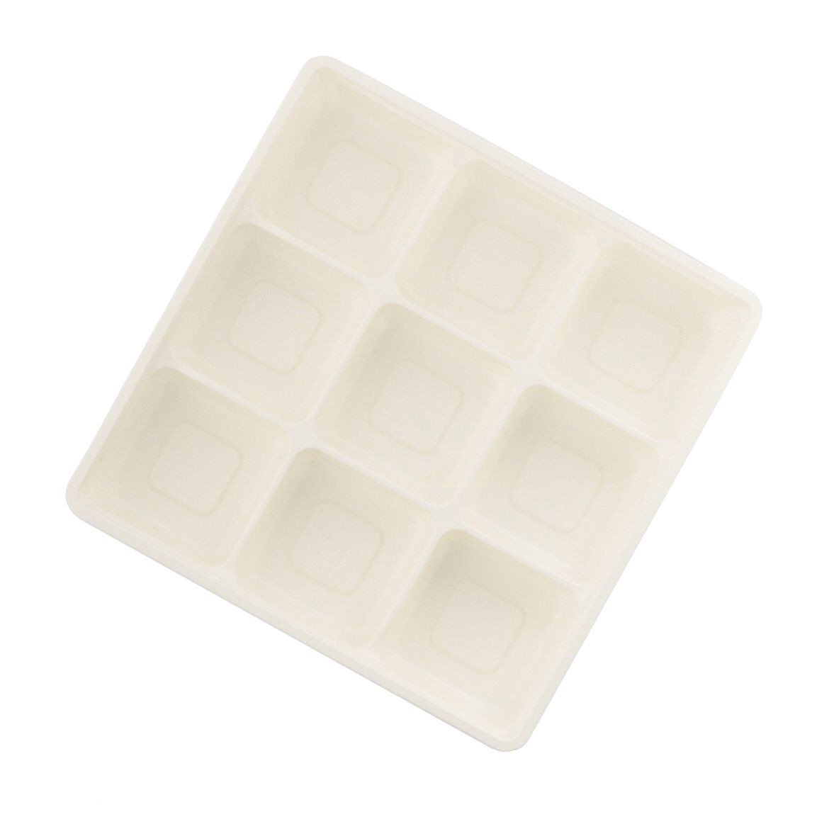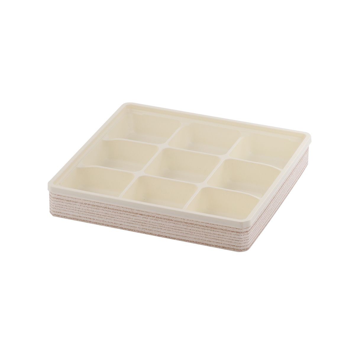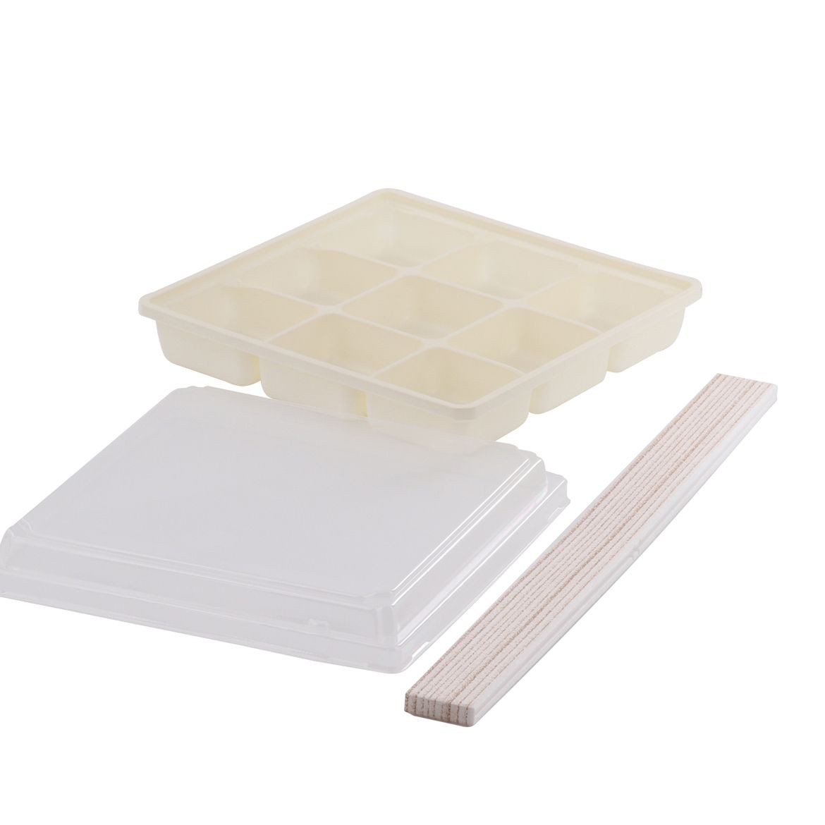 九分する井の字の仕切りが付いたトレーは内蔵されており、タレや汁が漏れにくい形状です。シンプルな外装のため洋風料理のオードブルやてまり寿司など一度に多くの種類を入れる際におすすめです。透明蓋で中身が見えますので陳列販売にも最適です。また組み立て式のため在庫場所も抑えられます。