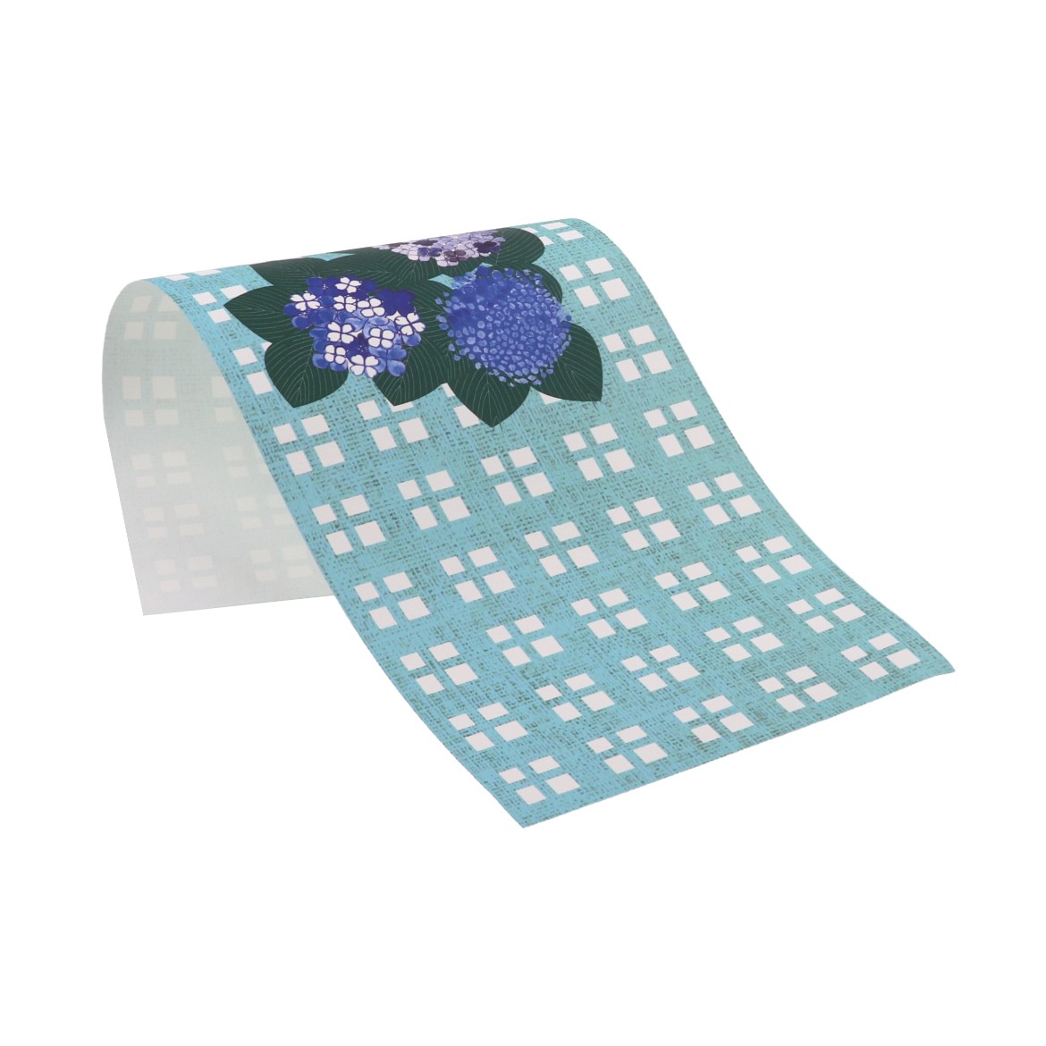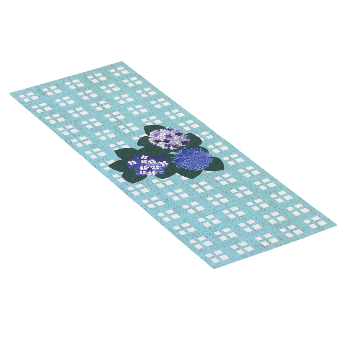 3種の紫陽花が咲き揃い、背景の格子模様と重なって、可憐さの中にどこかポップな印象を添えます。