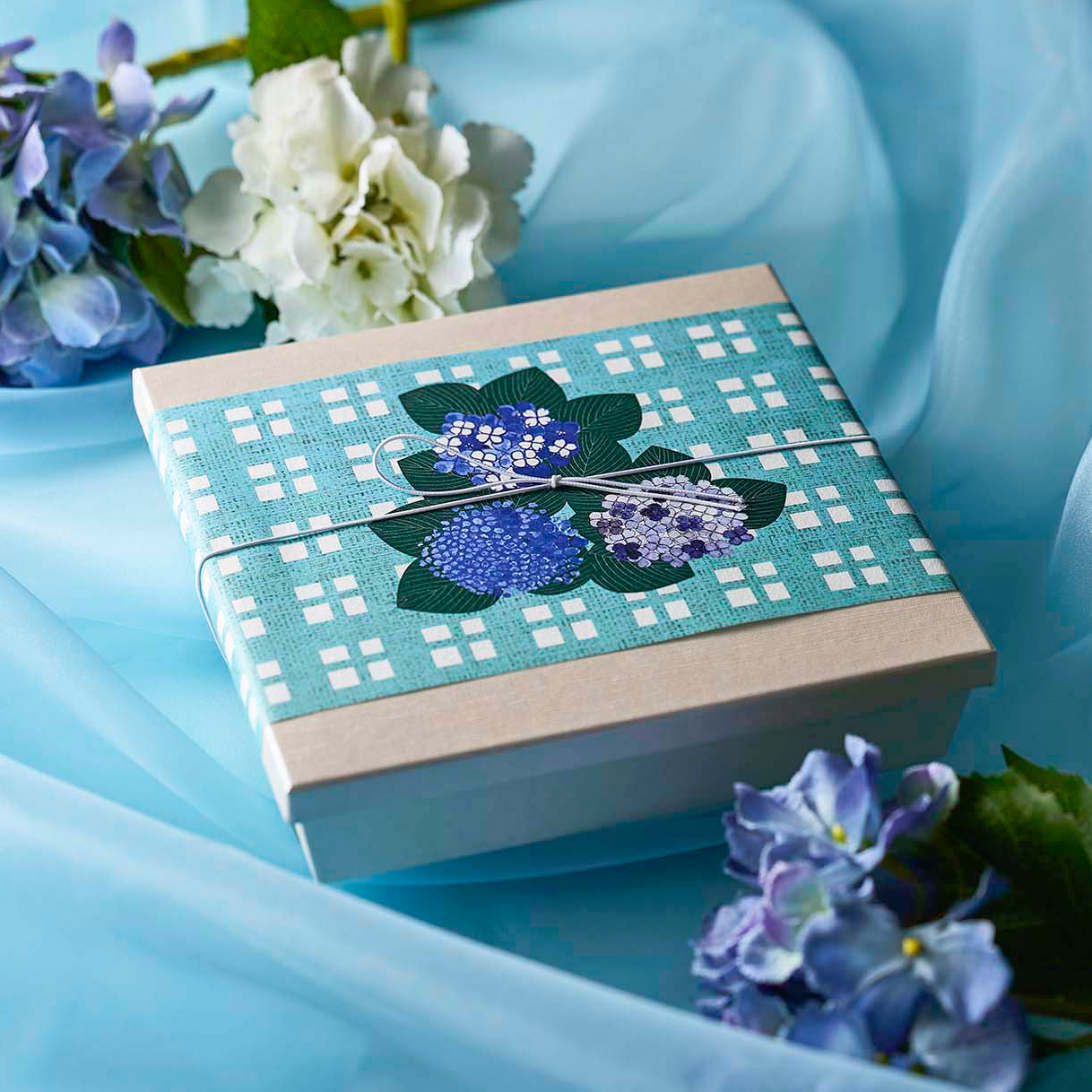 涼やかで上品な紫陽花と、格子柄が織りなす和の趣。
